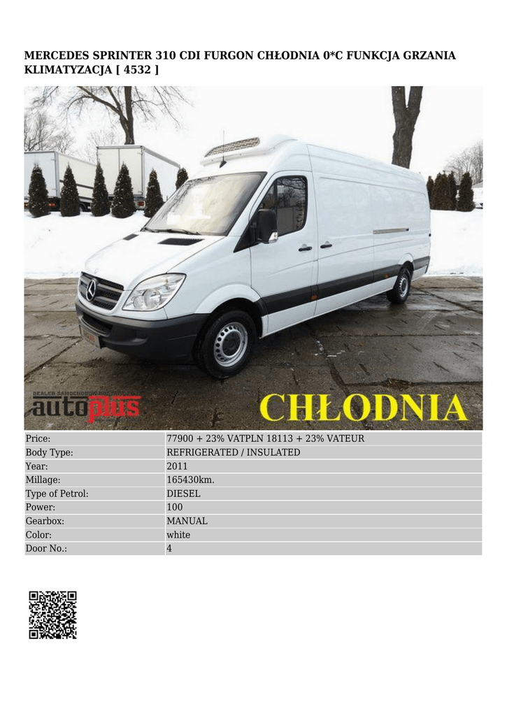 MERCEDES SPRINTER 310 CDI FURGON CHŁODNIA 0*C FUNKCJA GRZANIA KLIMATYZACJA [ 4532 ] Price: Body Type: Year: Millage: Type of Petrol: Power: Gearbox: Color: Door No.: 77900 + 23% VATPLN 18113 + 23% VATEUR REFRIGERATED / INSULATED 2011 165430km. DIESEL 100 MANUAL white 4 ADDITIONAL INFORMATION ● ● ● ● accident-free sprowadzony zarejestrowany w polsce stan bardzo dobry OPTIONAL EXTRAS ● ● ● ● ● ● ● ● ● ● ABS centralny zamek elektryczne lusterka immobiliser klimatyzacja komputer kontrola trakcji radio / cd wspomaganie kierownicy elektryczne szyby DESCRIPTION OFFER NUMBER- 4532 Bought in Belgium Mercedes Sprinter 310 refrigerator closed box in perfect condition. Year 2011 white color. Car accident free, efficient 100% Serviced in ASO. The interior is clean, neat- looks perfect. Engine 2.2 CDI with 100HP working briliant. Gearbox and suspension are working as they should. Car has Thermo King which is cooling to 0*C. It has heating function. Sprinter has aircondition. Equipment: - ABS, ASR - Drivers airbag - Air Conditioning - Power steering - Central locking - Immobilizer - On-board computer - Electric windows and mirrors - 3 seats - 6 speed - radio - Thermo King cooling to 0*C, heating function - Servicebook - Dimensions of loading area: length / 412 cm / width / 175 cm / Height / 188 cm /