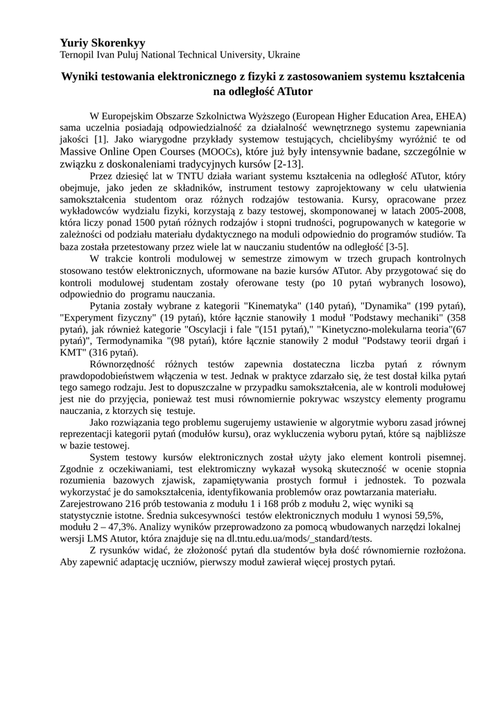 Yuriy Skorenkyy Ternopil Ivan Puluj National Technical University, Ukraine Wyniki testowania elektronicznego z fizyki z zastosowaniem systemu kształcenia na odległość ATutor W Europejskim Obszarze Szkolnictwa Wyższego (European Higher Education Area, EHEA) sama uczelnia posiadają odpowiedzialność za działalność wewnętrznego systemu zapewniania jakości [1]. Jako wiarygodne przykłady systemow testujących, chcielibyśmy wyróżnić te od Massive Online Open Courses (MOOCs), które już były intensywnie badane, szczególnie w związku z doskonaleniami tradycyjnych kursów [2-13]. Przez dziesięć lat w TNTU działa wariant systemu kształcenia na odległość ATutor, który obejmuje, jako jeden ze składników, instrument testowy zaprojektowany w celu ułatwienia samokształcenia studentom oraz różnych rodzajów testowania. Kursy, opracowane przez wykładowców wydzialu fizyki, korzystają z bazy testowej, skomponowanej w latach 2005-2008, która liczy ponad 1500 pytań różnych rodzajów i stopni trudności, pogrupowanych w kategorie w zależności od podziału materiału dydaktycznego na moduli odpowiednio do programów studiów. Ta baza została przetestowany przez wiele lat w nauczaniu studentów na odległość [3-5]. W trakcie kontroli modulowej w semestrze zimowym w trzech grupach kontrolnych stosowano testów elektronicznych, uformowane na bazie kursów ATutor. Aby przygotować się do kontroli modulowej studentam zostały oferowane testy (po 10 pytań wybranych losowo), odpowiednio do programu nauczania. Pytania zostały wybrane z kategorii "Kinematyka" (140 pytań), "Dynamika" (199 pytań), "Experyment fizyczny" (19 pytań), które łącznie stanowiły 1 moduł "Podstawy mechaniki" (358 pytań), jak również kategorie "Oscylacji i fale "(151 pytań)," "Kinetyczno-molekularna teoria"(67 pytań)", Termodynamika "(98 pytań), które łącznie stanowiły 2 moduł "Podstawy teorii drgań i KMT" (316 pytań). Równorzędność różnych testów zapewnia dostateczna liczba pytań z równym prawdopodobieństwem włączenia w test. Jednak w praktyce zdarzało się, że test dostał kilka pytań tego samego rodzaju. Jest to dopuszczalne w przypadku samokształcenia, ale w kontroli modułowej jest nie do przyjęcia, ponieważ test musi równomiernie pokrywac wszystcy elementy programu nauczania, z ktorzych się testuje. Jako rozwiązania tego problemu sugerujemy ustawienie w algorytmie wyboru zasad jrównej reprezentacji kategorii pytań (modułów kursu), oraz wykluczenia wyboru pytań, które są najbliższe w bazie testowej. System testowy kursów elektronicznych został użyty jako element kontroli pisemnej. Zgodnie z oczekiwaniami, test elektromiczny wykazał wysoką skuteczność w ocenie stopnia rozumienia bazowych zjawisk, zapamiętywania prostych formuł i jednostek. To pozwala wykorzystać je do samokształcenia, identyfikowania problemów oraz powtarzania materiału. Zarejestrowano 216 prób testowania z modułu 1 i 168 prób z modułu 2, więc wyniki są statystycznie istotne. Średnia sukcesywności testów elektronicznych modułu 1 wynosi 59,5%, modułu 2 – 47,3%. Analizy wyników przeprowadzono za pomocą wbudowanych narzędzi lokalnej wersji LMS Atutor, która znajduje się na dl.tntu.edu.ua/mods/_standard/tests. Z rysunków widać, że złożoność pytań dla studentów była dość równomiernie rozłożona. Aby zapewnić adaptację uczniów, pierwszy moduł zawierał więcej prostych pytań. Rysunek 1. Dystrybucja złożoności pytań kontroli pierwszego modułu. Oś pozioma przedstawia kategorii złożoności, oś pionowa - liczba pytań testowych należących do określonej kategorii. Rysunek 2. Dystrybucja złożoności pytań kontroli drugiego modułu. Oś pozioma przedstawia kategorii złożoności, oś pionowa - liczba pytań testowych należących do określonej kategorii. We wcześniejszych publikacjach [6, 14] podkreślono, że znaczącym etapem wprowadzenia elektronicznych systemów testowych powinne być aprobacja i adaptacja testu, oraz adaptacja studentów do nowych narzędz, które wymagają znacznego wysiłku przez długi czas. Całkowite zastąpienie standardowego testu testem elektronicznym w tej chwili wydaje się niewłaściwe, ponieważ w szczególności eliminuje możliwość analizowania i korygowania błędów, przyznawania punktów za częściowo słuszne rozwiązanie. Zalety standardowego testu są lepszy bilans i zgodność programu [15], możliwość włączenia zagadnień o różnej złożoności i różnej liczbie punktów, łatwość wpisania formuł i wykresów. Wnioski: 1. Testy bazowe powinne być podzielone na kategorie odpowiadające modułam programów ktorze mogą być oddzielnie stosowanych do samokontroli. 2. Zestaw testów powinien rownomiernie pokrywac materiał programu, w przeciwnym razie zwiększa się prawdopodobieństwo losowego doboru pytań dotyczących jednego tematu do testu modułowego. 3. Całkowite zastąpienie standardowego testu testem elektronicznym eliminuje możliwość analizowania i korygowania błędów, przyznawania punktów za częściowo słuszne rozwiązanie. 4. Zalety standardowego testu są lepszy bilans i zgodność programu, możliwość włączenia zagadnień o różnej złożoności i różnej liczbie punktów, łatwość wpisania formuł i wykresów. 5. Wprowadzenie testów elektronicznych jako elementow testów modułowych powinno zaczynać się od adaptacji studentów do tego rodzaju kontroli. 1. The European Higher Education Area in 2015. Bologna Process Implementation Report – European Commission / EACEA / Eurydice, Luxembourg: Publications Office of the European Union. 2015. – Available at http://eacea.ec.europa.eu/education/eurydice/documents/thematic_reports/182EN.pdf 2. Skorenkyy Y. Open online courses in science and engineering / Yuriy Skorenkyy // Proceedings. Vol.9: Modern problems of engineering and technology / Ternopil Branch of Shevchenko Scientific Society. —