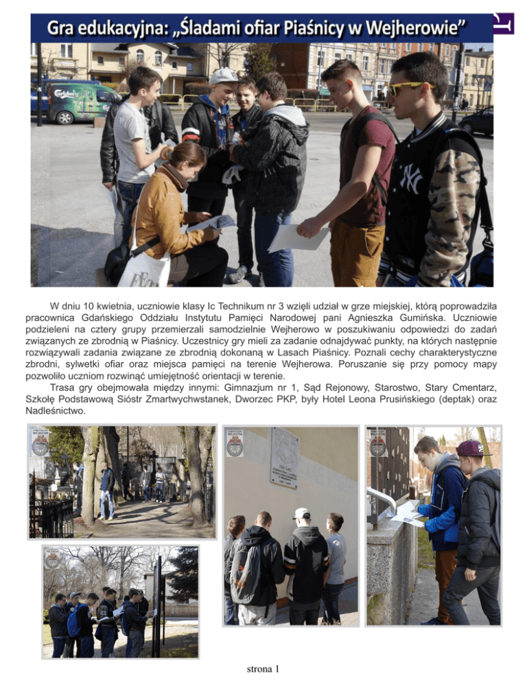 W dniu 10 kwietnia, uczniowie klasy Ic Technikum nr 3 wzięli udział w grze miejskiej, którą poprowadziła pracownica Gdańskiego Oddziału Instytutu Pamięci Narodowej pani Agnieszka Gumińska. Uczniowie podzieleni na cztery grupy przemierzali samodzielnie Wejherowo w poszukiwaniu odpowiedzi do zadań związanych ze zbrodnią w Piaśnicy. Uczestnicy gry mieli za zadanie odnajdywać punkty, na których następnie rozwiązywali zadania związane ze zbrodnią dokonaną w Lasach Piaśnicy. Poznali cechy charakterystyczne zbrodni, sylwetki ofiar oraz miejsca pamięci na terenie Wejherowa. Poruszanie się przy pomocy mapy pozwoliło uczniom rozwinąć umiejętność orientacji w terenie. Trasa gry obejmowała między innymi: Gimnazjum nr 1, Sąd Rejonowy, Starostwo, Stary Cmentarz, Szkołę Podstawową Sióstr Zmartwychwstanek, Dworzec PKP, były Hotel Leona Prusińskiego (deptak) oraz Nadleśnictwo. strona 1