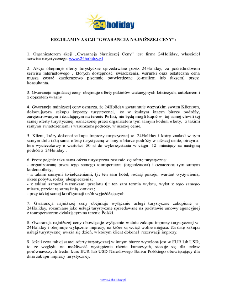 REGULAMIN AKCJI "GWARANCJA NAJNIŻSZEJ CENY”: 1. Organizatorem akcji „Gwarancja Najniższej Ceny” jest firma 24Holiday, właściciel serwisu turystycznego www.24holiday.pl 2. Akcja obejmuje oferty turystyczne sprzedawane przez 24Holiday, za pośrednictwem serwisu internetowego , których dostępność, świadczenia, warunki oraz ostateczna cena muszą zostać każdorazowo pisemnie potwierdzone (e-mailem lub faksem) przez konsultanta. 3. Gwarancja najniższej ceny obejmuje oferty pakietów wakacyjnych lotniczych, autokarem i z dojazdem własny 4. Gwarancja najniższej ceny oznacza, że 24Holiday gwarantuje wszystkim swoim Klientom, dokonującym zakupu imprezy turystycznej, że w żadnym innym biurze podróży, zarejestrowanym i działającym na terenie Polski, nie będą mogli kupić w tej samej chwili tej samej oferty turystycznej, oznaczonej przez organizatora tym samym kodem oferty, z takimi samymi świadczeniami i warunkami podróży, w niższej cenie. 5. Klient, który dokonał zakupu imprezy turystycznej w 24Holiday i który znalazł w tym samym dniu taką samą ofertę turystyczną w innym biurze podróży w niższej cenie, otrzyma bon wycieczkowy o wartości 50 zł do wykorzystania w ciągu 12 miesięcy na następną podróż z 24Holiday . 6. Przez pojęcie taka sama oferta turystyczna rozumie się ofertę turystyczną: - organizowaną przez tego samego touroperatora (organizatora) i oznaczoną tym samym kodem oferty; - z takimi samymi świadczeniami, tj.: ten sam hotel, rodzaj pokoju, wariant wyżywienia, okres pobytu, rodzaj ubezpieczenia; - z takimi samymi warunkami przelotu tj.: ten sam termin wylotu, wylot z tego samego miasta, przelot tą samą linią lotniczą; - przy takiej samej konfiguracji osób wyjeżdżających 7. Gwarancja najniższej ceny obejmuje wyłącznie usługi turystyczne zakupione w 24Holiday, rozumiane jako usługi turystyczne sprzedawane na podstawie umowy agencyjnej z touroperatorem działającym na terenie Polski. 8. Gwarancja najniższej ceny obowiązuje wyłącznie w dniu zakupu imprezy turystycznej w 24Holiday i obejmuje wyłącznie imprezy, na które są wciąż wolne miejsca. Za datę zakupu usługi turystycznej uważa się dzień, w którym klient dokonał rezerwacji imprezy. 9. Jeżeli cena takiej samej oferty turystycznej w innym biurze wyrażona jest w EUR lub USD, to ze względu na możliwość wystąpienia różnic kursowych, stosuje się dla celów porównawczych średni kurs EUR lub USD Narodowego Banku Polskiego obowiązujący dla dnia zakupu imprezy turystycznej. www.24holiday.pl 10. Za dowód zaistnienia różnicy w cenie uważa się zaświadczenie wystawione przez inne biuro podróży, zawierające jego dokładne dane adresowe, datę wystawienia i pieczątkę , potwierdzające, że usługa turystyczna cechująca się określonymi świadczeniami i warunkami opisanymi w pkt. 6, jest dostępna w tym biurze podróży, w danym dniu po określonej cenie, niższej niż cena zapłacona przez klienta tego samego dnia w 24holiday 11. Dowód zaistnienia różnicy w cenie powinien być przesłany do 24Holiday faksem na numer 85 742 91 56 lub e-mailem na adres [email protected] w dniu zakupu imprezy turystycznej. 12. Gwarancja najniższej ceny nie dotyczy krótkoterminowych obniżek cen dokonanych przez touroperatora po dokonaniu rezerwacji przez Klienta, przyznawanych niezgodnie z prawem rabatów, programów lojalnościowych, kart stałego klienta, czy innych wspólnych akcji promocyjnych touroperatora i biur podróży. Gwarancja najniższej ceny nie dotyczy ewentualnych podwyżek cen wprowadzanych przez organizatorów w przypadku wykupienia imprezy bez gwarancji stałej ceny. 13. 24Holiday zastrzega sobie prawo dokonywania zmian w niniejszym Regulaminie, aktualna treść Regulaminu jest dostępna na stronach 24Holiday www.24holiday.pl