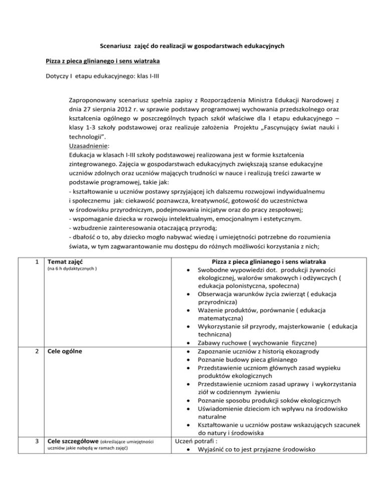 Scenariusz zajęć do realizacji w gospodarstwach edukacyjnych Pizza z pieca glinianego i sens wiatraka Dotyczy I etapu edukacyjnego: klas I-III Zaproponowany scenariusz spełnia zapisy z Rozporządzenia Ministra Edukacji Narodowej z dnia 27 sierpnia 2012 r. w sprawie podstawy programowej wychowania przedszkolnego oraz kształcenia ogólnego w poszczególnych typach szkół właściwe dla I etapu edukacyjnego – klasy 1-3 szkoły podstawowej oraz realizuje założenia Projektu „Fascynujący świat nauki i technologii”. Uzasadnienie: Edukacja w klasach I-III szkoły podstawowej realizowana jest w formie kształcenia zintegrowanego. Zajęcia w gospodarstwach edukacyjnych zwiększają szanse edukacyjne uczniów zdolnych oraz uczniów mających trudności w nauce i realizują treści zawarte w podstawie programowej, takie jak: - kształtowanie u uczniów postawy sprzyjającej ich dalszemu rozwojowi indywidualnemu i społecznemu jak: ciekawość poznawcza, kreatywność, gotowość do uczestnictwa w środowisku przyrodniczym, podejmowania inicjatyw oraz do pracy zespołowej; - wspomaganie dziecka w rozwoju intelektualnym, emocjonalnym i estetycznym. - wzbudzenie zainteresowania otaczającą przyrodą; - dbałość o to, aby dziecko mogło nabywać wiedzę i umiejętności potrzebne do rozumienia świata, w tym zagwarantowanie mu dostępu do różnych możliwości korzystania z nich; 1 Temat zajęć (na 6 h dydaktycznych ) 2 Cele ogólne 3 Cele szczegółowe (określające umiejętności uczniów jakie nabędą w ramach zajęć) Pizza z pieca glinianego i sens wiatraka Swobodne wypowiedzi dot. produkcji żywności ekologicznej, walorów smakowych i odżywczych ( edukacja polonistyczna, społeczna) Obserwacja warunków życia zwierząt ( edukacja przyrodnicza) Ważenie produktów, porównanie ( edukacja matematyczna) Wykorzystanie sił przyrody, majsterkowanie ( edukacja techniczna) Zabawy ruchowe ( wychowanie fizyczne) Zapoznanie uczniów z historią ekozagrody Poznanie budowy pieca glinianego Przedstawienie uczniom głównych zasad wypieku produktów ekologicznych Przedstawienie uczniom zasad uprawy i wykorzystania ziół w codziennym żywieniu Poznanie sposobu produkcji soków ekologicznych Uświadomienie dzieciom ich wpływu na środowisko naturalne Kształtowanie u uczniów postaw wskazujących szacunek do natury i środowiska Uczeń potrafi : Wyjaśnić co to jest przyjazne środowisko 4 Metody i techniki pracy-służące osiągnięciu efektów opisanych w celach szczegółowych 5 Materiały dydaktyczne oraz środki (itp. Prezentacje, teksty, karty pracy, słuchowiska, filmy, nagrania itp.) 6 Przebieg zajęć Opis, jak powinny wyglądać warsztaty-może być np. z podziałem na wstęp, część główną i końcową. Powinien zawierać takie elementy jak: - sformułowanie problemu, - zmotywowanie do pracy nad jego rozwiązaniem z pomocą różnorodnych metod i technik pracy (im bardziej zróżnicowane zadania, tym lepsze efekty kształcenia) ukierunkowanych na odkrywanie, przeżywanie, analizowanie, dociekanie, dyskusję, zabawę, doświadczenie, eksperyment… - rozwiązanie problemu - wspólne podsumowanie zajęć - końcowe uznanie wspólnych osiągnięć 7 Opis treści podstawy programowej realizowanych w ramach zajęć (z rozróżnieniem na przedmioty humanistyczne, Rozpoznać główne atrybuty ekologicznego pieca Zrozumieć jak wytwarzane są naturalne produkty spożywcze Wskazywać i nazywać zioła uprawiane w ogrodzie Wskazać jak prawidłowo przechowywać żywność i nie marnotrawić jej Opowiedzieć jak produkowany jest sok Wskazać pozytywne wartości ekologicznego żywienia Określić cechy prawidłowego odżywiania się Określić skąd pozyskać energię do produkcji żywności rozwijać umiejętność pracy w grupie słowna – pokaz multimedialny aktywizująca – praktyczna, warsztatowa oglądowa – ścieżka wokół gospodarstwa ekologicznego Forma pracy zbiorowa ,grupowa i indywidualna prezentacja multimedialna ścieżka dydaktyczna z uwzględnieniem rozwiązań proekologicznych przydomowa oczyszczalnia ścieków piec gliniany stanowisko do produkcji pizzy składniki do wyrobu pizzy elementy do budowy wiatraka I. Wstęp - powitanie uczniów, omówienie zasad bezpieczeństwa i zachowania podczas zajęć -przedstawienie planu zajęć II. Faza realizacji: -rozmowa kierowana na temat skąd pochodzi pizza -obejrzenie pieca do wypieku pizzy -jak budowane są piece – dyskusja rozmowa kierowana – jak sporządzić ciasto na pizzę – swobodne wypowiedzi uczniów- tematyka związana z produkcją żywności ekologicznej - wybieramy produkty do wypieku pizzy, ważymy składniki - przygotowujemy pizzę - pomysły dzieci na tworzenie rymowanek związanych ze zdrowym odżywianiem się - wyjście na spacer wokół zabudowań ekologicznych, obserwacja obejścia i zwierząt w zagrodach, karmienie zwierząt - zabawy w sadzie - obserwacja procesu tłoczenia soków w tłoczarni - zasady segregacji śmieci w ekozagrodzie- dyskusja - wykonanie modelu wiatraczka, demonstracja jego działania III. Faza końcowa - degustacja własnych wyrobów – pizzy , soków - podsumowanie działań prowadzonych w czasie zajęć - pożegnanie Edukacja polonistyczna uważnie słucha wypowiedzi i korzysta z przekazywanych informacji, matematyczno-przyrodnicze, uczniów zdolnych oraz uczniów z dysfunkcjami /trudnościami w nauce, a także uczniów o specjalnych potrzebach edukacyjnych) czyta i rozumie teksty przeznaczone dla dzieci na I etapie edukacyjnym i wyciąga z nich wnioski, tworzy wypowiedzi poprzez dobór właściwej formy komunikowania się uczestniczy w rozmowach: zadaje pytania, udziela odpowiedzi i prezentuje własne zdanie; poszerza zakres słownictwa Edukacja społeczna uczniowie współpracują z innymi w zabawie, nauce, w sytuacjach życiowych przestrzeganie zasad bezpieczeństwa wie, jak ważna jest praca w życiu człowieka; wie, jaki zawód wykonują jego najbliżsi i znajomi; 