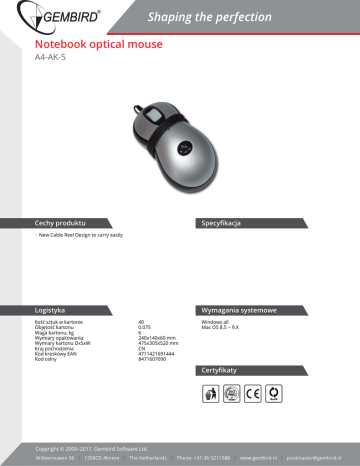 Notebook optical mouse A4-AK-5 Cechy produktu Specyfikacja - New Cable Reel Design to carry easily Logistyka Wymagania systemowe Ilość sztuk w kartonie Objętość kartonu Waga kartonu, kg Wymiary opakowania: Wymiary kartonu DxSxW Kraj pochodzenia Kod kreskowy EAN Kod celny 40 0.075 6 240x140x60 mm 475x305x520 mm CN 4711421691444 8471607090 Windows all Mac OS 8.5 ~ 9.X Certyfikaty Copyright © 2009–2017, Gembird Software Ltd. ! " # $ ! "