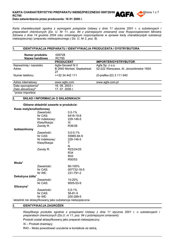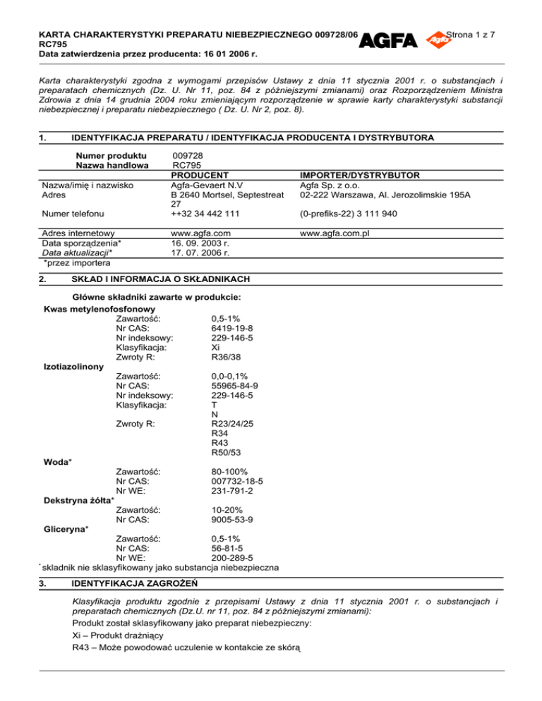 KARTA CHARAKTERYSTYKI PREPARATU NIEBEZPIECZNEGO 009728/06 RC795 Data zatwierdzenia przez producenta: 16 01 2006 r. Strona 1 z 7 Karta charakterystyki zgodna z wymogami przepisów Ustawy z dnia 11 stycznia 2001 r. o substancjach i preparatach chemicznych (Dz. U. Nr 11, poz. 84 z późniejszymi zmianami) oraz Rozporządzeniem Ministra Zdrowia z dnia 14 grudnia 2004 roku zmieniającym rozporządzenie w sprawie karty charakterystyki substancji niebezpiecznej i preparatu niebezpiecznego ( Dz. U. Nr 2, poz. 8). 1. IDENTYFIKACJA PREPARATU / IDENTYFIKACJA PRODUCENTA I DYSTRYBUTORA Numer produktu Nazwa handlowa Nazwa/imię i nazwisko Adres Numer telefonu Adres internetowy Data sporządzenia* Data aktualizacji* *przez importera 2. 009728 RC795 PRODUCENT Agfa-Gevaert N.V B 2640 Mortsel, Septestreat 27 ++32 34 442 111 www.agfa.com 16. 09. 2003 r. 17. 07. 2006 r. IMPORTER/DYSTRYBUTOR Agfa Sp. z o.o. 02-222 Warszawa, Al. Jerozolimskie 195A (0-prefiks-22) 3 111 940 www.agfa.com.pl SKŁAD I INFORMACJA O SKŁADNIKACH Główne składniki zawarte w produkcie: Kwas metylenofosfonowy Zawartość: 0,5-1% Nr CAS: 6419-19-8 Nr indeksowy: 229-146-5 Klasyfikacja: Xi Zwroty R: R36/38 Izotiazolinony Zawartość: 0,0-0,1% Nr CAS: 55965-84-9 Nr indeksowy: 229-146-5 Klasyfikacja: T N Zwroty R: R23/24/25 R34 R43 R50/53 Woda* Zawartość: 80-100% Nr CAS: 007732-18-5 Nr WE: 231-791-2 Dekstryna żółta* Zawartość: 10-20% Nr CAS: 9005-53-9 Gliceryna* Zawartość: 0,5-1% Nr CAS: 56-81-5 Nr WE: 200-289-5 * skladnik nie sklasyfikowany jako substancja niebezpieczna 3. IDENTYFIKACJA ZAGROŻEŃ Klasyfikacja produktu zgodnie z przepisami Ustawy z dnia 11 stycznia 2001 r. o substancjach i preparatach chemicznych (Dz.U. nr 11, poz. 84 z późniejszymi zmianami): Produkt został sklasyfikowany jako preparat niebezpieczny: Xi – Produkt drażniący R43 – Może powodować uczulenie w kontakcie ze skórą KARTA CHARAKTERYSTYKI PREPARATU NIEBEZPIECZNEGO 009728/06 RC795 Data zatwierdzenia przez producenta: 16 01 2006 r. 3. Strona 2 z 7 IDENTYFIKACJA ZAGROŻEŃ Opakowania jednostkowe wymagają znakowania ostrzegawczego – patrz pkt 15. 4. PIERWSZA POMOC Skóra: Natychmiast zmywać dużą ilością wody z mydłem. W przypadku wystąpienia poparzeń lub uczuleń zwrócić się o pomoc lekarską. Oczy: W przypadku dostania się produktu do oczu natychmiast przemywać oczy dużą ilością czystej bieżącej wody przez minimum 15 minut. Zwrócić się o pomoc do lekarza okulisty. Połknięcie: Przemyć usta dużą ilością wody. Wezwać lekarza i pokazać opakowanie lub etykietę. Wdychanie: Wyprowadzić poszkodowanego na świeże powietrze. W przypadku utrzymywania się dolegliwości zwrócić się o pomoc medyczną. 5. POSTĘPOWANIE W PRZYPADKU POŻARU Zalecane środki gaśnicze: Preparat jest roztworem wodnym. Środki gaśnicze stosowne do materiałów znajdujących się w strefie pożaru. Nieodpowiednie środki gaśnicze: Producent nie określił. Szczególne zagrożenie ze strony produktów spalania i wydzielających się gazów: Nie są znane. Zagrożenie wybuchowe i pożarowe: Nie są znane. Specjalne wyposażenie ochronne strażaków: Nie dotyczy (roztwór wodny). 6. POSTĘPOWANIE W PRZYPADKU NIEZAMIERZONEGO UWOLNIENIA DO ŚRODOWISKA Zapewnić odpowiednią wentylację tak by stężenia składników w środowisku pracy były niższe od stężeń NDS patrz pkt. 8. Uwolniony produkt przesypać materiałem pochłaniającym (suchy piasek, ziemia lub inny neutralny absorbent), zebrać do odpowiednio oznakowanego pojemnika na odpady oraz powiadomić odpowiednie służby. Powierzchnię w miejscu wycieku dokładnie oczyścić z pozostałości uwolnionego produktu. Zabezpieczyć przed przedostaniem się substancji do wód powierzchniowych kanalizacji lub gleby. Postępowanie z odpadami patrz punkt 13. 7. POSTĘPOWANIE Z PREPARATEM I MAGAZYNOWANIE Postępowanie z preparatem: Chronić oczy, skórę i odzież przed kontaktem z produktem. Zapewnić odpowiednią wentylację tak by stężenia składników w środowisku pracy były niższe od stężeń NDS patrz pkt. 8. Po pracy z produktem dokładnie umyć ręce. Magazynowanie: Przechowywać w zamkniętych pojemnikach w temperaturze 5-35°C, w suchym miejscu (15%<RH<65%) Chronić przed światłem słonecznym. Przechowywać z dala od źródeł ciepła. Wymagania dotyczące wentylacji: Zgodnie z zaleceniami producenta wentylacja ogólna powinna zapewnić do 10-krotnej wymiany KARTA CHARAKTERYSTYKI PREPARATU NIEBEZPIECZNEGO 009728/06 RC795 Data zatwierdzenia przez producenta: 16 01 2006 r. 7. Strona 3 z 7 POSTĘPOWANIE Z PREPARATEM I MAGAZYNOWANIE powietrza/godzinę. Środki ostrożności: Specjalne środki ochrony przeciwogniowej i przeciwwybuchowej nie są potrzebne. 8. KONTROLA NARAŻENIA I ŚRODKI OCHRONY INDYWIDUALNEJ Dodatkowe zalecenia w zakresie środków inżynieryjnych: Zapewnić odpowiednią wentylację tak by stężenia składników w środowisku pracy były niższe od stężeń NDS. Parametry kontroli narażenia: Rozporządzenie MPiPS z dnia 29 listopada 2002 r. w sprawie najwyższych dopuszczalnych stężeń i natężeń czynników szkodliwych dla zdrowia w środowisku pracy (Dz.U. z 2002 r. nr 217, poz. 1833): Zalecenia dotyczące procedury monitoringu – metodyka pomiarów: Rozporządzenie MZiOS z dnia 20 grudnia 2002 r. zmieniające rozporządzenie w sprawie badań i pomiarów czynników szkodliwych dla zdrowia w środowisku pracy (Dz. U. Nr 21, poz. 180) – PN 89/Z-01001/06. Ochrona czystości powietrza. Nazwy, określenia i jednostki. Terminologia dotycząca badań jakości powietrza na stanowiskach pracy. – PN 89/Z-04008/07. Ochrona czystości powietrza. Pobieranie próbek. Zasady pobierania próbek powietrza w środowisku pracy i interpretacja wyników. Ochrona dróg oddechowych: Nie jest wymagana. Ochrona skóry rąk: Nosić odpowiednie rękawice ochronne. Wykonane z materiałów.: kauczuk butylowy o grubości >=0,36mm Czas przenikania > 480min guma nitrylowa o grubośc