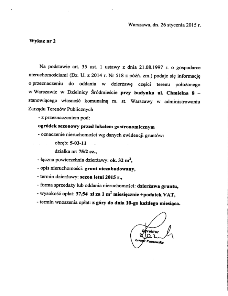 Warszawa, dn. 26 stycznia 2015 r. Wykaznr2 Na podstawie art. 35 ust. I ustawy z dnia 21.08.1997 r. o gospodarce nieruchomościami (Dz. U. z 2014 r. Nr 518 z późń. zm.) podaje się informację o przeznaczeniu do oddania w Warszawie w Dzielnicy stanowiącego własność w dzierżawę Śródmieście komunalną przy części budynku m. st. Warszawy terenu położonego ul. Chmielna 8 - w administrowaniu Zarządu Terenów Publicznych - z przeznaczeniem pod: ogródek sezonowy przed lokalem gastronomicznym - oznaczenie nieruchomości wg danych ewidencji gruntów: obręb: 5-03-11 działka nr: 75/2 cz., - łączna powierzchnia dzierżawy: ok. 32 m2, - opis nieruchomości: grunt niezabudowany, - termin dzierżawy: sezon letni 2015 r., - forma sprzedaży lub oddania nieruchomości: dzierżawa gruntu, - wysokość opłat: 37,54 zł za l m2 miesięcznie +podatek VAT, - termin wnoszenia opłat: z góry do dnia lO-go każdego miesiąca.