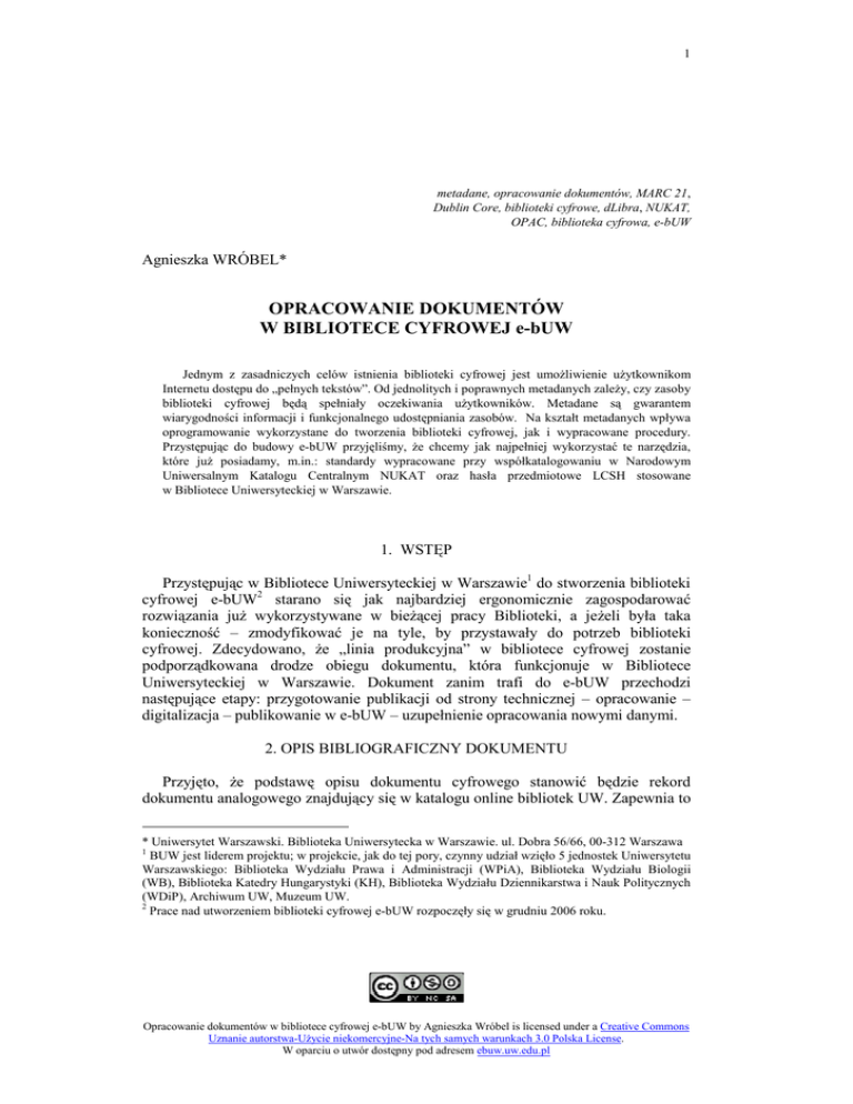 1 metadane, opracowanie dokumentów, MARC 21, Dublin Core, biblioteki cyfrowe, dLibra, NUKAT, OPAC, biblioteka cyfrowa, e-bUW Agnieszka WRÓBEL* OPRACOWANIE DOKUMENTÓW W BIBLIOTECE CYFROWEJ e-bUW Jednym z zasadniczych celów istnienia biblioteki cyfrowej jest umożliwienie użytkownikom Internetu dostępu do „pełnych tekstów”. Od jednolitych i poprawnych metadanych zależy, czy zasoby biblioteki cyfrowej będą spełniały oczekiwania użytkowników. Metadane są gwarantem wiarygodności informacji i funkcjonalnego udostępniania zasobów. Na kształt metadanych wpływa oprogramowanie wykorzystane do tworzenia biblioteki cyfrowej, jak i wypracowane procedury. Przystępując do budowy e-bUW przyjęliśmy, że chcemy jak najpełniej wykorzystać te narzędzia, które już posiadamy, m.in.: standardy wypracowane przy współkatalogowaniu w Narodowym Uniwersalnym Katalogu Centralnym NUKAT oraz hasła przedmiotowe LCSH stosowane w Bibliotece Uniwersyteckiej w Warszawie. 1. WSTĘP Przystępując w Bibliotece Uniwersyteckiej w Warszawie1 do stworzenia biblioteki cyfrowej e-bUW2 starano się jak najbardziej ergonomicznie zagospodarować rozwiązania już wykorzystywane w bieżącej pracy Biblioteki, a jeżeli była taka konieczność – zmodyfikować je na tyle, by przystawały do potrzeb biblioteki cyfrowej. Zdecydowano, że „linia produkcyjna” w bibliotece cyfrowej zostanie podporządkowana drodze obiegu dokumentu, która funkcjonuje w Bibliotece Uniwersyteckiej w Warszawie. Dokument zanim trafi do e-bUW przechodzi następujące etapy: przygotowanie publikacji od strony technicznej – opracowanie – digitalizacja – publikowanie w e-bUW – uzupełnienie opracowania nowymi danymi. 2. OPIS BIBLIOGRAFICZNY DOKUMENTU Przyjęto, że podstawę opisu dokumentu cyfrowego stanowić będzie rekord dokumentu analogowego znajdujący się w katalogu online bibliotek UW. Zapewnia to * Uniwersytet Warszawski. Biblioteka Uniwersytecka w Warszawie. ul. Dobra 56/66, 00-312 Warszawa 1 BUW jest liderem projektu; w projekcie, jak do tej pory, czynny udział wzięło 5 jednostek Uniwersytetu Warszawskiego: Biblioteka Wydziału Prawa i Administracji (WPiA), Biblioteka Wydziału Biologii (WB), Biblioteka Katedry Hungarystyki (KH), Biblioteka Wydziału Dziennikarstwa i Nauk Politycznych (WDiP), Archiwum UW, Muzeum UW. 2 Prace nad utworzeniem biblioteki cyfrowej e-bUW rozpoczęły się w grudniu 2006 roku. Opracowanie dokumentów w bibliotece cyfrowej e-bUW by Agnieszka Wróbel is licensed under a Creative Commons Uznanie autorstwa-Użycie niekomercyjne-Na tych samych warunkach 3.0 Polska License. W oparciu o utwór dostępny pod adresem ebuw.uw.edu.pl 2 spójność danych, ułatwia czytelnikowi wyszukiwanie, ponieważ katalog jest kontrolowany kartoteką haseł wzorcowych – narzędziem, którym nie dysponuje oprogramowanie biblioteki cyfrowej. Podejmując taką decyzję kierowano się faktem, że choć Biblioteka Uniwersytecka w Warszawie współkataloguje w Narodowym Uniwersalnym Katalogu Centralnym NUKAT3 od samego początku, to część opisów bibliograficznych znajduje się wyłącznie w katalogu lokalnym4, 5. Biblioteka Uniwersytecka w Warszawie rozpoczęła elektroniczne katalogowanie swoich zbiorów w 1994 roku, NUKAT uruchomiono oficjalnie 1 lipca 2002 roku6. Pamiętać należy również, że część dokumentów, jak choćby dokumenty ikonograficzne7 czy rękopisy ze względów formalnych nie są katalogowane w NUKAT. Dokumenty takie opracowywane są w katalogu lokalnym według zasad przyjętych wewnętrznie dla danego typu dokumentu, najczęściej formatu MARC 21 dla książek. Opis dokumentu w bibliotece cyfrowej e-bUW sporządzany jest, jak w każdej bibliotece cyfrowej pracującej w oprogramowaniu dLibra8, w formacie Dublin Core9. W pierwszym etapie opracowania dokumentu wtórnego publikowanego w e-bUW metadane pobierane są z katalogu lokalnego i zapisywane na dysku lokalnym, skąd pobierane są za pomocą skryptu (plik konfiguracyjny marcImport.properties)10, 11 do 3 Narodowy Uniwersalny Katalog Centralny NUKAT www.nukat.edu.pl Katalog bibliotek Uniwersytetu Warszawskiego: http://opac.buw.uw.pl tworzony jest obecnie przez 39 bibliotek Uniwersytetu Warszawskiego, w tym Bibliotekę Uniwersytecką w Warszawie, i 1 jednostkę nie będąca biblioteką, tj. Laboratorium Technik Diagnostycznych im. Bohdana Zawadzkiego na Wydziale Psychologii UW. 5 Jednym z głównych punktów projektu „NUKAT – Autostrada Informacji Cyfrowej” (http://autostrada.buw.uw.edu.pl/) realizowanego ze środków Programu Operacyjnego Innowacyjna Gospodarka w latach 2009-2013 jest scalanie zasobów katalogów lokalnych z katalogiem NUKAT. W ramach tego projektu na etapie automatycznego scalania połączono informacje w 155 183 rekordach pomiędzy bazą katalogu bibliotek UW a bazą NUKAT; w etapie realizowanym przez bibliotekarzy wprowadzono i zatwierdzono w katalogu NUKAT 1017 rekordów bibliograficznych pochodzących z OPAC bibliotek UW [stan na koniec 2010 roku]. 6 Pierwsze rekordy bibliograficzne w NUKAT były autorstwa BUW. 7 W trakcie powstawania referatu w dniu 6 maja 2011 roku został opublikowany Format MARC 21 rekordu bibliograficznego dla dokumentu ikonograficznego pod red. K. Sanetry, B. Góreckiej, A. Graff, Warszawa, Centrum NUKAT, 2011, Dostęp elektroniczny [2001.05.15]: http://www.nukat.edu.pl/nukat/book/ikonografia_1.pdf. Pierwsze rekordy ikonograficzne katalogowane według tego formatu będą zatwierdzane od 1 czerwca 2011 roku. 8 Projekt dLibra http://dlibra.psnc.pl/ 9 Obecna wersja oprogramowania dLibra [ver. 4.024], na której pracuje e-bUW stosuje format Dublin Core Metadata Element Set, Version 1.1 [DCMES v. 1.1] http://dublincore.org/documents/dces/, złożony z 15 atrybutów. Najnowsza wersja dLibry ver. 5.0 pozwalać będzie na przejście na rozszerzony format Dublin Core [DCMI Metadata Terms] http://dublincore.org/documents/dcmi-terms/ 10 Plik konfiguracyjny marcImport.properties pozwa