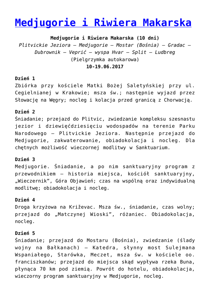 Medjugorie i Riwiera Makarska Medjugorie i Riwiera Makarska (10 dni) Plitvickie Jeziora – Medjugorie – Mostar (Bośnia) – Gradac – Dubrownik – Veprić – wyspa Hvar – Split – Ludbreg (Pielgrzymka autokarowa) 10-19.06.2017 Dzień 1 Zbiórka przy kościele Matki Bożej Saletyńskiej przy ul. Cegielnianej w Krakowie; msza św.; następnie wyjazd przez Słowację na Węgry; nocleg i kolacja przed granicą z Chorwacją. Dzień 2 Śniadanie; przejazd do Plitvic, zwiedzanie kompleksu szesnastu jezior i dziewięćdziesięciu wodospadów na terenie Parku Narodowego – Plitvickie Jeziora. Następnie przejazd do Medjugorie, zakwaterowanie, obiadokolacja i nocleg. Dla chętnych możliwość wieczornej modlitwy w Sanktuarium. Dzień 3 Medjugorie. Śniadanie, a po nim sanktuaryjny program z przewodnikiem – historia miejsca, kościół sanktuaryjny, „Wieczernik”, Góra Objawień; czas na wspólną oraz indywidualną modlitwę; obiadokolacja i nocleg. Dzień 4 Droga krzyżowa na Križevac. Msza św., śniadanie, czas wolny; przejazd do „Matczynej Wioski”, różaniec. Obiadokolacja, nocleg. Dzień 5 Śniadanie; przejazd do Mostaru (Bośnia), zwiedzanie (ślady wojny na Bałkanach) – Katedra, słynny most Sulejmana Wspaniałego, Starówka, Meczet, msza św. w kościele oo. franciszkanów; przejazd do miejsca skąd wypływa rzeka Buna, płynąca 70 km pod ziemią. Powrót do hotelu, obiadokolacja, wieczorny program sanktuaryjny w Medjugorie, nocleg. Dzień 6 Śniadanie, Msza św., wykwaterowanie i odjazd do hotelu w Gradac na Riwierze Makarskiej. Zakwaterowanie w hotelu. Odpoczynek na plaży. Czas wolny, obiadokolacja, nocleg. Dzień 7 Śniadanie; przejazd do Dubrownika, miasta wpisanego na Listę światowego dziedzictwa kulturowego UNESCO; zwiedzanie Starego Dubrownika z przewodnikiem. Msza św. Powrót do hotelu, plaża. Obiadokolacja, nocleg. Dzień 8 Śniadanie. Przejazd do miejscowości Veprić – chorwackie Lourdes na Riwierze Makarskiej, msza św.; rejs statkiem na wyspę Hvar, ryba na statku, plażowanie na wyspie; powrót do hotelu, obiadokolacja, nocleg. Dzień 9 Śniadanie; przejazd do Splitu – spacer po starówce m.in. zobaczymy, Pałac Dioklecjana, świątynię Jowisza, katedrę. Następnie odwiedzimy Ludbreg, miejsce cudu eucharystycznego, msza św; odjazd do Nagykanizsy, obiadokolacja, nocleg. Dzień 10 Msza św. w hotelu; śniadanie i wyjazd do Polski. Przyjazd do Krakowa i zakończenie pielgrzymki w godzinach wieczornych. Świadczenia: • przejazd komfortowym, klimatyzowanym autokarem • 9 noclegów w pokojach 2 i 3 osobowych z łazienkami • 9 śniadań i 9 obiadokolacji • codzienna msza św. • opieka duchowa kapłana i pilota • przewodnicy miejscowi w Mostarze, Splicie i Dubrowniku • bilety wstępu w Plitvickich Jeziorach • bilety wstępu do katedry w Splicie • ubezpieczenie NW, KL, chorób przewlekłych i bagażu • system Tour Audio Guide Cena nie obejmuje: • dopłaty do pokoju jednoosobowego (120 EUR) • napojów do obiadokolacji • napiwków zwyczajowych dla pilota, kierowców i obsługi hotelowej (25 EUR) • wydatków osobistych Ważne informacje: • organizator zastrzega sobie prawo zmiany kolejności zwiedzania w zależności od: pogody, kondycji uczestników oraz godzin otwarcia obiektów • koszt pielgrzymki może ulec małej korekcie ze względu na niestabilny rynek paliw oraz niestabilną sytuację polityczną • cena wyjazdu zawiera składkę do Turystycznego Funduszu Gwarancyjnego
