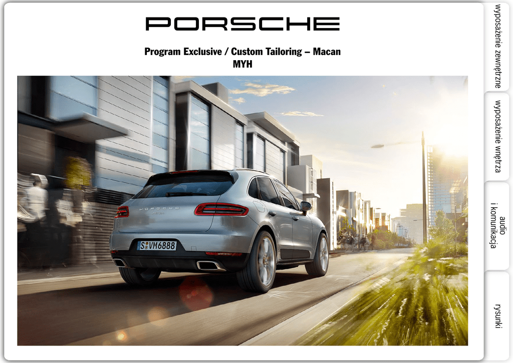 wyposażenie zewnętrzne Program Exclusive / Custom Tailoring – Macan MYH wyposażenie wnętrza audio i komunikacja rysunki 160902-Porsche-Macan-MYH-Exclusive-v04 CENA PLN Nadwozie • • 1171 1836 • 5267 • 6333 • 1623 • 6279 • 5534 • 6864 • 2341 Wyposażenie wnętrza Pakiet wykończenia wnętrza z elementami lakierowanymi. Lakier w kolorze nadwozia: ozdobna osłona deski rozdzielczej, ozdobne osłony drzwi przednich i tylnych APC Uwaga: Jeśli podczas zamawiania nie zostały określone dalsze specyfikacje, elementy zostaną polakierowane na kolor nadwozia. Możliwe również alternatywne kolory nadwozia. Dowolnie wybrany kolor spośród wszystkich kolorów standardowych i specjalnych Lakierowane kratki nawiewów. Lakier w kolorze nadwozia: kratki nawiewów bocznych z przodu, kratki nawiewów środkowych z przodu/z tyłu AVF Uwaga: Jeśli podczas zamawiania nie zostały określone dalsze specyfikacje, elementy zostaną polakierowane na kolor nadwozia. Możliwe również alternatywne kolory nadwozia. Dowolnie wybrany kolor spośród wszystkich kolorów standardowych i specjalnych Lakierowany kluczyk i skórzane etui. Kluczyk główny i zapasowy: lakier w kolorze nadwozia (obie strony kluczyka) Uwaga: Jeśli podczas zamawiania nie zostały określone dalsze specyfikacje, kluczyk zostanie polakierowany na kolor nadwozia. Możliwe również kontrastowe kolory nadwozia. Dowolnie wybrany kolor spośród wszystkich kolorów standardowych i specjalnych BFS Etui na kluczyk: Wykończenie gładką skórą w kolorze wnętrza z wytłoczonym herbem Porsche i dekoracyjnymi przeszyciami Uwaga: Jeśli podczas zamawiania nie zostaną określone dalsze specyfikacje, zostanie zastosowana skóra i przeszycia dekoracyjne w kolorze wnętrza. Możliwy również kolor kontrastowy. Dowolnie wybrany kolor skóry i/lub przeszyć dekoracyjnych spośród wszystkich kolorów standardowych i naturalnej skóry. W przypadku wyboru wykończenia gładką skórą w dwóch kolorach pasek (bez zatrzasku), boki i szwy są wykonane w jaśniejszym kolorze Skórzana tapicerka Pakiet wykończenia wnętrza skórą. Wykończenie gładką skórą w kolorze wnętrza: ozdobna osłona deski rozdzielczej, ozdobne osłony drzwi przednich i tylnych APL Uwaga: Jeśli podczas zamawiania nie zostaną określone dalsze specyfikacje, zostanie zastosowana skóra w kolorze wnętrza. Możliwe również kolory kontrastowe. Dowolnie wybrany kolor skóry spośród wszystkich kolorów standardowych i naturalnej skóry Rozszerzony pakiet wykończenia wnętrza skórą – deska rozdzielcza. Wykończenie gładką skórą w kolorze wnętrza z dekoracyjnymi przeszyciami: boczna osłona deski rozdzielczej, środkowa osłona deski rozdzielczej AZW Uwaga: Jeśli podczas zamawiania nie zostaną określone dalsze specyfikacje, przeszycia dekoracyjne zostaną wykonane w kolorze wnętrza. Oferta jest również dostępna bez dodatkowej opłaty w kontrastowych kolorach wnętrza. Dowolnie wybrany kolor przeszyć dekoracyjnych spośród wszystkich kolorów standardowych i naturalnej skóry. W przypadku wykończenia wnętrza w dwóch kolorach należące do tego pakietu przeszycia dekoracyjne są już wykonane w jaśniejszym kolorze Nawiewy wykończone skórą. Wykończenie gładką skórą w kolorze wnętrza: kratki nawiewów bocznych z przodu, kratki nawiewów środkowych z przodu, kratki nawiewów środkowych z tyłu AVJ Uwaga: Jeśli podczas zamawiania nie zostaną określone dalsze specyfikacje, zostanie zastosowana skóra w kolorze wnętrza. Możliwe również kolory kontrastowe. Dowolnie wybrany kolor skóry spośród wszystkich kolorów standardowych i naturalnej skóry Obudowa kolumny kierownicy wykończona skórą. Wykończenie gładką skórą w kolorze wnętrza z dekoracyjnymi przeszyciami: obudowa kolumny kierownicy Uwaga: Jeśli podczas zamawiania nie zostaną określone dalsze specyfikacje, przeszycia dekoracyjne zostaną wykonane w kolorze wnętrza. Oferta jest również dostępna ALL bez dodatkowej opłaty w kontrastowych kolorach wnętrza. Dowolnie wybrany kolor przeszyć dekoracyjnych spośród wszystkich kolorów standardowych i naturalnej skóry. W przypadku wykończenia wnętrza w dwóch kolorach należące do tego pakietu przeszycia dekoracyjne są już wykonane w jaśniejszym kolorze –1– rysunki 3938 audio i komunikacja • wyposażenie wnętrza Kratki wlotów powietrza polakierowane na kolor czarny (wysoki połysk). Lakier w kolorze czarnym (wysoki połysk): kratki wlotów powietrza, boczne listwy aerodynamiczne i osłony przednich świateł przeciwmgłowych AAU Lakierowane logo „PORSCHE”. Lakierowane w kolorze nadwozia lub w kolorze czarnym (wysoki połysk): Lakierowane logo „PORSCHE” z tyłu AAT Lakierowane logo „PORSCHE” i oznaczenie modelu. Lakierowane w kolorze nadwozia lub w kolorze czarnym (wysoki połysk) AAP wyposażenie zewnętrzne Macan Program Exclusive / Custom Tailoring – Macan MYH Kod Macan Program Exclusive / Custom Tailoring – Macan MYH CENA PLN Lusterko wewnętrzne wykończone skórą. Wykończenie gładką skórą w kolorze wnętrza z dekoracyjnymi przeszyciami: lusterko wewnętrzne, osłona anteny. Uwaga: Jeśli podczas zamawiania nie zostaną określone dalsze specyfikacje, przeszycia dekoracyjne zostaną wykonane w kolorze wnętrza. Oferta jest również dostępna AVW bez dodatkowej opłaty w kontrastowych kolorach wnętrza. Dowolnie wybrany kolor przeszyć dekoracyjnych spośród wszystkich kolorów standardowych i naturalnej skóry. W przypadku wykończenia wnętrza w dwóch kolorach należące do tego pakietu przeszycia dekoracyjne są już wykonane w jaśniejszym kolorze • 2075 Osłony przeciwsłoneczne wykończone skórą. Wykończenie gładką skórą w kolorze wnętrza z dekoracyjnymi przeszyciami: osłony przeciwsłoneczne Uwaga: Jeśli podczas zamawiania nie zostaną określone dalsze specyfikacje, elementy wykończone skórą i przeszycia dekoracyjne zostaną wykonane w kolo