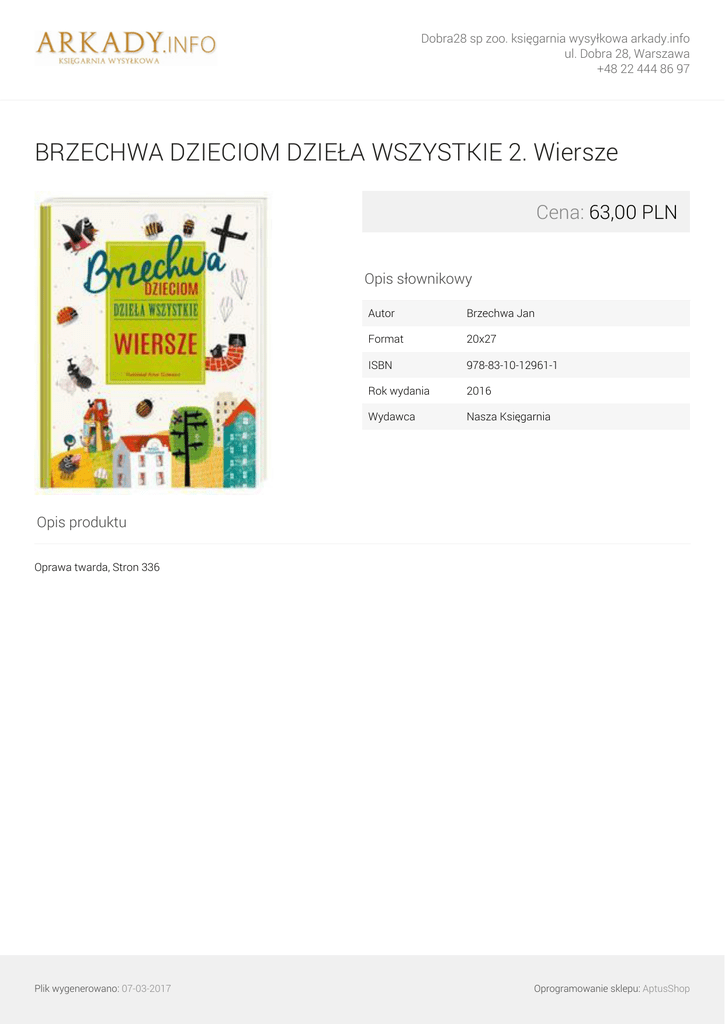 Dobra28 sp zoo. księgarnia wysyłkowa arkady.info ul. Dobra 28, Warszawa +48 22 444 86 97 BRZECHWA DZIECIOM DZIEŁA WSZYSTKIE 2. Wiersze Cena: 63,00 PLN Opis słownikowy Autor Brzechwa Jan Format 20x27 ISBN 978-83-10-12961-1 Rok wydania 2016 Wydawca Nasza Księgarnia Opis produktu Oprawa twarda, Stron 336 Plik wygenerowano: 07-03-2017 Powered by TCPDF (www.tcpdf.org) Oprogramowanie sklepu: AptusShop