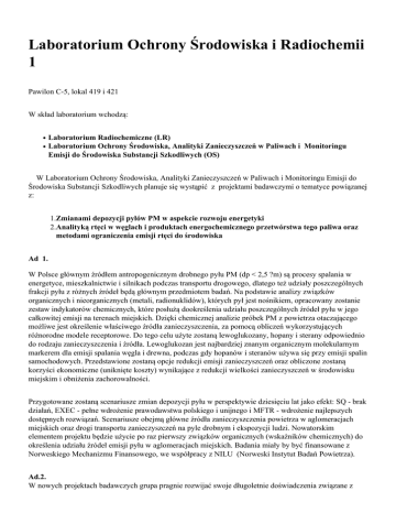 Laboratorium Ochrony Środowiska i Radiochemii 1 Pawilon C-5, lokal 419 i 421 W skład laboratorium wchodzą: Laboratorium Radiochemiczne (LR) Laboratorium Ochrony Środowiska, Analityki Zanieczyszczeń w Paliwach i Monitoringu Emisji do Środowiska Substancji Szkodliwych (OS) W Laboratorium Ochrony Środowiska, Analityki Zanieczyszczeń w Paliwach i Monitoringu Emisji do Środowiska Substancji Szkodliwych planuje się wystąpić z projektami badawczymi o tematyce powiązanej z: 1.Zmianami depozycji pyłów PM w aspekcie rozwoju energetyki 2.Analityką rtęci w węglach i produktach energochemicznego przetwórstwa tego paliwa oraz metodami ograniczenia emisji rtęci do środowiska Ad 1. W Polsce głównym źródłem antropogenicznym drobnego pyłu PM (dp < 2,5 ?m) są procesy spalania w energetyce, mieszkalnictwie i silnikach podczas transportu drogowego, dlatego też udziały poszczególnych frakcji pyłu z różnych źródeł będą głównym przedmiotem badań. Na podstawie analizy związków organicznych i nieorganicznych (metali, radionuklidów), których pył jest nośnikiem, opracowany zostanie zestaw indykatorów chemicznych, które posłużą dookreślenia udziału poszczególnych źródeł pyłu w jego całkowitej emisji na terenach miejskich. Dzięki chemicznej analizie próbek PM z powietrza otaczającego możliwe jest określenie właściwego źródła zanieczyszczenia, za pomocą obliczeń wykorzystujących różnorodne modele receptorowe. Do tego celu użyte zostaną lewoglukozany, hopany i sterany odpowiednio do rodzaju zanieczyszczenia i źródła. Lewoglukozan jest najbardziej znanym organicznym molekularnym markerem dla emisji spalania węgla i drewna, podczas gdy hopanów i steranów używa się przy emisji spalin samochodowych. Przedstawione zostaną opcje redukcji emisji zanieczyszczeń oraz obliczone zostaną korzyści ekonomiczne (uniknięte koszty) wynikające z redukcji wielkości zanieczyszczeń w środowisku miejskim i obniżenia zachorowalności. Przygotowane zostaną scenariusze zmian depozycji pyłu w perspektywie dziesięciu lat jako efekt: SQ - brak działań, EXEC - pełne wdrożenie prawodawstwa polskiego i unijnego i MFTR - wdrożenie najlepszych dostępnych rozwiązań. Scenariusze obejmą główne źródła zanieczyszczenia powietrza w aglomeracjach miejskich oraz drogi transportu zanieczyszczeń na pyle drobnym i ekspozycji ludzi. Nowatorskim elementem projektu będzie użycie po raz pierwszy związków organicznych (wskaźników chemicznych) do określenia udziału źródeł emisji pyłu w aglomeracjach miejskich. Badania miały by być finansowane z Norweskiego Mechanizmu Finansowego, we współpracy z NILU (Norweski Instytut Badań Powietrza). Ad.2. W nowych projektach badawczych grupa pragnie rozwijać swoje długoletnie doświadczenia związane z W nowych projektach badawczych grupa pragnie rozwijać swoje długoletnie doświadczenia związane z analityką rtęci i innych metali w środowisku. Poprzez coraz ściślejsze powiązanie projektów z przemysłem elektroenergetycznym, prowadzone prace stają się bardziej utylitarne i mogą służyć powstawaniu rozwiązań patentowych lub know-how. Jednym z podejmowanych wątków będzie również badanie i wykorzystanie sorbentów do redukcji zawartości rtęci w spalinach lub syngazie. Dzięki sprzętowi zgromadzonemu w planowanym laboratorium możliwa będzie kompleksowa ocena badanych materiałów i próbek środowiskowych pod względem analizy elementarnej i w wielu miejscach specjacyjnej. Opisane wątki badawcze prowadzone będą np. w ramach projektu KIC-InnoEnergy (Knowledge and Innovation Community –innowacyjna energia), podtemat CoalGas, WP4: „Monitoring and reduction of mercury emission in gasification and combustion processes”. Użytkownicy laboratorium prof. dr hab. inż. Barbara Kubica tel. 12 617 51 47 e-mail: [email protected] Miejsce pracy: WEiP, Katedra Chemii Węgla i Nauk o Środowisku, A-4, p. IV, pok. 422 prof. dr hab. inż. Janusz Gołaś tel 12 617 22 49 e-mail: [email protected]