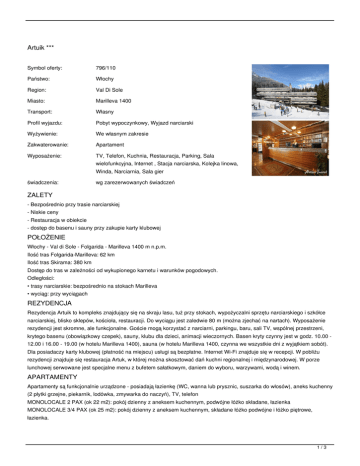 Artuik *** Symbol oferty: 796/110 Państwo: Włochy Region: Val Di Sole Miasto: Marilleva 1400 Transport: Własny Profil wyjazdu: Pobyt wypoczynkowy, Wyjazd narciarski Wyżywienie: We własnym zakresie Zakwaterowanie: Apartament Wyposażenie: TV, Telefon, Kuchnia, Restauracja, Parking, Sala wielofunkcyjna, Internet , Stacja narciarska, Kolejka linowa, Winda, Narciarnia, Sala gier świadczenia: wg zarezerwowanych świadczeń ZALETY - Bezpośrednio przy trasie narciarskiej - Niskie ceny - Restauracja w obiekcie - dostęp do basenu i sauny przy zakupie karty klubowej POŁOŻENIE Włochy - Val di Sole - Folgarida - Marilleva 1400 m n.p.m. Ilość tras Folgarida-Marilleva: 62 km Ilość tras Skirama: 380 km Dostęp do tras w zależności od wykupionego karnetu i warunków pogodowych. Odległości: • trasy narciarskie: bezpośrednio na stokach Marilleva • wyciąg: przy wyciągach REZYDENCJA Rezydencja Artuik to kompleks znajdujący się na skraju lasu, tuż przy stokach, wypożyczalni sprzętu narciarskiego i szkółce narciarskiej, blisko sklepów, kościoła, restauracji. Do wyciągu jest zaledwie 80 m (można zjechać na nartach). Wyposażenie rezydencji jest skromne, ale funkcjonalne. Goście mogą korzystać z narciarni, parkingu, baru, sali TV, wspólnej przestrzeni, krytego basenu (obowiązkowy czepek), sauny, klubu dla dzieci, animacji wieczornych. Basen kryty czynny jest w godz. 10.00 12.00 i 16.00 - 19.00 (w hotelu Marilleva 1400), sauna (w hotelu Marilleva 1400, czynna we wszystkie dni z wyjątkiem sobót). Dla posiadaczy karty klubowej (płatność na miejscu) usługi są bezpłatne. Internet Wi-Fi znajduje się w recepcji. W pobliżu rezydencji znajduje się restauracja Artuk, w której można skosztować dań kuchni regionalnej i międzynarodowej. W porze lunchowej serwowane jest specjalne menu z bufetem sałatkowym, daniem do wyboru, warzywami, wodą i winem. APARTAMENTY Apartamenty są funkcjonalnie urządzone - posiadają łazienkę (WC, wanna lub prysznic, suszarka do włosów), aneks kuchenny (2 płytki grzejne, piekarnik, lodówka, zmywarka do naczyń), TV, telefon MONOLOCALE 2 PAX (ok 22 m2): pokój dzienny z aneksem kuchennym, podwójne łóżko składane, łazienka MONOLOCALE 3/4 PAX (ok 25 m2): pokój dzienny z aneksem kuchennym, składane łóżko podwójne i łóżko piętrowe, łazienka. 1/3 BILOCALE 4 PAX (ok 35 m2): pokój dzienny z aneksem kuchennym, sypialnia z przesuwanymi drzwiami lub z przesuwaną szafą ze składanym łóżkiem podwójnym, łóżko piętrowe w pokoju dziennym, łazienka. BILOCALE 5/6 PAX (ok 50 m2): pokój dzienny z aneksem kuchennym i składane łóżko podwójne, sypialnia z przesuwanymi drzwiami lub z przesuwaną szafą z dwoma łóżkami piętrowymi, łazienka. (W niektórych przypadkach rozmieszczenie łóżek w apartamentach może inne od tego opisu) KARNET Oferta bez karnetu w cenie WYŻYWIENIE RO-oferta bez wyżywienia W pobliskim hotelu Marilleva znajduje się restauracja, w której można wykupić posiłki. CENA Cena zawiera: • zakwaterowanie w wybranym apartamencie • podstawowe obowiązkowe ubezpieczenie KL, NNW, • zużycie wody, ogrzewania, gazu • korzystanie z animacji w Resicence Bucaneve: Wi-Fi, popołudniowy mini club, wieczorne animacje Cena nie zawiera dopłat obowiązkowych: • sprzątania końcowego 50 EUR/apartament (kuchnia musi zostać posprzątana we własnym zakresie, w przeciwnym wypadku 30 EUR zostanie pobranych z kaucji) • kaucji 150 EUR/apartament • taksy klimatycznej płatnej na miejscu Cena nie zawiera dopłat opcjonalnych: • wyżywienia • pościeli i ręczników 15 EUR/os./zestaw • pobytu zwierząt 50 EUR/tydzień (konieczne wcześniejsze zgłoszenie) • łóżeczka dziecięcego 50 EUR/tydzień • karty klubowej • ubezpieczenia narciarskiego 70 PLN/os. • ubezpieczenia od chorób przewlekłych • ubezpieczenia od kosztów rezygnacji z podróży 3% wartości imprezy (ze 100% zwrotem) • transportu TERMINY: od: 2017-03-11 do: 2017-03-18 (8 dni), miejsca: zamów cena od: 402 PLN od: 2017-03-18 do: 2017-03-25 (8 dni), miejsca: zamów cena od: 481 PLN od: 2017-03-25 do: 2017-04-01 (8 dni), miejsca: zamów cena od: 362 PLN od: 2017-04-01 do: 2017-04-08 (8 dni), miejsca: zamów cena od: 362 PLN od: 2017-04-08 do: 2017-04-15 (8 dni), miejsca: zamów cena od: 442 PLN od: 2017-04-15 do: 2017-04-22 (8 dni), miejsca: zamów cena od: 442 PLN CENNIK: Długość pobytu: 8 dni 8 dni 8 dni 8 dni Grupa cenowa: A H G E (-) (-) (-) (-) 10 10 10 10 Wyżywienie (do wyboru) (*) bez wyżywienia Ubezpieczenie (obligatoryjne) (*) Fundusz Gwarancyjny - Europa 2/3 Transport (obligatoryjny) (*) Dojazd własny (-) (-) (-) (-) 2285 1904 2616 2142 1524 1430 1998 1617 70 70 70 35 35 35 (-) (-) (-) (-) (-) (-) (-) (-) Pobyt w obiekcie (do wyboru) BILOCALE 4 PAX standardowo dla osób: 4 minimalnie: 1 2098 1667 (*) BILOCALE 6 PAX standardowo dla osób: 6 minimalnie: 2 2379 1904 Apartament Monolocale 2 PAX standardowo dla osób: 2 minimalnie: 1 1430 955 Apartament Monolocale 4 PAX standardowo dla osób: 4 minimalnie: 1 1855 1430 Ubezpieczenie (do wyboru) Ubezpieczenie KL, NNW + SKI OC, KR 70 (*) obowiązkowe podstawowe ubezpieczenie KL, NNW 35 Rodzaj osoby (do wyboru) Dziecko (*) Osoba dorosła Waluta: PLN Aktualne ceny z systemu S.A.R.T. (-) - cena usługi, podatku kalkulowana przy osobie lub gratis (*) - kwota wliczona w cenę standardową 3/3