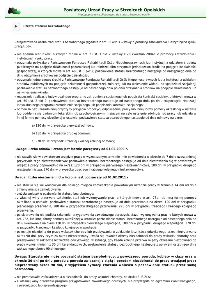 Powiatowy Urząd Pracy w Strzelcach Opolskich http://pup-strzelce.pl/strona/utrata-statusu-bezrobotnego/44 Utrata statusu bezrobotnego Zarejestrowana osoba traci status bezrobotnego (zgodnie z art. 33 ust. 4 ustawy o promocji zatrudnienia i instytucjach rynku pracy), gdy: ● ● ● ● ● nie spełnia warunków, o których mowa w art. 2 ust. 1 pkt 2 ustawy z 20 kwietnia 2004r. o promocji zatrudnienia i instytucjach rynku pracy; otrzymała pożyczkę z Państwowego Funduszu Rehabilitacji Osób Niepełnosprawnych lub instytucji z udziałem środków publicznych na podjęcie działalności pozarolniczej lub rolniczej albo otrzymała jednorazowo środki na podjęcie działalności gospodarczej, o których mowa w art. 46 ust. 1 pkt 2; pozbawienie statusu bezrobotnego następuje od następnego dnia po dniu otrzymania środków na podjęcie działalności; otrzymała jednorazowo środki z Państwowego Funduszu Rehabilitacji Osób Niepełnosprawnych lub z instytucji z udziałem środków publicznych na podjęcie działalności gospodarczej, rolniczej lub na wniesienie wkładu do spółdzielni socjalnej; pozbawienie statusu bezrobotnego następuje od następnego dnia po dniu otrzymania środków na podjęcie działalności lub na wniesienie wkładu; rozpoczęła realizację indywidualnego programu zatrudnienia socjalnego lub podpisała kontrakt socjalny, o których mowa w art. 50 ust. 2 pkt 2; pozbawienie statusu bezrobotnego następuje od następnego dnia po dniu rozpoczęcia realizacji indywidualnego programu zatrudnienia socjalnego lub podpisania kontraktu socjalnego; odmówiła bez uzasadnionej przyczyny przyjęcia propozycji odpowiedniej pracy lub innej formy pomocy określonej w ustawie lub poddania się badaniom lekarskim lub psychologicznym, mającym na celu ustalenie zdolności do pracy lub udziału w innej formie pomocy określonej w ustawie; pozbawienie statusu bezrobotnego następuje od dnia odmowy na okres: a) 120 dni w przypadku pierwszej odmowy, b) 180 dni w przypadku drugiej odmowy, c) 270 dni w przypadku trzeciej i każdej kolejnej odmowy; Uwaga: liczba odmów liczona jest łącznie począwszy od 01.02.2009 r. ● nie stawiła się w powiatowym urzędzie pracy w wyznaczonym terminie i nie powiadomiła w okresie do 7 dni o uzasadnionej przyczynie tego niestawiennictwa; pozbawienie statusu bezrobotnego następuje od dnia niestawienia się w powiatowym urzędzie pracy odpowiednio na okres: 120 dni w przypadku pierwszego niestawiennictwa, 180 dni w przypadku drugiego niestawiennictwa, 270 dni w przypadku trzeciego i każdego kolejnego niestawiennictwa. Uwaga: liczba niestawiennictw liczona jest począwszy od 01.02.2011 r. ● ● ● ● ● nie stawiła się we właściwym dla nowego miejsca zamieszkania powiatowym urzędzie pracy w terminie 14 dni od dnia zmiany miejsca zameldowania złożyła wniosek o pozbawienie statusu bezrobotnego; z własnej winy przerwała szkolenie, staż lub wykonywanie prac, o których mowa w art. 73a, lub inną formę pomocy określoną w ustawie; pozbawienie statusu bezrobotnego następuje od dnia przerwania na okres: 120 dni w przypadku pierwszego przerwania, 180 dni w przypadku drugiego przerwania, 270 dni w przypadku trzeciego i każdego kolejnego przerwania; po skierowaniu nie podjęła szkolenia, przygotowania zawodowego dorosłych, stażu, wykonywania prac, o których mowa w art. 73a, lub innej formy pomocy określonej w ustawie; pozbawienie statusu bezrobotnego następuje od następnego dnia po dniu skierowania na okres 120 dni w przypadku pierwszego niepodjęcia, 180 dni w przypadku drugiego niepodjęcia, 270 dni w przypadku trzeciego i każdego kolejnego niepodjęcia; pozostaje niezdolna do pracy wskutek choroby lub przebywania w zakładzie lecznictwa odwykowego przez nieprzerwany okres 90 dni, przy czym za okres nieprzerwany uważa się również okresy niezdolności do pracy wskutek choroby oraz przebywania w zakładzie lecznictwa odwykowego, w sytuacji, gdy każda kolejna przerwa między okresami niezdolności do pracy wynosi mniej niż 30 dni kalendarzowych; pozbawienie statusu bezrobotnego następuje z upływem ostatniego dnia wskazanego okresu 90-dniowego; Uwaga: Starosta nie może pozbawić statusu bezrobotnego, z powyższego powodu, kobiety w ciąży oraz w okresie 30 dni po dniu porodu z powodu związanej z ciążą i porodem niezdolności do pracy trwającej przez nieprzerwany okres 90 dni, z wyjątkiem sytuacji złożenia wniosku o pozbawienie statusu przez samą bezrobotną. ● ● nie przedstawiła zaświadczenia o niezdolności do pracy wskutek choroby, na druku ZUS ZLA; z własnej winy przerwała program przygotowania zawodowego dorosłych, nie przystąpiła do egzaminu kwalifikacyjnego, czeladniczego lub sprawdzającego. 1 po skierowaniu nie podjęła szkolenia, przygotowania zawodowego dorosłych, stażu, wykonywania prac, o których mowa w art. 73a, lub innej formy pomocy określonej w ustawie; pozbawienie statusu bezrobotnego następuje od następnego dnia po dniu skierowania na okres 120 dni w przypadku pierwszego niepodjęcia, 180 dni w przypadku drugiego niepodjęcia, 270 dni w przypadku trzeciego i każdego kolejnego niepodjęcia; ● pozostaje niezdolna do pracy wskutek choroby lub przebywania w zakładzie lecznictwa odwykowego przez nieprzerwany okres 90 dni, przy czym za okres nieprzerwany uważa się również okresy niezdolności do pracy wskutek choroby oraz przebywania w zakładzie lecznictwa odwykowego, w sytuacji, gdy każda kolejna przerwa między okresami niezdolności do pracy wynosi mniej niż 30 dni kalendarzowych; pozbawienie statusu bezrobotnego następuje z upływem ostatniego dnia wskazanego okresu 90-dniowego; Uwaga: Starosta nie może pozbawić statusu bezrobotnego, z powyższego powodu, kobiety w ciąży oraz w okresie 30 dni po dniu porodu z powodu związanej z ciążą i porodem niezdolności do pracy trwającej przez nieprzerwany okres 90 dni, z wyjątkiem sytuacji złożenia wniosku o pozbawie