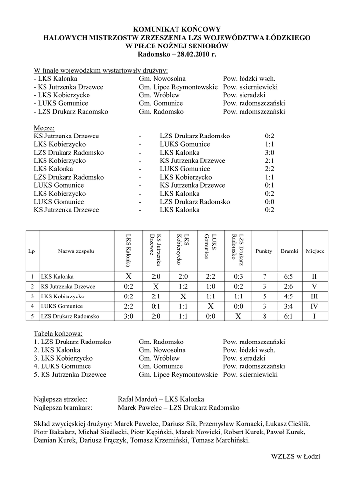 KOMUNIKAT KOŃCOWY HALOWYCH MISTRZOSTW ZRZESZENIA LZS WOJEWÓDZTWA ŁÓDZKIEGO W PIŁCE NOśNEJ SENIORÓW Radomsko – 28.02.2010 r. W finale wojewódzkim wystartowały druŜyny: - LKS Kalonka Gm. Nowosolna - KS Jutrzenka Drzewce Gm. Lipce Reymontowskie - LKS Kobierzycko Gm. Wróblew - LUKS Gomunice Gm. Gomunice - LZS Drukarz Radomsko Gm. Radomsko Mecze: KS Jutrzenka Drzewce LKS Kobierzycko LZS Drukarz Radomsko LKS Kobierzycko LKS Kalonka LZS Drukarz Radomsko LUKS Gomunice LKS Kobierzycko LUKS Gomunice KS Jutrzenka Drzewce - LZS Drukarz Radomsko LUKS Gomunice LKS Kalonka KS Jutrzenka Drzewce LUKS Gomunice LKS Kobierzycko KS Jutrzenka Drzewce LKS Kalonka LZS Drukarz Radomsko LKS Kalonka LKS Kobierzycko X 2:0 2 KS Jutrzenka Drzewce X 3 LKS Kobierzycko 4 LUKS Gomunice 5 LZS Drukarz Radomsko 0:2 0:2 2:2 3:0 2:0 1:2 Tabela końcowa: 1. LZS Drukarz Radomsko 2. LKS Kalonka 3. LKS Kobierzycko 4. LUKS Gomunice 5. KS Jutrzenka Drzewce Najlepsza strzelec: Najlepsza bramkarz: 2:1 0:1 2:0 X 1:1 1:1 LZS Drukarz Radomsko KS Jutrzenka Drzewce LKS Kalonka Nazwa zespołu 0:2 1:1 3:0 2:1 2:2 1:1 0:1 0:2 0:0 0:2 LUKS Gomunice LKS Kalonka 1 Lp Pow. łódzki wsch. Pow. skierniewicki Pow. sieradzki Pow. radomszczański Pow. radomszczański 2:2 1:0 1:1 X 0:3 0:2 1:1 0:0 0:0 X Gm. Radomsko Gm. Nowosolna Gm. Wróblew Gm. Gomunice Gm. Lipce Reymontowskie Punkty Bramki Miejsce 7 3 5 3 8 6:5 2:6 4:5 3:4 6:1 II V III IV I Pow. radomszczański Pow. łódzki wsch. Pow. sieradzki Pow. radomszczański Pow. skierniewicki Rafał Mardoń – LKS Kalonka Marek Pawelec – LZS Drukarz Radomsko Skład zwycięskiej druŜyny: Marek Pawelec, Dariusz Sik, Przemysław Kornacki, Łukasz Cieślik, Piotr Bakalarz, Michał Siedlecki, Piotr Kępiński, Marek Nowicki, Robert Kurek, Paweł Kurek, Damian Kurek, Dariusz Frączyk, Tomasz Krzemiński, Tomasz Marchiński. WZLZS w Łodzi