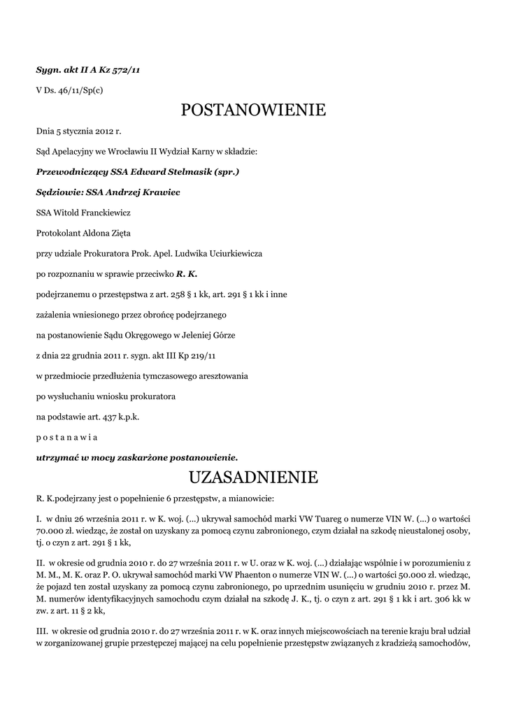 Sygn. akt II A Kz 572/11 V Ds. 46/11/Sp(c) POSTANOWIENIE Dnia 5 stycznia 2012 r. Sąd Apelacyjny we Wrocławiu II Wydział Karny w składzie: Przewodniczący SSA Edward Stelmasik (spr.) Sędziowie: SSA Andrzej Krawiec SSA Witold Franckiewicz Protokolant Aldona Zięta przy udziale Prokuratora Prok. Apel. Ludwika Uciurkiewicza po rozpoznaniu w sprawie przeciwko R. K. podejrzanemu o przestępstwa z art. 258 § 1 kk, art. 291 § 1 kk i inne zażalenia wniesionego przez obrońcę podejrzanego na postanowienie Sądu Okręgowego w Jeleniej Górze z dnia 22 grudnia 2011 r. sygn. akt III Kp 219/11 w przedmiocie przedłużenia tymczasowego aresztowania po wysłuchaniu wniosku prokuratora na podstawie art. 437 k.p.k. postanawia utrzymać w mocy zaskarżone postanowienie. UZASADNIENIE R. K.podejrzany jest o popełnienie 6 przestępstw, a mianowicie: I. w dniu 26 września 2011 r. w K. woj. (...) ukrywał samochód marki VW Tuareg o numerze VIN W. (...) o wartości 70.000 zł. wiedząc, że został on uzyskany za pomocą czynu zabronionego, czym działał na szkodę nieustalonej osoby, tj. o czyn z art. 291 § 1 kk, II. w okresie od grudnia 2010 r. do 27 września 2011 r. w U. oraz w K. woj. (...) działając wspólnie i w porozumieniu z M. M., M. K. oraz P. O. ukrywał samochód marki VW Phaenton o numerze VIN W. (...) o wartości 50.000 zł. wiedząc, że pojazd ten został uzyskany za pomocą czynu zabronionego, po uprzednim usunięciu w grudniu 2010 r. przez M. M. numerów identyfikacyjnych samochodu czym działał na szkodę J. K., tj. o czyn z art. 291 § 1 kk i art. 306 kk w zw. z art. 11 § 2 kk, III. w okresie od grudnia 2010 r. do 27 września 2011 r. w K. oraz innych miejscowościach na terenie kraju brał udział w zorganizowanej grupie przestępczej mającej na celu popełnienie przestępstw związanych z kradzieżą samochodów, ich ukrywaniem, przerabianiem numerów identyfikacyjnych, legalizacją i wprowadzeniem do obrotu, tj. o czyn z art. 258 § 1 kk, IV. w okresie pomiędzy 24 marca 2011 r. a 27 września 2011 r. w okolicach L. nabył od nieustalonej osoby części w postaci elementów nadwozia i innych układów pojazdu marki VW Caddy o numerze (...), o wartości nie mniejszej niż 1000 zł. choć na podstawie towarzyszących okoliczności powinien i mógł przypuszczać, że części te uzyskane zostały za pomocą czynu zabronionego tj. o czyn z art. 292 § 1 kk, V. w okresie pomiędzy 12 marca 2010 r. a styczniem 2011 r. na terenie K. przyjął od nieustalonej osoby samochód osobowy marki Audi TT, nr VIN (...) o wartości nie mniejszej niż 19.000 zł. wiedząc, iż pojazd ten uzyskany został za pomocą czynu zabronionego tj. o czyn z art. 291 § 1 kk, VI. w okresie pomiędzy 12 marca 2010 r.a 27 września 2011 r. na terenie K. i okolic, wspólnie i w porozumieniu z nieustaloną osobą przerobił znaki identyfikacyjne samochodu marki Audi TT w ten sposób, że wyciął z nadwozia pojazdu numer VIN (...) i wspawał w to miejsce znaki identyfikacyjne z innego pojazdu to jest numer VIN (...) (...). o czyn z art. 306 kk. Od 26 września 2011 r. stosowany jest wobec tego podejrzanego środek zapobiegawczy w postaci tymczasowego aresztowania. Postanowieniem z dnia 22.12.2011 r. Sąd Okręgowy w Jeleniej Górze przedłużył czas trwania tego środka do 15 lutego 2012 r. ( III Kp 219/11). Na postanowienie to zażalił się obrońca wymienionego podejrzanego, zarzucając błąd w ustaleniach faktycznych przez uznanie, że w sprawie występują szczególne przesłanki do przedłużenia tymczasowego aresztowania. Wniósł w konsekwencji o zmianę tego orzeczenia przez: a) nieuwzględnienie wniosku prokuratora w przedmiocie przedłużenia tymczasowego aresztowania w stosunku do R. K.; b) zastosowanie względem podejrzanego środków nieizolacyjnych w postaci: - poręczenia majątkowego w kwocie 10.000 zł. - dozoru Policji; - zakazu opuszczania Kraju. Sąd Apelacyjny zważył co następuje. Zażalenie jest niezasadne. 1. Tak oceniając wniesiony środek odwoławczy, podnieść na wstępie należy, że spełniona została w niniejszej sprawie jedna z podstawowych przesłanek, upoważniających do stosowania środków zapobiegawczych tj. zgromadzenie takich dowodów, które wskazują na duże prawdopodobieństwo popełnienia przez R. K.zarzuconych mu czynów. Podejrzany ten wprawdzie winę swą neguje, ale wersja jego pozostaje w sprzeczności z innymi dowodami w tym przede wszystkim wyjaśnieniami M. M. oraz wynikami przeszukania policyjnego przeprowadzonego 26.09.2011 r. 2. Odnosząc się do argumentów zawartych w zażaleniu stwierdzić należy, że są one niezasadne. R. K.pozostaje pod zarzutem funkcjonowania w zorganizowanej grupie przestępczej zajmującej się paserstwem skradzionych samochodów. Praktyka sądowa dowodzi, że osoby podejrzewane o takie przestępstwa podejmują rozmaite przedsięwzięcia zakłócające tok postępowania karnego. Te bezprawne działania polegają głównie na uzgadnianiu przez sprawców linii obrony oraz na wpływaniu by pozostałe oskarżone osoby, przyznające się do winy, odwołały swe wyjaśnienia. Taka postawa odnosi się zwłaszcza do tych podejrzanych, którzy nie przyznają się do stawianych im zarzutów. R. K.jest jednym z takich podejrzanych, który – co już wyżej zasygnalizowano – konsekwentnie neguje swą winę. Ponadto z praktyki sądowej wynika, że osoby takie, w obawie przed odpowiedzialnością karną ukrywają się przed organami ścigania i wymiaru sprawiedliwości. Prawdopodobieństwo takich zachowań w odniesieniu do R. K.jest o tyle realne, że wcześniej przebywał on przez dłuższy czas poza granicami Polski. Pracował – jak sam, wyjaśniał – w Anglii i Niemczech. Uznano w tej sytuacji, że tylko izolacyjny środek zapobiegawczy może w należytym stopniu zagwarantować w stosunku do podejrzanego R. K.dalszy prawidłowy tok postępowania karnego. 3. Nie sposób kwestionować także oznaczonego przez Sąd Okręg
