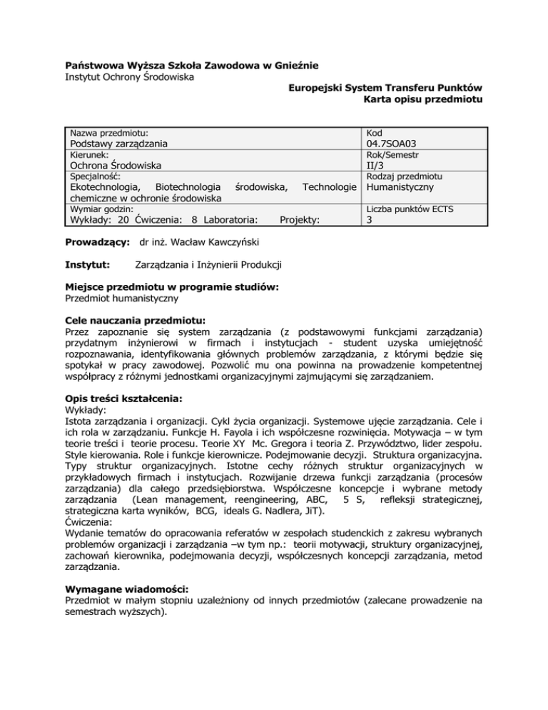 Państwowa Wyższa Szkoła Zawodowa w Gnieźnie Instytut Ochrony Środowiska Europejski System Transferu Punktów Karta opisu przedmiotu Nazwa przedmiotu: Kod Kierunek: Rok/Semestr Podstawy zarządzania 04.7SOA03 Ochrona Środowiska Specjalność: Ekotechnologia, Biotechnologia chemiczne w ochronie środowiska II/3 środowiska, Wymiar godzin: Wykłady: 20 Ćwiczenia: 8 Laboratoria: Rodzaj przedmiotu Technologie Humanistyczny Projekty: Liczba punktów ECTS 3 Prowadzący: dr inż. Wacław Kawczyński Instytut: Zarządzania i Inżynierii Produkcji Miejsce przedmiotu w programie studiów: Przedmiot humanistyczny Cele nauczania przedmiotu: Przez zapoznanie się system zarządzania (z podstawowymi funkcjami zarządzania) przydatnym inżynierowi w firmach i instytucjach - student uzyska umiejętność rozpoznawania, identyfikowania głównych problemów zarządzania, z którymi będzie się spotykał w pracy zawodowej. Pozwolić mu ona powinna na prowadzenie kompetentnej współpracy z różnymi jednostkami organizacyjnymi zajmującymi się zarządzaniem. Opis treści kształcenia: Wykłady: Istota zarządzania i organizacji. Cykl życia organizacji. Systemowe ujęcie zarządzania. Cele i ich rola w zarządzaniu. Funkcje H. Fayola i ich współczesne rozwinięcia. Motywacja – w tym teorie treści i teorie procesu. Teorie XY Mc. Gregora i teoria Z. Przywództwo, lider zespołu. Style kierowania. Role i funkcje kierownicze. Podejmowanie decyzji. Struktura organizacyjna. Typy struktur organizacyjnych. Istotne cechy różnych struktur organizacyjnych w przykładowych firmach i instytucjach. Rozwijanie drzewa funkcji zarządzania (procesów zarządzania) dla całego przedsiębiorstwa. Współczesne koncepcje i wybrane metody zarządzania (Lean management, reengineering, ABC, 5 S, refleksji strategicznej, strategiczna karta wyników, BCG, ideals G. Nadlera, JiT). Ćwiczenia: Wydanie tematów do opracowania referatów w zespołach studenckich z zakresu wybranych problemów organizacji i zarządzania –w tym np.: teorii motywacji, struktury organizacyjnej, zachowań kierownika, podejmowania decyzji, współczesnych koncepcji zarządzania, metod zarządzania. Wymagane wiadomości: Przedmiot w małym stopniu uzależniony od innych przedmiotów (zalecane prowadzenie na semestrach wyższych). Forma prowadzonych zajęć: Wykład z wykorzystaniem rzutnika. Ćwiczenia – Forma seminaryjna na tematy zadanych referatów z zarządzania. Język wykładowy: Język polski Metody oceny: Wykłady- kolokwium końcowe Ćwiczenia – ocena aktywności studentów i pisemne kolokwium końcowe Bibliografia: Podstawowa: Zarządzanie.Red. A.K. Koźmiński ,W. Piotrowski. Wydawnictwo Naukowe PWN. Warszawa 2004. J. Brilman, Nowoczesne koncepcje i metody zarządzania. PWE . Warszawa 2002. Uzupełniająca: 1. S.P. Robins., D.A. DeCenzo, Podstawy zarządzania. PWE. Warszawa 2002. 2. S.P Robins, Zachowania w organizacji. PWE. Warszawa 2004. 3. R. Quinn, Faerman, Thompson, McGraf. Profesjonalne zarządzanie. PWE. Warszawa 2007. Państwowa Wyższa Szkoła Zawodowa w Gnieźnie Instytut Ochrony Środowiska Europejski System Transferu Punktów Karta opisu przedmiotu Nazwa przedmiotu: Kod Kierunek: Rok/Semestr Zarządzanie przedsiębiorstwem 04.7SOA03 Ochrona Środowiska II/3 Specjalność: Rodzaj przedmiotu Ekotechnologia, Biotechnologia chemiczne w ochronie środowiska Wymiar godzin: Wykłady: 20 Ćwiczenia: 8 środowiska, Laboratoria: Technologie Humanistyczny Projekty: Liczba punktów ECTS 3 Prowadzący: dr inż. Wacław Kawczyński Instytut: Zarządzania i Inżynierii Produkcji Miejsce przedmiotu w programie studiów: Przedmiot humanistyczny Cele nauczania przedmiotu: Zapoznanie studentów z problemami zarządzania przedsiębiorstwem przemysłowym. Nabycie umiejętności rozpoznawania podstawowych podsystemów zarządzania w funkcjonujących firmach i instytucjach dla nawiązywania współpracy z występującymi na różnych szczeblach komórkami organizacyjnymi podczas pracy zawodowej. Opis treści kształcenia: Wykład: Zarządzanie, jego istota i znaczenie. Światowe cechy przemian społeczno-gospodarczych. Przedsiębiorstwo jako organizacja techniczno-społeczna w obrocie gospodarczym (rodzaje przedsiębiorstw, osobowość prawna, spółki prawa handlowego). Cykl życia organizacji. Cykl życia wyrobu. Metoda Ideals w projektowaniu systemowym. Struktura organizacyjna zarządzania. Główne funkcje zarządzania w przedsiębiorstwie. Piony i służby w przedsiębiorstwie. Kierownik, cechy i role kierownicze (motywacja, style kierowania).Wybrane metody zarządzania. Elementy rachunkowości i rachunku kosztów dla inżynierów (koszt własny, amortyzacja). Elementy zarządzania produkcją (partiowanie dostaw, Just in Time, zapas, obciążenie stanowisk, wydajność, istota zintegrowanego systemu zarządzania MRP/ERP). Ćwiczenia: Wprowadzenie do parametrycznego ujęcia procesów zarządzania przedsiębiorstwem. Przykładowe obliczenia z zarządzania produkcją dotyczące: 1. kosztu własnego wyrobu w przedsiębiorstwie produkcyjnym, 2. wielkości odpisów amortyzacyjnych środków trwałych metodą liniową i degresywną, 3. cyklu realizacji projektu metodą sieciową (ścieżka krytyczna), 4. liczby stanowisk roboczych i obciążenie zdolności produkcyjnej stanowiska –lub inne zamiennie. Wymagane wiadomości: Ze względu, że jest to pierwszy kontakt studentów z teoretycznymi i praktycznymi aspektami zarządzania, wystarczająca jest wiedza uzyskana w szkole średniej (matura). Forma prowadzonych zajęć: Wykłady- poparte wizualizacją na ekranie podstawowych treści. Ćwiczenia – głównie, obliczenia rachunkowe przykładowych zadań. Język wykładowy: Język polski. Metody oceny: Egzamin- w formie pisemnej z pytaniami otwartymi. Ćwiczenia – ocena aktywności studentów i pisemne kolokwium końcowe. Bibliografia: Podstawowa: 1. Wprowadzenie do nauki o przedsiębiorstwie. Red. M. Brzeziński. Difin. Warszawa 2007. 2