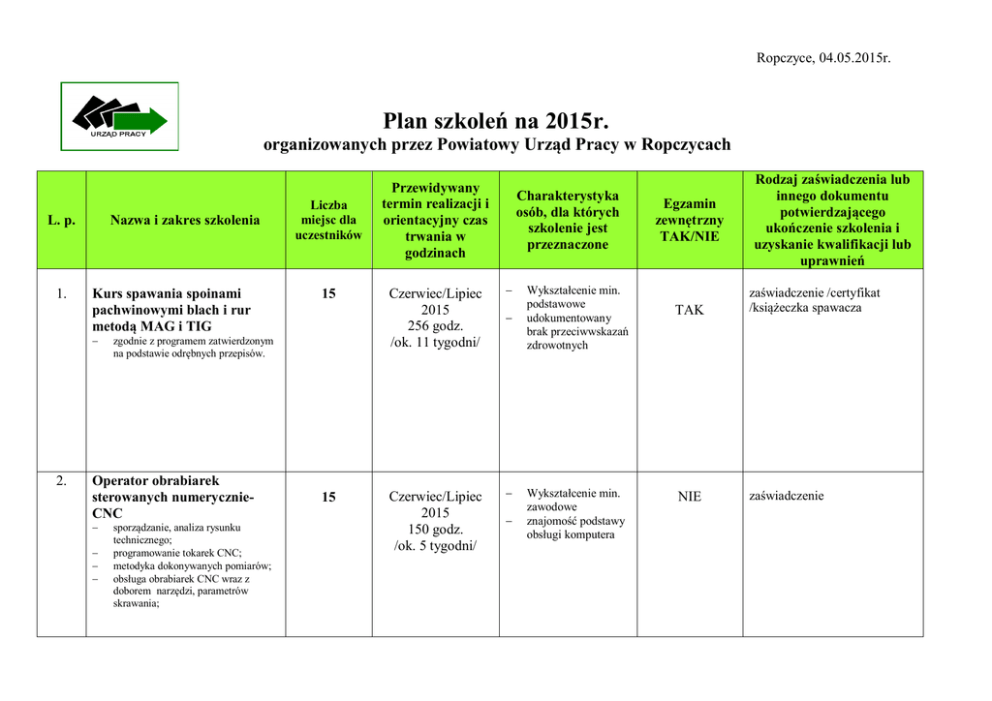 Plan szkoleń na 2015r. - Powiatowy Urząd Pracy w Ropczycach
