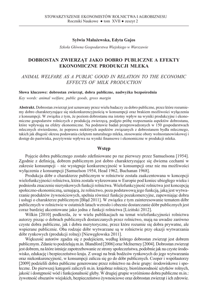 158 STOWARZYSZENIE Sylwia Małażewska, Edyta GajosEKONOMISTÓW ROLNICTWA I AGROBIZNESU Roczniki Naukowe ● tom XVII ● zeszyt 2 Sylwia Małażewska, Edyta Gajos Szkoła Główna Gospodarstwa Wiejskiego w Warszawie DOBROSTAN ZWIERZĄT JAKO DOBRO PUBLICZNE A EFEKTY EKONOMICZNE PRODUKCJI MLEKA ANIMAL WELFARE AS A PUBLIC GOOD IN RELATION TO THE ECONOMIC EFFECTS OF MILK PRODUCTION Słowa kluczowe: dobrostan zwierząt, dobra publiczne, nadwyżka bezpośrednia Key words: animal welfare, public goods, gross margin Abstrakt. Dobrostan zwierząt jest uznawany przez wielu badaczy za dobro publiczne, przez które rozumiemy dobro charakteryzujące się niekonkurencyjnością w konsumpcji oraz brakiem możliwości wyłączenia z konsumpcji. W związku z tym, że poziom dobrostanu ma istotny wpływ na wyniki produkcyjne i ekonomiczne gospodarstw rolniczych z produkcją zwierzęcą, podjęto próbę rozpoznania aspektów dobrostanu, które wpływają na efekty ekonomiczne. Na podstawie badań przeprowadzonych w 150 gospodarstwach mlecznych stwierdzono, że poprawa niektórych aspektów związanych z dobrostanem bydła mlecznego, takich jak długość okresu podawania cielętom naturalnego mleka, stosowanie obory wolnostanowiskowej i dostęp do pastwiska, pozytywnie wpływa na wyniki finansowe i ekonomiczne w produkcji mleka. Wstęp Pojęcie dobra publicznego zostało zdefiniowane po raz pierwszy przez Samuelsona [1954]. Zgodnie z definicją, dobrem publicznym jest dobro charakteryzujące się dwiema cechami w zakresie konsumpcji – nie występuje konkurencyjność w konsumpcji oraz nie ma możliwości wyłączenia z konsumpcji [Samuelson 1954, Head 1962, Buchanan 1968]. Produkcja dóbr o charakterze publicznym w rolnictwie została zaakcentowana w koncepcji wielofunkcyjności rolnictwa, która została wykreowana w Europie pod koniec ubiegłego wieku i podniosła znaczenie nierynkowych funkcji rolnictwa. Wielofunkcyjność rolnictwa jest koncepcją społeczno-ekonomiczną, uznającą, że rolnictwo, poza podstawową jego funkcją, jaką jest wytwarzanie produktów żywnościowych, spełnia również funkcje pozakomercyjne, zapewniając dobra i usługi o charakterze publicznym [Błąd 2011]. W związku z tym zainteresowanie tematem dóbr publicznych w rolnictwie w ostatnich latach wzrosło i obecnie dostarczanie dóbr publicznych jest coraz bardziej akcentowane jako jedna z funkcji rolnictwa [Liziński 2012]. Wilkin [2010] podkreśla, że w wielu publikacjach na temat wielofunkcyjności rolnictwa autorzy pisząc o dobrach publicznych dostarczanych przez rolnictwo, mają na uwadze zarówno czyste dobra publiczne, jak i dobra merytoryczne, przez które rozumie się dobra prywatne, ale wspierane publicznie. Oba rodzaje dóbr wytwarzane są w rolnictwie przy okazji wytwarzania dóbr rynkowych (produkcji rolnej) [Niewęgłowska 2011]. Większość autorów zgadza się z podejściem, według którego dobrostan zwierząt jest dobrem publicznym. Zdanie to podzielają m.in. Blandford [2006] oraz McInerney [2004]. Dobrostan zwierząt jest dobrem, na które istnieje zapotrzebowanie ze strony społeczeństwa, podobnie jak na czyste środowisko, edukację i bezpieczeństwo kraju. Z uwagi na brak bodźców rynkowych do jego wytwarzania oraz niekonkurencyjność, w konsumpcji zalicza się go do dóbr publicznych. Cooper i współautorzy [2009] podzielili dobra publiczne generowane przez rolnictwo na dwie grupy: środowiskowe i społeczne. Do pierwszej kategorii zaliczyli m.in. krajobraz rolniczy, bioróżnorodność użytków rolnych, jakość i dostępność wód i funkcjonalność gleby. W drugiej grupie wyróżniono dobra publiczne m.in.: żywotność obszarów wiejskich, bezpieczeństwo żywnościowe oraz dobrostan zwierząt i ich zdrowie. Dobrostan zwierząt jako dobro publiczne a efekty ekonomiczne produkcji mleka 159 Niektórzy autorzy kwestionują jednak zaliczenie dobrostanu zwierząt do dóbr publicznych. Część ekonomistów, m.in. Musgrave [1959] oraz Baumol [1965], umieszcza dobrostan w kategorii dóbr merytorycznych. Natomiast Mann [2005] w ogóle nie wiąże dobrostanu zwierząt ani z pojęciem dóbr wspólnych, ani wspólnych zasobów, lecz interpretuje go jako relację, która powoduje psychologiczne efekty zewnętrzne. Według Manna [2005] zapotrzebowanie zgłaszane przez konsumentów na dobrostan nie jest zatem z ekonomicznego punktu widzenia takie samo jak zapotrzebowanie na dobra środowiskowe, takie jak czyste środowisko i krajobraz rolniczy. Autorki zgadzają się z poglądami większości ekonomistów zaliczających dobrostan zwierząt do kategorii dóbr publicznych. Społeczeństwo zgłasza na niego zapotrzebowanie, producenci natomiast nie mają silnych bodźców rynkowych do jego wytwarzania, co powoduje konieczność interwencji państwa. Ponadto badania opinii w całej Europie potwierdzają bardzo silne przywiązanie całego społeczeństwa do dobrostanu zwierząt hodowlanych, a także jego zapotrzebowanie na informacje dotyczące dobrostanu zwierząt, od których pochodzi żywność [The global... 2011]. Także Parlament Europejski, który odzwierciedla głos obywateli, zaliczył dobrostan zwierząt do dóbr publicznych. W studium Parlamentu Europejskiego dobra publiczne w rolnictwie podzielono na 5 grup, gdzie jedną z nich jest właśnie dobrostan zwierząt gospodarskich [www.ec.europa.eu/ food/animal/welfare/index_en.htm]. W ramach wspólnej polityki rolnej (WPR) zachęca się rolników do zapewniania lepszych praktyk w zakresie dobrostanu zwierząt na różne sposoby, m.in. płatności dla rolników z WPR są uzależnione od przestrzegania norm w zakresie dobrostanu zwierząt. Rolnicy, którzy ich nie spełniają mogą utracić część lub całość tych płatności. WPR zapewnia dotacje dla rolników, którzy inwestują w udoskonalanie hodowli zwierząt, np. poprawę warunków w pomieszczeniach dla zwierząt. Istnieją również bodźce finansowe dla rolników podnoszących sta