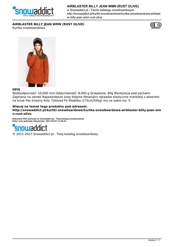 AIRBLASTER BILLY JEAN WMN (RUST OLIVE) w Snowaddict.pl - Twoim katalogu snowboardowym http://snowaddict.pl/kurtki-snowboardowe/kurtka-snowboardowa-airblast er-billy-jean-wmn-rust-olive AIRBLASTER BILLY JEAN WMN (RUST OLIVE) Kurtka snowboardowa OPIS Wodoodporność: 10,000 mm Oddychalność: 8,000 g Ocieplenie: 80g Wentylacja pod pachami Zapinana na zamek Najważniejsze szwy klejone Wewnątrz rękawów elastyczne mankiety z otworem na kciuk Pas śnieżny Krój: Tailored Fit Modelka (175cm/55kg) ma na sobie roz. S Więcej na temat tego produktu pod adresem: http://snowaddict.pl/kurtki-snowboardowe/kurtka-snowboardowa-airblaster-billy-jean-wm n-rust-olive Dokument PDF pochodzi ze Snowaddict.pl - Twój katalog snowboardowy Data i czas pobrania dokumentu: 2017-03-07 11:30:15 © 2011-2017 Snowaddict.pl - Twój katalog snowboardowy strona 1 / 1 Powered by TCPDF (www.tcpdf.org)