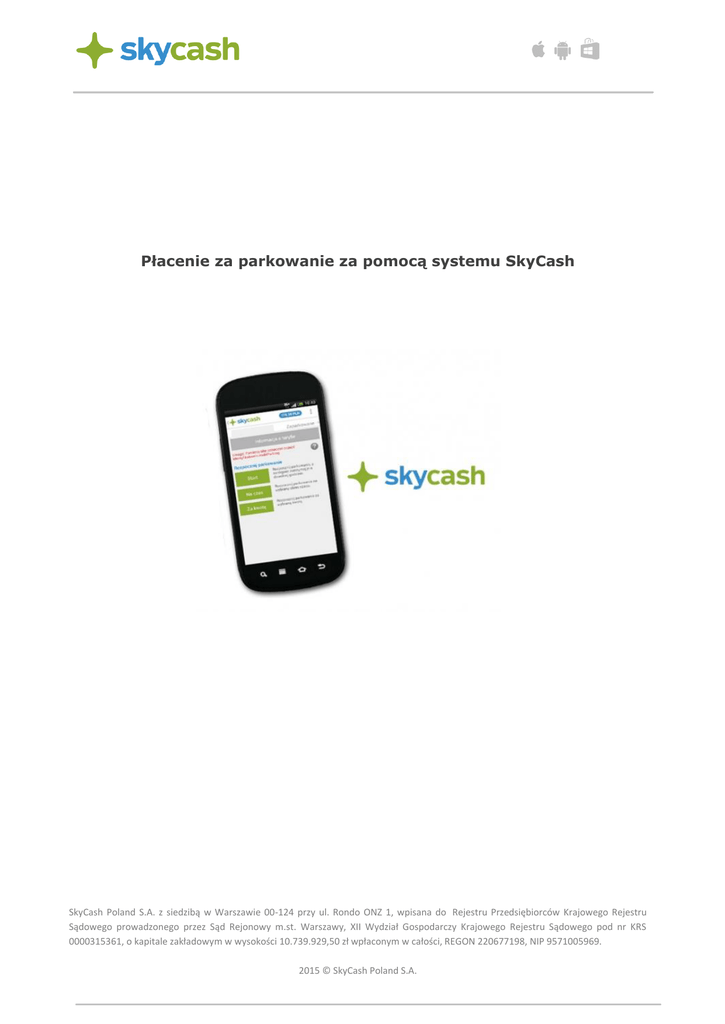 Płacenie za parkowanie za pomocą systemu SkyCash SkyCash Poland S.A. z siedzibą w Warszawie 00-124 przy ul. Rondo ONZ 1, wpisana do Rejestru Przedsiębiorców Krajowego Rejestru Sądowego prowadzonego przez Sąd Rejonowy m.st. Warszawy, XII Wydział Gospodarczy Krajowego Rejestru Sądowego pod nr KRS 0000315361, o kapitale zakładowym w wysokości 10.739.929,50 zł wpłaconym w całości, REGON 220677198, NIP 9571005969. 2015 © SkyCash Poland S.A. Wybór sposobu parkowania 1) Za pomocą aplikacji SkyCash pierwszym krokiem jest zarejestrowanie konta prywatnego, robimy to z poziomu strony SkyCash lub bezpośrednio z aplikacji pobranej na telefon następnie należy zasilić konto SkyCash środkami (za pomocą karty MasterCard/Visa, przelewem ekspresowym - Przelewy24 lub Dotpay, bądź tradycyjnym przelewem bankowym). aplikację SkyCash można pobrać na system Android (Sklep Play), Windows Phone (Sklep Windows Phone), iOS (AppleStore) SkyCash Poland S.A. z siedzibą w Warszawie 00-124 przy ul. Rondo ONZ 1, wpisana do Rejestru Przedsiębiorców Krajowego Rejestru Sądowego prowadzonego przez Sąd Rejonowy m.st. Warszawy, XII Wydział Gospodarczy Krajowego Rejestru Sądowego pod nr KRS 0000315361, o kapitale zakładowym w wysokości 10.739.929,50 zł wpłaconym w całości, REGON 220677198, NIP 9571005969. 2015 © SkyCash Poland S.A. po zainstalowaniu aplikacji na swoim urządzeniu, uruchamiamy ją używając danych do logowania uzyskanych podczas procesu rejestracji konta prywatnego i przechodzimy do głównego menu jak niżej. Wybieramy kategorię „Parkingi” a następnie formę w jakiej chcemy rozpocząć parkowanie: „Start” - parkowanie z koniecznością zatrzymania usługi przez użytkownika (parkowanie wyłącza się samoczynnie o godzinie w której przestaje obowiązywać strefa płatnego parkowania i nie rozpoczyna się automatycznie w dniu następnym) „Na czas” - parkowanie na zdefiniowany w aplikacji okres czasu, wyłącza się samo po upływie wskazanego czasu np. po 60 minutach UWAGA! Jeśli przykładowo wybierzemy parkowanie na 120 minut i nie zakończymy tego parkowania wcześniej z poziomu aplikacji a strefa płatnego parkowania działa jeszcze tylko przez 90 minut, parkowanie wyłączy się samoczynnie o godzinie która jest obrana jako koniec obowiązywania strefy płatnego parkowania. Czas jaki pozostał do „wyparkowania” to 30 minut i ten okres czasu zostanie automatycznie przeniesiony na kolejny dzień i zacznie obowiązywać od godziny rozpoczynającej strefę płatnego parkowania. Aby pozostały do „wyparkowania” czas nie został przeniesiony na kolejny dzień trzeba to parkowanie zakończyć wchodząc do kategorii „Parkingi” i zakładki „Zaparkowane” gdzie na pozycji z pojazdem klikamy „Zatrzymaj”, wtedy parkowanie nie rozpocznie się w dniu kolejnym a kwota za 30 minut parkowania zostanie zwrócona na konto SkyCash. „Za kwotę” - parkowanie na czas związane ze zdefiniowaną kwotą środków finansowych. Przy tej formie parkowania uwagi są takie same jak w przypadku wyżej opisanego parkowania „Na czas”. Po przejściu do kolejnego ekranu mamy listę z numerami rejestracyjnymi pojazdów przyporządkowanymi do naszego numeru telefonu na koncie firmowym. Wybieramy zatem pojazd, który chcemy zaparkować i klikamy „Dalej”. SkyCash Poland S.A. z siedzibą w Warszawie 00-124 przy ul. Rondo ONZ 1, wpisana do Rejestru Przedsiębiorców Krajowego Rejestru Sądowego prowadzonego przez Sąd Rejonowy m.st. Warszawy, XII Wydział Gospodarczy Krajowego Rejestru Sądowego pod nr KRS 0000315361, o kapitale zakładowym w wysokości 10.739.929,50 zł wpłaconym w całości, REGON 220677198, NIP 9571005969. 2015 © SkyCash Poland S.A. Aby zakończyć uruchomione parkowanie wybieramy kategorię „Parkingi” następnie klikamy w zakładkę „Zaparkowane”. Na kolejnym ekranie wyświetli nam się pozycja z zaparkowanym pojazdem, klikamy w pozycję z pojazdem aby potwierdzić chęć zakończenia parkowania po czym na kolejnej stronie akceptujemy zakończenie parkowania przyciskiem „Potwierdź”. Zakończenie parkowania obwieszcza nam informacja o zatrzymaniu parkowania wyświetlana na samym końcu. Po naciśnięciu przycisku „Dalej” przechodzimy do głównego menu aplikacji. Zakończenie parkowania będzie dodatkowo potwierdzone przez sms jaki zostaje wysłany na numer z którego parkowanie zostało uruchomione. SkyCash Poland S.A. z siedzibą w Warszawie 00-124 przy ul. Rondo ONZ 1, wpisana do Rejestru Przedsiębiorców Krajowego Rejestru Sądowego prowadzonego przez Sąd Rejonowy m.st. Warszawy, XII Wydział Gospodarczy Krajowego Rejestru Sądowego pod nr KRS 0000315361, o kapitale zakładowym w wysokości 10.739.929,50 zł wpłaconym w całości, REGON 220677198, NIP 9571005969. 2015 © SkyCash Poland S.A. 2) Parkowanie za pomocą SMS Parkowanie przy użyciu komend SMS odbywa się przez wysłanie odpowiedniej treści na numer 82002. Po wysłaniu wiadomości rozpoczynającej lub kończącej parkowanie, użytkownik otrzymuje darmowego SMS-a potwierdzającego rozpoczęcie lub zakończenie parkowania. Tworzymy nową wiadomość o treści ANDA (Andrychów Rynek) lub ANDB (Andrychów 1go Maja). Wysyłamy ją na numer 82002, po czym dostajemy potwierdzenie, że parkowanie dla naszego pojazdu zostało rozpoczęte. Parkowanie zostaje zakończone gdy wyślemy kolejnego SMSa tym razem o treści K na ten sam numer 82002, po czym również otrzymamy SMSa, tym razem potwierdzającego zakończenie parkowania dla naszego pojazdu. SkyCash Poland S.A. z siedzibą w Warszawie 00-124 przy ul. Rondo ONZ 1, wpisana do Rejestru Przedsiębiorców Krajowego Rejestru Sądowego prowadzonego przez Sąd Rejonowy m.st. Warszawy, XII Wydział Gospodarczy Krajowego Rejestru Sądowego pod nr KRS 0000315361, o kapitale zakładowym w wysokości 10.739.929,50 zł wpłaconym w całości, REGON 220677198, NIP 9571005969. 2015 © SkyCash Poland S.A. Koszt wysłania jed