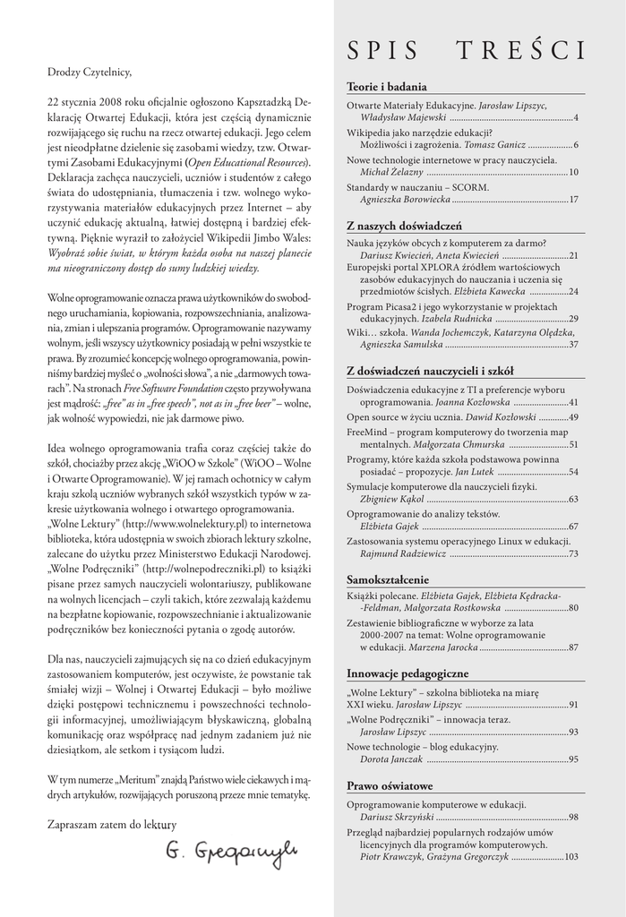 Drodzy Czytelnicy, 22 stycznia 2008 roku oficjalnie ogłoszono Kapsztadzką Deklarację Otwartej Edukacji, która jest częścią dynamicznie rozwijającego się ruchu na rzecz otwartej edukacji. Jego celem jest nieodpłatne dzielenie się zasobami wiedzy, tzw. Otwartymi Zasobami Edukacyjnymi (Open Educational Resources). Deklaracja zachęca nauczycieli, uczniów i studentów z całego świata do udostępniania, tłumaczenia i tzw. wolnego wykorzystywania materiałów edukacyjnych przez Internet – aby uczynić edukację aktualną, łatwiej dostępną i bardziej efektywną. Pięknie wyraził to założyciel Wikipedii Jimbo Wales: Wyobraź sobie świat, w którym każda osoba na naszej planecie ma nieograniczony dostęp do sumy ludzkiej wiedzy. Wolne oprogramowanie oznacza prawa użytkowników do swobodnego uruchamiania, kopiowania, rozpowszechniania, analizowania, zmian i ulepszania programów. Oprogramowanie nazywamy wolnym, jeśli wszyscy użytkownicy posiadają w pełni wszystkie te prawa. By zrozumieć koncepcję wolnego oprogramowania, powinniśmy bardziej myśleć o „wolności słowa”, a nie „darmowych towarach”. Na stronach Free Software Foundation często przywoływana jest mądrość: „free” as in „free speech”, not as in „free beer” – wolne, jak wolność wypowiedzi, nie jak darmowe piwo. Idea wolnego oprogramowania trafia coraz częściej także do szkół, chociażby przez akcję „WiOO w Szkole” (WiOO – Wolne i Otwarte Oprogramowanie). W jej ramach ochotnicy w całym kraju szkolą uczniów wybranych szkół wszystkich typów w zakresie użytkowania wolnego i otwartego oprogramowania. „Wolne Lektury” (http://www.wolnelektury.pl) to internetowa biblioteka, która udostępnia w swoich zbiorach lektury szkolne, zalecane do użytku przez Ministerstwo Edukacji Narodowej. „Wolne Podręczniki” (http://wolnepodreczniki.pl) to książki pisane przez samych nauczycieli wolontariuszy, publikowane na wolnych licencjach – czyli takich, które zezwalają każdemu na bezpłatne kopiowanie, rozpowszechnianie i aktualizowanie podręczników bez konieczności pytania o zgodę autorów. Dla nas, nauczycieli zajmujących się na co dzień edukacyjnym zastosowaniem komputerów, jest oczywiste, że powstanie tak śmiałej wizji – Wolnej i Otwartej Edukacji – było możliwe dzięki postępowi technicznemu i powszechności technologii informacyjnej, umożliwiającym błyskawiczną, globalną komunikację oraz współpracę nad jednym zadaniem już nie dziesiątkom, ale setkom i tysiącom ludzi. W tym numerze „Meritum” znajdą Państwo wiele ciekawych i mądrych artykułów, rozwijających poruszoną przeze mnie tematykę. Zapraszam zatem do lektury SPIS TREŚCI Teorie i badania Otwarte Materiały Edukacyjne. Jarosław Lipszyc, Władysław Majewski ......................................................4 Wikipedia jako narzędzie edukacji? Możliwości i zagrożenia. Tomasz Ganicz ...................6 Nowe technologie internetowe w pracy nauczyciela. Michał Żelazny ............................................................10 Standardy w nauczaniu – SCORM. Agnieszka Borowiecka ...................................................17 Z naszych doświadczeń Nauka języków obcych z komputerem za darmo? Dariusz Kwiecień, Aneta Kwiecień .............................21 Europejski portal XPLORA źródłem wartościowych zasobów edukacyjnych do nauczania i uczenia się przedmiotów ścisłych. Elżbieta Kawecka .................24 Program Picasa2 i jego wykorzystanie w projektach edukacyjnych. Izabela Rudnicka ................................29 Wiki… szkoła. Wanda Jochemczyk, Katarzyna Olędzka, Agnieszka Samulska ......................................................7 Z doświadczeń nauczycieli i szkół Doświadczenia edukacyjne z TI a preferencje wyboru oprogramowania. Joanna Kozłowska ........................41 Open source w życiu ucznia. Dawid Kozłowski .............49 FreeMind – program komputerowy do tworzenia map mentalnych. Małgorzata Chmurska ..........................1 Programy, które każda szkoła podstawowa powinna posiadać – propozycje. Jan Lutek ...............................4 Symulacje komputerowe dla nauczycieli fizyki. Zbigniew Kąkol ..............................................................6 Oprogramowanie do analizy tekstów. Elżbieta Gajek ................................................................67 Zastosowania systemu operacyjnego Linux w edukacji. Rajmund Radziewicz ....................................................7 Samokształcenie Książki polecane. Elżbieta Gajek, Elżbieta Kędracka-Feldman, Małgorzata Rostkowska ............................80 Zestawienie bibliograficzne w wyborze za lata 2000-2007 na temat: Wolne oprogramowanie w edukacji. Marzena Jarocka .......................................87 Innowacje pedagogiczne „Wolne Lektury” – szkolna biblioteka na miarę XXI wieku. Jarosław Lipszyc .............................................91 „Wolne Podręczniki” – innowacja teraz. Jarosław Lipszyc .............................................................9 Nowe technologie – blog edukacyjny. Dorota Janczak ..............................................................9 Prawo oświatowe Oprogramowanie komputerowe w edukacji. Dariusz Skrzyński ..........................................................98 Przegląd najbardziej popularnych rodzajów umów licencyjnych dla programów komputerowych. Piotr Krawczyk, Grażyna Gregorczyk .......................10 Teorie i badania OTWARTE MATERIAŁY EDUKACYJNE Jarosław Lipszyc, Władysław Majewski Przyszłością edukacji jest otwartość i dostępność. MERITUM 4 (11) / 2008 W czasach społeczeństwa informacyjnego dostęp do wiedzy odgrywa szczególną rolę w budowaniu kapitału społecznego, innowacyjności gospodarki i efektywności sektora edukacyjnego. Nowoczesne technologie umożliwiły radykalne obniżenie kosztów i zniesieni