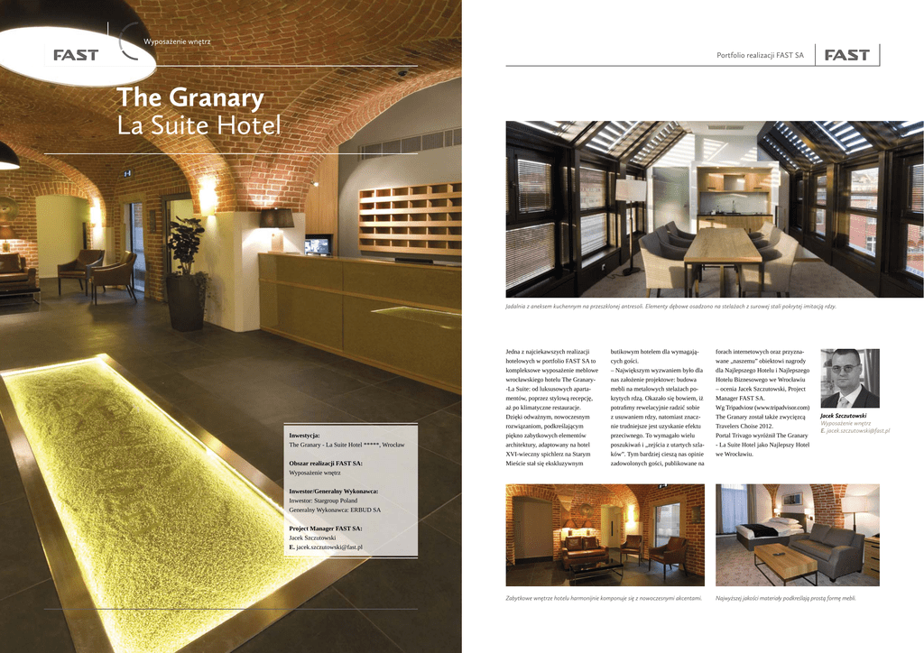 Wyposażenie wnętrz Portfolio realizacji FAST SA The Granary La Suite Hotel Jadalnia z aneksem kuchennym na przeszklonej antresoli. Elementy dębowe osadzono na stelażach z surowej stali pokrytej imitacją rdzy. Inwestycja: The Granary - La Suite Hotel *****, Wrocław Obszar realizacji FAST SA: Wyposażenie wnętrz Jedna z najciekawszych realizacji hotelowych w portfolio FAST SA to kompleksowe wyposażenie meblowe wrocławskiego hotelu The Granary-La Suite: od luksusowych apartamentów, poprzez stylową recepcję, aż po klimatyczne restauracje. Dzięki odważnym, nowoczesnym rozwiązaniom, podkreślającym piękno zabytkowych elementów architektury, adaptowany na hotel XVI-wieczny spichlerz na Starym Mieście stał się ekskluzywnym butikowym hotelem dla wymagających gości. – Największym wyzwaniem było dla nas założenie projektowe: budowa mebli na metalowych stelażach pokrytych rdzą. Okazało się bowiem, iż potrafimy rewelacyjnie radzić sobie z usuwaniem rdzy, natomiast znacznie trudniejsze jest uzyskanie efektu przeciwnego. To wymagało wielu poszukiwań i „zejścia z utartych szlaków”. Tym bardziej cieszą nas opinie zadowolonych gości, publikowane na forach internetowych oraz przyznawane „naszemu” obiektowi nagrody dla Najlepszego Hotelu i Najlepszego Hotelu Biznesowego we Wrocławiu – ocenia Jacek Szczutowski, Project Manager FAST SA. Wg Tripadviosr (www.tripadvisor.com) The Granary został także zwycięzcą Travelers Choise 2012. Portal Trivago wyróżnił The Granary - La Suite Hotel jako Najlepszy Hotel we Wrocławiu. Jacek Szczutowski Wyposażenie wnętrz E. [email protected] Inwestor/Generalny Wykonawca: Inwestor: Stargroup Poland Generalny Wykonawca: ERBUD SA Project Manager FAST SA: Jacek Szczutowski E. [email protected] Zabytkowe wnętrze hotelu harmonijnie komponuje się z nowoczesnymi akcentami. Najwyższej jakości materiały podkreślają prostą formę mebli.