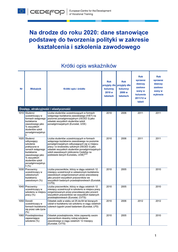 N Na dro odze do o roku u 2020 0: dane e stan owiąc ce p podsta awę do o tworzzenia polityki w za akresiie kszttałcenia i szzkolenia zaw wodow wego Krótki K op pis wsk kaźników Rok Rok d przyjęty dlla przyjęty dla Nr W Wskaźnik Krótki K opis i źró ódło kolumny kolumnyy 2010 w 2006 w tabelach h tabelach Rok Rok k z sprawoz sprawo oz dawczy y dawczzy zastoso o zastos so wany w wany w kolumnie sie wykres 2011/12 w tabeli Dostęp, a atrakcyjność ć i elastyczn ność 1010 Studen nci uczestniczący w formacch wstępnego kształccenia zawodowego jako % wszystkich ntów szkół studen ponadg gimnazjalnyc h 1020 Studen nci odbyw wający nie szkolen praktycczne w ramach h wstępnego kształccenia zawodowego jako % wszystkich ntów szkół studen ponadg gimnazjalnyc h (%) 1030 Pracow wnicy uczestniczący w ustawiccznym kształcceniu zawodowym (%) Liczba studentów L w uczestniczącyych w formach w wstępnego kszta ałcenia zawodow wego (IVET) na p poziomie ponadg gimnazjalnym (I SCED 3) jako o odsetek wszystk kich studentów sszkół p ponadgimnazjaln nych (Eurostat, UOE) 2010 2006 2011 2011 Liczba studentów L w uczestniczącyych w formach w wstępnego kszta ałcenia zawodow wego na poziom mie p ponadgimnazjaln nym odbywającyych się w miejsc cu p pracy i w środow wisku szkolnym ((ISCED 3) jako o odsetek wszystk kich studentów p ponadgimnazjaln nych s szkół zawodowy ych (obliczenia C Cedefop na (a)(b) p podstawie danyc ch Eurostatu, UO OE) 2010 2006 2011 2011 Liczba pracowników, którzy w ciiągu ostatnich 12 L m miesięcy uczestn niczyli w ustawiccznym kształcen niu z zawodowym zorrganizowanym p przez pracodawc cę jako procent wsz zystkich pracow ników we w wszystkich bada anych przedsięb iorstwach (Euro ostat, C CVTS) 1040 Pracow wnicy L Liczba pracowników, którzy w ciiągu ostatnich 12 uczestniczący w m miesięcy uczestn niczyli w szkolen niu w miejscu prracy niu w miejscu zorganizowanym z m przez pracoda awcę jako procen nt szkolen pracy ((%) w wszystkich praco owników we wszzystkich badany ych p przedsiębiorstwa ach (Eurostat, C CVTS) 1050 Dorośli O Odsetek osób w wieku od 25 do o 64 lat biorących u udział w kształce eniu lub szkolen niu w ciągu ostattnich uczestniczący w c tygodnii przed badaniem m (Eurostat, LFS S) formacch kształcenia czterech się przzez całe życie (%) 1060 Przedssiębiorstwa O Odsetek przedsiiębiorstw, które zzapewniły swoim m zapew wniające p pracownikom do owolny rodzaj szzkolenia nie (%) szkolen z zawodowego w ciągu ostatnich 12 miesięcy ( (Eurostat, CVTS S) 2010 2005 2010 0 2010 2005 2010 0 2010 2006 2010 2005 2012 2012 2 2010 0 1 Rok Rok przyjęty dla przyjęty dla Nr Wskaźnik Krótki opis i źródło kolumny kolumny 2010 w 2006 w tabelach tabelach Rok Rok sprawoz sprawoz dawczy dawczy zastoso zastoso wany w wany w kolumnie wykresie 2011/12 w tabeli 1070 Kobiety kształcące się w ramach wstępnego kształcenia zawodowego jako % wszystkich kobiet kształcących się w szkołach ponadgimnazjalnyc h 1080 Udział młodych absolwentów form kształcenia i szkolenia zawodowego w dalszym kształceniu i szkoleniu (%) 1090 Udział osób starszych w kształceniu się przez całe życie (%) 1100 Udział osób dorosłych o niskim poziomie wykształcenia w kształceniu się przez całe życie (%) 1110 Udział osób bezrobotnych w kształceniu się przez całe życie (%) 1120 Osoby, które chciały uczestniczyć w szkoleniu, ale tego nie zrobiły (%) 1130 Pozaformalne zajęcia edukacyjne i szkoleniowe związane z pracą (%) Liczba kobiet kształcących się w ponadgimnazjalnych szkołach zawodowych (ISCED 3) jako procent wszystkich kobiet kształcących się w szkołach ponadgimnazjalnych (Eurostat, UOE) 2010 Odsetek osób w wieku od 18 do 24 lat z wykształceniem nie wyższym niż średnie zawodowe (ISCED 3 lub 4), które w ciągu czterech tygodni poprzedzających badanie uczestniczyły w kształceniu i szkoleniu (obliczenia Cedefop na (a) podstawie danych Eurostatu, LFS - 2009 AHM) 2009 Odsetek osób w wieku od 50 do 64 lat, które w ciągu czterech tygodni poprzedzających badanie uczestniczyli w kształceniu i szkoleniu (obliczenia Cedefop na podstawie danych Eurostatu, LFS) 2010 2006 2012 2012 Odsetek osób w wieku od 25 do 64 lat o najniższym wykształceniu (ISCED 0-2), które w ciągu czterech tygodni poprzedzających badanie uczestniczyli w formach kształcenia się i szkolenia (Eurostat, LFS) 2010 2006 2012 2012 Odsetek bezrobotnych w wieku od 25 do 64 lat, którzy uczestniczyli w formach kształcenia się i szkolenia w ciągu czterech tygodni poprzedzających badanie (Eurostat, LFS) 2010 2006 2012 2012 Odsetek osób w wieku 25-64 l., które chciały uczestniczyć w kształceniu się lub szkoleniu, ale tego nie zrobiły (Eurostat, AES) 2011 2007 2011 2011 2007 2011 Nakłady publiczne na kształcenie zawodowe na poziomie ponadgimnazjalnym i policealnym (a)(b) (ISCED 3 i 4) jako procent PKB (Eurostat, UOE) 2010 2006 2010 Nakłady publiczne na kształcenie zawodowe na poziomie ponadgimnazjalnym i policealnym (ISCED 3 i 4) w EUR na rekrutowanego studenta (a)(b) (Eurostat, UOE) 2010 2006 2010 Pozaformalne zajęcia edukacyjne i szkoleniowe związane z pracą jako % wszystkich pozaformalnych zajęć edukacyjnych i szkoleniowych. Wskaźnik obejmuje zajęcia odbywane przez dorosłych w wieku 25-64 lat w ciągu 12 miesięcy poprzedzających badanie 2006 2011 2011 2009 Rozwój umiejętności i kształcenie dostosowane do potrzeb rynku pracy 2010 Nakłady publiczne na wstępne kształcenie i szkolenie zawodowe (% PKB) 2020 Nakłady publiczne na wstępne kształcenie i szkolenie zawodowe (EUR na studenta) 2 Rok Rok przyjęty dla przyjęty dla Nr Wskaźnik Krótki opis i źródło kolumny kolumny 2010 w 2006 w tabelach tabelach Rok Rok sprawoz sprawoz dawczy dawczy zastoso zastoso wany w wany w kolumnie wykresie 2011/12 w tabeli 2030 Nakłady przedsiębiorstw na ustawiczne szkolenie zawodowe jako % całkowitych kosztów pracy 2040 
