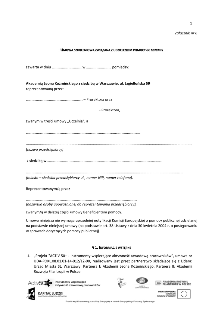1 Załącznik nr 6 UMOWA SZKOLENIOWA ZWIĄZANA Z UDZIELENIEM POMOCY DE MINIMIS zawarta w dniu ……………………………w ……………………… pomiędzy: Akademią Leona Koźmińskiego z siedzibą w Warszawie, ul. Jagiellońska 59 reprezentowaną przez: ……………………………………………………. – Prorektora oraz …………………………………………………………………….- Prorektora, zwanym w treści umowy „Uczelnią”, a …………………………………………………………………………………………………………... ................................................................................................................................................................... (nazwa przedsiębiorcy) z siedzibą w ………………………………………………………………………………………………………...… ……………….....................................................................................................................................….. (miasto – siedziba przedsiębiorcy ul., numer NIP, numer telefonu), Reprezentowanym/ą przez ………………………………………………………………………………………………………… (nazwisko osoby upoważnionej do reprezentowania przedsiębiorcy), zwanym/ą w dalszej części umowy Beneficjentem pomocy. Umowa niniejsza nie wymaga uprzedniej notyfikacji Komisji Europejskiej o pomocy publicznej udzielanej na podstawie niniejszej umowy (na podstawie art. 38 Ustawy z dnia 30 kwietnia 2004 r. o postępowaniu w sprawach dotyczących pomocy publicznej). § 1. INFORMACJE WSTĘPNE 1. „Projekt "ACTIV 50+ - instrumenty wspierające aktywność zawodową pracowników", umowa nr UDA-POKL.08.01.01-14-012/12-00, realizowany jest przez partnerstwo składające się z Lidera: Urząd Miasta St. Warszawy, Partnera I: Akademii Leona Koźmińskiego, Partnera II: Akademii Rozwoju Filantropii w Polsce. 2 2. Projekt jest współfinansowany ze środków Unii Europejskiej w ramach Europejskiego Funduszu Społecznego - Program Operacyjny Kapitał Ludzki, Priorytetu VIII Regionalne Kadry Gospodarki Programu Operacyjnego Kapitał Ludzki 2007-2013, Działania 8.1 Rozwój pracowników i przedsiębiorstw w regionie, Poddziałania 8.1.1 Wspieranie rozwoju kwalifikacji zawodowych i doradztwo dla przedsiębiorstw. 3. Zgodnie z założeniami projektu „Uczelnia” przeprowadzi testowanie produktu innowacyjnego w formie szkoleń i doradztwa, których uczestnikami będą pracujące osoby po 50 roku życia zatrudnione w małych i średnich przedsiębiorstwach na terenie Warszawy i woj. mazowieckiego. 4. Przez pracownika, zgodnie z definicją zawartą w Rozporządzeniu Ministra Rozwoju Regionalnego z dnia 15 grudnia 2010 r. w sprawie udzielania pomocy publicznej w ramach POKL, należy rozumieć następujące kategorie osób: a. pracownika w rozumieniu art. 2 ustawy z dnia 26 czerwca 1974 r. – Kodeks Pracy, tj. osobę zatrudnioną na podstawie umowy o pracę, powołania, wyboru, mianowania lub spółdzielczej umowy o pracę, b. właściciela, pełniącego funkcje kierownicze, c. wspólnika, w tym partnera prowadzącego regularną działalność w przedsiębiorstwie i czerpiącego z niego korzyści finansowe. 2. Pracodawca kierujący pracownika do udziału w projekcie otrzymuje pomoc publiczną, na podstawie art. 21 ust. 3 ustawy z dnia 6 grudnia 2006 r. o zasadach prowadzenia polityki rozwoju (Dz. U. z 2009r. Nr 84, poz. 712 i Nr 157, poz. 1241) i Rozporządzenia Ministra Rozwoju Regionalnego z dnia 15 grudnia 2010 r. w sprawie udzielania pomocy publicznej w ramach Programu Operacyjnego Kapitał Ludzki (Dz. U. z 2010 r Nr 239, poz. 1598). 3. Numer referencyjny programu pomocowego to: SA.32222 (2011/X) § 2. UDZIAŁ W SZKOLENIU 1. Pracownik/pracownicy Beneficjenta pomocy wezmą udział w szkoleniu oraz doradztwie w zakresie „.................................................................................................” w ramach projektu pt. „ACTIV 50+ instrumenty wspierające aktywność zawodową pracowników”. 2. Pracownicy kierowani na szkolenie to: 1) .................................................................... – PESEL: ......................................... 2) .................................................................... – PESEL: ......................................... 3) .................................................................... – PESEL: ......................................... 3 3. Beneficjent pomocy oświadcza, iż osoby wymienione w ust. 2 są jego pracownikami w rozumieniu §1ust. 4. 4. Szkolenie odbędzie się w ................................... w terminie od ........................ do ........................ i obejmie: a. Szkolenie „...................................................................................” (….. godzin) b. Usług doradcza (średnio 1 godzina doradztwa/osobę), § 3. WKŁAD PRYWATNY 1.Pracodawca - Beneficjent pomocy - oświadcza, nie może wnieść wkładu własnego w gotówce lub w wynagrodzeniu pracownika i że chce korzystać w projekcie z pomocy de minimis obejmującej 100% dofinansowania kosztów szkolenia. 2. Obowiązkiem „Uczelni” jako realizatora projektu jest wystawienie Beneficjentowi pomocy zaświadczenia o udzielonej pomocy de minimis. § 4. KOSZT SZKOLENIA 1. Cena szkolenia, o którym mowa w §2 na jednego pracownika, objęta regułami pomocy de minimis wynosi: …………. zł 2. Beneficjent pomocy oświadcza, iż jest małym lub średnim przedsiębiorstwem1 (zgodnie z kryteriami zawartymi w załączniku nr I do Rozporządzenia Komisji (WE) nr 800/2008 z dnia 06.08.2008). § 5. OBOWIĄZKI STRON 1. Do obowiązków „Uczelni” w ramach realizacji niniejszej Umowy należy: a. zapewnienie wykwalifikowanych trenerów do przeprowadzenia szkoleń, b. zapewnienie materiałów szkoleniowych, c. przeszkolenie uczes