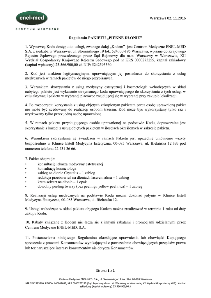 Warszawa 02. 11.2016 Regulamin PAKIETU „PIEKNE DŁONIE” 1. Wystawcą Kodu dostępu do usługi, zwanego dalej „Kodem” jest Centrum Medyczne ENEL-MED S.A. z siedzibą w Warszawie, ul. Słomińskiego 19 lok. 524, 00-195 Warszawa, wpisane do Krajowego Rejestru Sądowego prowadzonego przez Sąd Rejonowy dla m.st. Warszawy w Warszawie, XII Wydział Gospodarczy Krajowego Rejestru Sądowego pod nr KRS 0000275255, kapitał zakładowy (kapitał wpłacony) 23.566.900,00 zł, NIP: 5242593360. 2. Kod jest znakiem legitymacyjnym, uprawniającym jej posiadacza do skorzystania z usług medycznych w ramach pakietów do niego przypisanych. 3. Warunkiem skorzystania z usług medycyny estetycznej i kosmetologii wchodzących w skład nabytego pakietu jest wykazanie otrzymanego kodu uprawniającego do skorzystania z tych usług, w celu aktywacji pakietu w wybranej placówce znajdującej się w wybranej przy zakupie lokalizacji. 4. Po rozpoczęciu korzystania z usług objętych zakupionym pakietem przez osobę uprawnioną pakiet nie może być scedowany do realizacji osobom trzecim. Kod może być wykorzystany tylko raz i użytkowany tylko przez jedną osobę uprawnioną. 5. W ramach pakietu przysługującego osobie uprawnionej na podstawie Kodu, dopuszczalne jest skorzystanie z każdej z usług objętych pakietem w ilościach określonych w zakresie pakietu. 6. Warunkiem skorzystania ze świadczeń w ramach Pakietu jest uprzednie umówienie wizyty bezpośrednio w Klinice Estell Medycyna Estetyczna, 00-085 Warszawa, ul. Bielańska 12 lub pod numerem telefonu 22 431 36 66. 7. Pakiet obejmuje: • konsultację lekarza medycyny estetycznej • konsultację kosmetologa • zabieg na dłonie Crystalis – 1 zabieg • redukcja przebarwień na dłoniach laserem alma – 1 zabieg • krem selvert na dłonie – 1 opak • dowolny peeling twarzy (bez peelingu yellow peel i tca) – 1 zabieg 8. Realizacji usług medycznych na podstawie Kodu można dokonać jedynie w Klinice Estell Medycyna Estetyczna, 00-085 Warszawa, ul. Bielańska 12. 9. Usługi wchodzące w skład pakietu objętego Kodem można zrealizować w terminie 1 roku od daty zakupu Kodu. 10. Rabaty związane z Kodem nie łączą się z innymi rabatami i promocjami udzielanymi przez Centrum Medyczne ENEL-MED. S.A. 11. Postanowienia niniejszego Regulaminu określające uprawnienia lub obowiązki Kupującego sprzecznie z prawami Konsumentów wynikającymi z powszechnie obowiązujących przepisów prawa lub też naruszające interesy konsumentów nie dotyczą Konsumentów. Strona 1 z 1 Centrum Medyczne ENEL-MED S.A., ul. Słomińskiego 19 lok. 524, 00-195 Warszawa NIP 5242593360, REGON 140802685, KRS 0000275255 (Sąd Rejonowy dla m. st. Warszawy w Warszawie, XII Wydział Gospodarczy KRS). Kapitał zakładowy (kapitał wpłacony) 23.566.900,00 zł