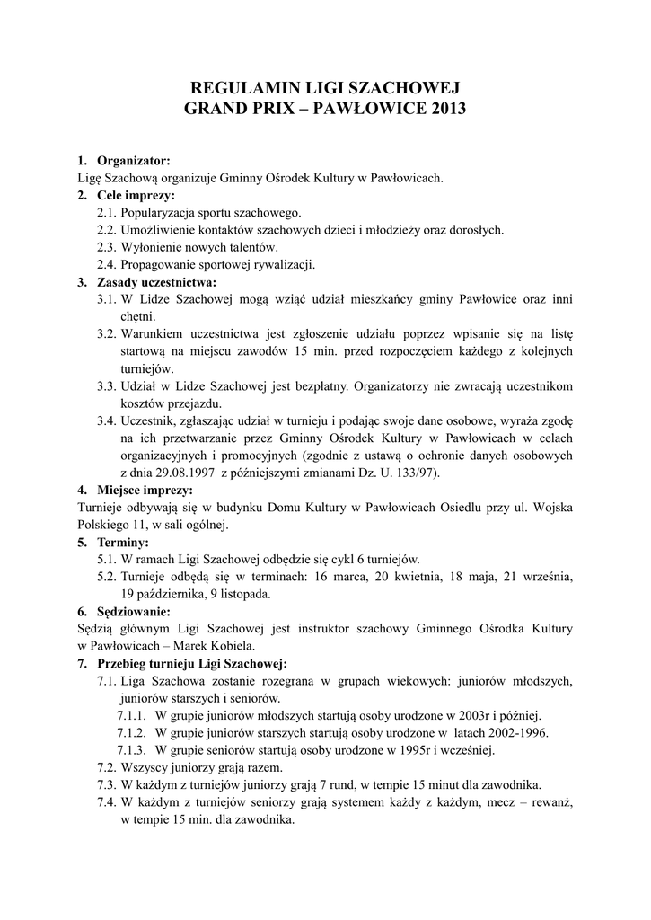 REGULAMIN LIGI SZACHOWEJ GRAND PRIX – PAWŁOWICE 2013 1. Organizator: Ligę Szachową organizuje Gminny Ośrodek Kultury w Pawłowicach. 2. Cele imprezy: 2.1. Popularyzacja sportu szachowego. 2.2. Umożliwienie kontaktów szachowych dzieci i młodzieży oraz dorosłych. 2.3. Wyłonienie nowych talentów. 2.4. Propagowanie sportowej rywalizacji. 3. Zasady uczestnictwa: 3.1. W Lidze Szachowej mogą wziąć udział mieszkańcy gminy Pawłowice oraz inni chętni. 3.2. Warunkiem uczestnictwa jest zgłoszenie udziału poprzez wpisanie się na listę startową na miejscu zawodów 15 min. przed rozpoczęciem każdego z kolejnych turniejów. 3.3. Udział w Lidze Szachowej jest bezpłatny. Organizatorzy nie zwracają uczestnikom kosztów przejazdu. 3.4. Uczestnik, zgłaszając udział w turnieju i podając swoje dane osobowe, wyraża zgodę na ich przetwarzanie przez Gminny Ośrodek Kultury w Pawłowicach w celach organizacyjnych i promocyjnych (zgodnie z ustawą o ochronie danych osobowych z dnia 29.08.1997 z późniejszymi zmianami Dz. U. 133/97). 4. Miejsce imprezy: Turnieje odbywają się w budynku Domu Kultury w Pawłowicach Osiedlu przy ul. Wojska Polskiego 11, w sali ogólnej. 5. Terminy: 5.1. W ramach Ligi Szachowej odbędzie się cykl 6 turniejów. 5.2. Turnieje odbędą się w terminach: 16 marca, 20 kwietnia, 18 maja, 21 września, 19 października, 9 listopada. 6. Sędziowanie: Sędzią głównym Ligi Szachowej jest instruktor szachowy Gminnego Ośrodka Kultury w Pawłowicach – Marek Kobiela. 7. Przebieg turnieju Ligi Szachowej: 7.1. Liga Szachowa zostanie rozegrana w grupach wiekowych: juniorów młodszych, juniorów starszych i seniorów. 7.1.1. W grupie juniorów młodszych startują osoby urodzone w 2003r i później. 7.1.2. W grupie juniorów starszych startują osoby urodzone w latach 2002-1996. 7.1.3. W grupie seniorów startują osoby urodzone w 1995r i wcześniej. 7.2. Wszyscy juniorzy grają razem. 7.3. W każdym z turniejów juniorzy grają 7 rund, w tempie 15 minut dla zawodnika. 7.4. W każdym z turniejów seniorzy grają systemem każdy z każdym, mecz – rewanż, w tempie 15 min. dla zawodnika. 7.5. Kojarzenie zawodników w grupach juniorów odbędzie się komputerowo w systemie szwajcarskim (w przypadku awarii komputera – kojarzenie ręczne). 7.6. Zamknięcie listy startowej następuje 5 min. przed rozpoczęciem rozgrywek. 7.7. Rozpoczęcie rozgrywek o godz. 9.00, zakończenie około godz. 13.00. 7.8. Początek I rundy o godz. 9.05. 7.9. Udział w turnieju po zamknięciu listy startowej jest możliwy do momentu rozpoczęcia 2 rundy. 7.10. Organizator zapewnia sprzęt szachowy. 8. Punktacja: 8.1. Za zajęcie kolejnych miejsc zawodnicy otrzymują punkty: 1 miejsce - 100 punktów 2 miejsce - 85 punktów 3 miejsce - 75 punktów 4 miejsce - 65 punktów 5 miejsce - 60 punktów 6 miejsce - 55 punktów 7 miejsce - 50 punktów 8 miejsce - 46 punktów 9 miejsce - 42 punktów 10 miejsce - 38 punktów 11 miejsce - 34 punktów 12 miejsce - 30 punktów 13 miejsce - 28 punktów 14 miejsce - 26 punktów 15 miejsce - 24 punktów 16 miejsce - 22 punktów 17 miejsce - 20 punktów 18 miejsce - 19 punktów 19 miejsce - 18 punktów 20 miejsce - 17 punktów 21 miejsce - 16 punktów 22 miejsce - 15 punktów 23 miejsce - 14 punktów 24 miejsce - 13 punktów 25 miejsce - 12 punktów 26 miejsce - 11 punktów 27 miejsce - 10 punktów 8.2. Każdy kolejny zawodnik otrzymuje 10 punktów. 8.3. Zawodnik może zdobyć maksymalnie 600 punktów. 8.4. Do klasyfikacji generalnej liczyć się będzie 5 najlepszych turniejów zawodnika. 8.5. Przy równej liczbie punktów z pięciu turniejów decydować będzie liczba punktów z, kolejno, 4, 3, 2, i 1 turnieju. 9. Nagrody: 9.1. Wszyscy uczestnicy otrzymają pamiątkowe dyplomy za udział w Lidze Szachowej. 9.2. Nagrodami dla zwycięzców w kategorii juniorów są puchary i nagrody rzeczowe. 9.3. Nagrodami dla zwycięzców w kategorii seniorów są puchary. 9.4. Nagrody zostaną przyznane zwycięzcom w dniu 9 listopada, po zakończeniu rozgrywek 6, ostatniego turnieju Ligi Szachowej. 10. Postanowienia końcowe: 10.1. W turnieju obowiązują przepisy kodeksu szachowego Polskiego Związku Szachowego. 10.2. Organizator zastrzega sobie prawo ostatecznej interpretacji niniejszego regulaminu. 10.3. W sprawach związanych z Ligą Szachową informacji udziela Marek Kobiela tel. 787 152 536, e-mail: [email protected]