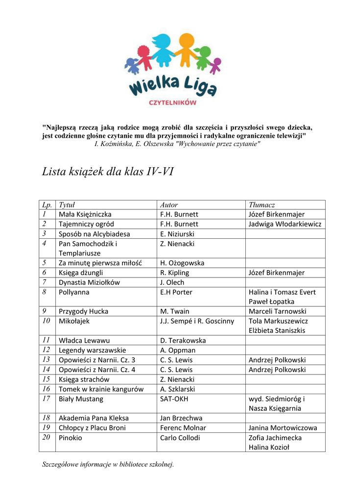 "Najlepszą rzeczą jaką rodzice mogą zrobić dla szczęścia i przyszłości swego dziecka, jest codzienne głośne czytanie mu dla przyjemności i radykalne ograniczenie telewizji" I. Koźmińska, E. Olszewska "Wychowanie przez czytanie" Lista książek dla klas IV-VI Autor F.H. Burnett F.H. Burnett E. Niziurski Z. Nienacki 5 6 7 8 Tytuł Mała Księżniczka Tajemniczy ogród Sposób na Alcybiadesa Pan Samochodzik i Templariusze Za minutę pierwsza miłość Księga dżungli Dynastia Miziołków Pollyanna 9 10 Przygody Hucka Mikołajek M. Twain J.J. Sempé i R. Goscinny 11 12 13 14 15 16 17 Władca Lewawu Legendy warszawskie Opowieści z Narnii. Cz. 3 Opowieści z Narnii. Cz. 4 Księga strachów Tomek w krainie kangurów Biały Mustang D. Terakowska A. Oppman C. S. Lewis C. S. Lewis Z. Nienacki A. Szklarski SAT-OKH 18 19 20 Akademia Pana Kleksa Chłopcy z Placu Broni Pinokio Jan Brzechwa Ferenc Molnar Carlo Collodi Lp. 1 2 3 4 H. Ożogowska R. Kipling J. Olech E.H Porter Szczegółowe informacje w bibliotece szkolnej. Tłumacz Józef Birkenmajer Jadwiga Włodarkiewicz Józef Birkenmajer Halina i Tomasz Evert Paweł Łopatka Marceli Tarnowski Tola Markuszewicz Elżbieta Staniszkis Andrzej Polkowski Andrzej Polkowski wyd. Siedmioróg i Nasza Księgarnia Janina Mortowiczowa Zofia Jachimecka Halina Kozioł