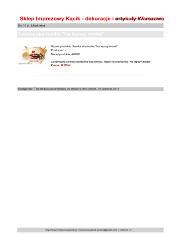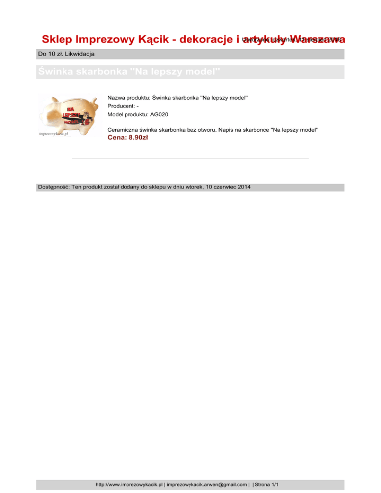 czwartek, 11 sierpień 2016 Sklep Imprezowy Kącik - dekoracje i Utworzono: artykuły Warszawa Do 10 zł. Likwidacja Świnka skarbonka ''Na lepszy model'' Nazwa produktu: Świnka skarbonka ''Na lepszy model'' Producent: Model produktu: AG020 Ceramiczna świnka skarbonka bez otworu. Napis na skarbonce ''Na lepszy model'' Cena: 8.90zł Dostępność: Ten produkt został dodany do sklepu w dniu wtorek, 10 czerwiec 2014 http://www.imprezowykacik.pl | [email protected] | | Strona 1/1