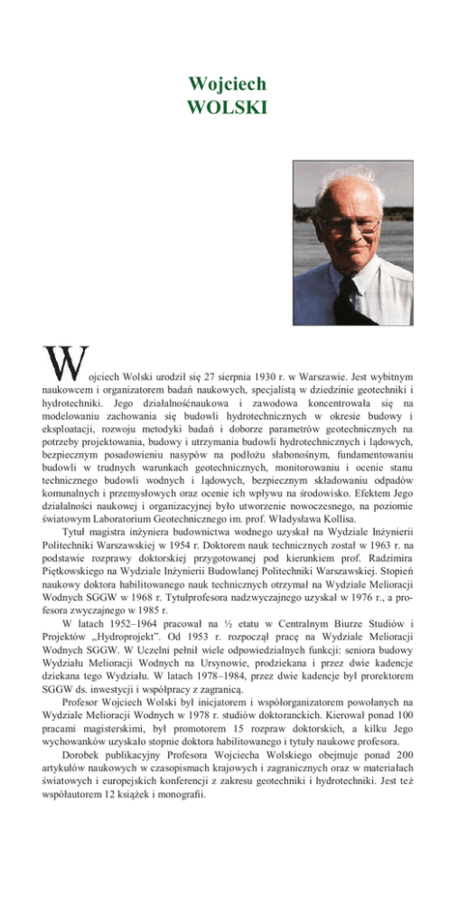 Wojciech WOLSKI ojciech Wolski urodził się 27 sierpnia 1930 r. w Warszawie. Jest wybitnym naukowcem i organizatorem badań naukowych, specjalistą w dziedzinie geotechniki i hydrotechniki. Jego działalnośćnaukowa i zawodowa koncentrowała się na modelowaniu zachowania się budowli hydrotechnicznych w okresie budowy i eksploatacji, rozwoju metodyki badań i doborze parametrów geotechnicznych na potrzeby projektowania, budowy i utrzymania budowli hydrotechnicznych i lądowych, bezpiecznym posadowieniu nasypów na podłożu słabonośnym, fundamentowaniu budowli w trudnych warunkach geotechnicznych, monitorowaniu i ocenie stanu technicznego budowli wodnych i lądowych, bezpiecznym składowaniu odpadów komunalnych i przemysłowych oraz ocenie ich wpływu na środowisko. Efektem Jego działalności naukowej i organizacyjnej było utworzenie nowoczesnego, na poziomie światowym Laboratorium Geotechnicznego im. prof. Władysława Kollisa. Tytuł magistra inżyniera budownictwa wodnego uzyskał na Wydziale Inżynierii Politechniki Warszawskiej w 1954 r. Doktorem nauk technicznych został w 1963 r. na podstawie rozprawy doktorskiej przygotowanej pod kierunkiem prof. Radzimira Piętkowskiego na Wydziale Inżynierii Budowlanej Politechniki Warszawskiej. Stopień naukowy doktora habilitowanego nauk technicznych otrzymał na Wydziale Melioracji Wodnych SGGW w 1968 r. Tytułprofesora nadzwyczajnego uzyskał w 1976 r., a profesora zwyczajnego w 1985 r. W latach 1952–1964 pracował na ½ etatu w Centralnym Biurze Studiów i Projektów „Hydroprojekt”. Od 1953 r. rozpoczął pracę na Wydziale Melioracji Wodnych SGGW. W Uczelni pełnił wiele odpowiedzialnych funkcji: seniora budowy Wydziału Melioracji Wodnych na Ursynowie, prodziekana i przez dwie kadencje dziekana tego Wydziału. W latach 1978–1984, przez dwie kadencje był prorektorem SGGW ds. inwestycji i współpracy z zagranicą. Profesor Wojciech Wolski był inicjatorem i współorganizatorem powołanych na Wydziale Melioracji Wodnych w 1978 r. studiów doktoranckich. Kierował ponad 100 pracami magisterskimi, był promotorem 15 rozpraw doktorskich, a kilku Jego wychowanków uzyskało stopnie doktora habilitowanego i tytuły naukowe profesora. Dorobek publikacyjny Profesora Wojciecha Wolskiego obejmuje ponad 200 artykułów naukowych w czasopismach krajowych i zagranicznych oraz w materiałach światowych i europejskich konferencji z zakresu geotechniki i hydrotechniki. Jest też współautorem 12 książek i monografii. W latach osiemdziesiątych Profesor kierował badaniami na obiektach doświadczalnych we współpracy ze Szwedzkim Instytutem Geotechnicznym. Efektem współpracy były wspólne publikacje – Raporty Szwedzkiego Instytutu Geotechnicznego Nr 32 i 36 oraz książka „Embankments on organic soils” (1996) wydana przez Elsevier. Wyniki badań w zakresie analizy zachowania się gruntów słabych znalazły powszechne uznanie w kraju i za granicą. Nadal kieruje pracami badawczymi prowadzonymi dla Obiektu Uniesz kodliwiania Odpadów Wydobywczych KGHM Żelazny Most jako Krajowy Ekspert Geotechniczny koordynujący prace Zespołu Ekspertów Międzynarodowych, kierowanego przez Profesora Michele Jamiolkowskiego. Profesor Wojciech Wolski był głównym projektantem i konsultantem wielu obiektów hydrotechnicznych w kraju, m.in. zapór: Tresna, Przeczyce, Goczałkowice, Wisła-Czarne, Koronowo, Dobromierz, Słup, Klimkówka, Czorsztyn, Świnna Poręba, Myczkowce, Sosnówka i Hańcza, oraz za granicą, m.in. systemów melioracyjnych Lower Tiger River, Mandali, Ranija, Abu Ghraib (Irak) i Minna (Algieria), stopni wodnych Amarah i Basrah (Irak), zapór: Mavro Colymbos (Cypr), Sittang (Birma), Sejnane (Tunezja), Keddara (Algieria), Badush (Irak) i Acarenza (Włochy), elektrowni Homs (Libia) oraz zbiorników odpadów płynnych Kemerkoy (Turcja) i Nuraxi Figus (Włochy). W latach 1971–1972 przez pół roku był ekspertem ONZ w Birmie (Rangoon). Prowadził wykłady jako „visiting professor” na uniwersytetach w Nigerii (1985), we Włoszech (1989) i w Boliwii (1996) oraz wykłady i odczyty na uniwersytetach, m.in. w Belgii, Finlandii, Kanadzie, Szwecji, Stanach Zjednoczonych, Turcji, Wielkiej Brytanii, Włoszech i Danii. Pełnił funkcję panelisty na międzynarodowych konferencjach w Brnie (1967), Moskwie (1973), Sztokholmie (1981) i Stambule (2001). Brałudział w konferencjach z zapraszanymi generalnymi referatami, m.in. w Brighton (1979), Helsinkach (1983), Dublinie (1987), Tallinie (1988), Bolton (1993) i Oslo (1995). Był przewodniczącym sesji na konferencjach w Helsinkach (1983), San Francisco (1985), Rio de Janeiro (1989), Florencji (1991) i Amsterdamie (1999), „discussion leaderem” na konferencji w Pradze (2003) i członkiem Komitetu Naukowego na konferencjach w Karlsruhe (1992) i Amsterdamie (1999). Organizował lub współorganizował wiele konferencji naukowych o zasięgu krajowym i międzynarodowym (np. Geofi lters 2000). Profesor Wojciech Wolski prowadzi bardzo aktywną działalnośćw różnych organizacjach naukowych i zawodowych, krajowych i międzynarodowych, m.in.: w Komitecie Inżynierii Lądowej i Wodnej PAN, ISSMGE, ICOLD i Polskim Komitecie Geotechniki, w wielu z nich pełniłrównież odpowiedzialne funkcje z wyboru. W czasie okupacji był harcerzem Szarych Szeregów w drużynie „Gigantów”, a obecnie od ośmiu lat jest przewodniczącym Zarządu Głównego Stowarzyszenia Szarych Szeregów oraz członkiem Społecznego Komitetu Opieki nad grobami poległych żołnierzy batalionu „Zośka”. Od 1992 r. Profesor Wojciech Wolski jest prezesem fi rmy Geoteko Sp. z o.o. Najważniejsze prace wykonywane pod Jego kierownictwem dotyczą: budynków wysokich (m.in. Daewoo Center, Rondo ONZ, FIM Tower, Złota 44, Warsaw Spire w Warszawie), składowisk odpadów oraz obiektów komunikacyjnych (m.in. autostrady A2 i A4, II linia metra w Warszawie). Dokumentacje hydrogeologiczne i geologiczno-inżynierskie dla 