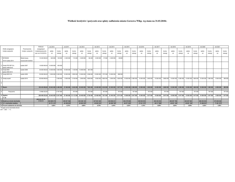 Wielkość kredytów i pożyczek oraz spłaty zadłużenia miasta Gorzowa Wlkp. wg stanu na 31.03.2010r. Wielkość Źródło zaciągnięcia Przeznaczenia kredytu (pożyczki) kredytu ( pożyczki) 1 NFOŚiGW Termin spłaty-2014 2 Kredyt-PKO BP S.A. rok 2010 rok 2011 rok 2012 rok 2013 rok 2014 rok 2015 rok 2016 rok 2017 rok 2018 rok 2019 rok 2020 rok 2021 zaciągniętych kredytów(pożyczek) spłata koszty spłata koszty spłata koszty spłata koszty spłata koszty spłata koszty spłata koszty spłata koszty spłata koszty spłata koszty spłata koszty spłata koszty stan na 31.03.2010r. rat obsługi rat obsługi rat obsługi rat obsługi rat obsługi rat obsługi rat obsługi rat obsługi rat obsługi rat obsługi rat obsługi rat obsługi 10 443 000,00 843 000 130 000 budżet 2007 10 000 000,00 10 000 000 450 000 Modernizacja 2 400 000 115 200 2 400 000 86 400 2 400 000 57 600 2 400 000 28 800 oczyszczalni ścieków Spłata 2008-2010 3 Kredyt BGK budżet 2008 35 000 000,00 10 000 000 1 600 000 10 000 000 1 135 000 15 000 000 681 000 4 Kredyt BOŚ S.A. budżet 2009 55 000 000,00 5 000 000 3 300 000 10 000 000 2 995 000 10 000 000 2 396 000 15 000 000 1 797 000 15 000 000 898 500 5 Kredyt projekt budżet 2010 85 000 000,00 1 000 000 5 000 000 5 100 000 2 000 000 4 800 000 5 000 000 4 680 000 5 000 000 4 380 000 10 000 000 4 080 000 10 000 000 3 480 000 10 000 000 2 880 000 10 000 000 2 280 000 10 000 000 1 680 000 10 000 000 1 080 000 8 000 000 480 000 195 443 000,00 25 843 000 6 480 000 27 400 000 9 345 200 29 400 000 7 963 400 22 400 000 6 534 600 22 400 000 5 307 300 10 000 000 4 080 000 10 000 000 3 480 000 10 000 000 2 880 000 10 000 000 2 280 000 10 000 000 1 680 000 10 000 000 1 080 000 8 000 000 480 000 767 000 767 000 767 000 767 000 767 000 767 000 767 000 29 400 000 8 730 400 22 400 000 7 301 600 22 400 000 6 074 300 10 000 000 4 847 000 10 000 000 4 247 000 10 000 000 3 647 000 10 000 000 3 047 000 10 000 000 2 447 000 10 000 000 1 847 000 8 000 000 1 247 000 spłata 2009-2012 6 7 Razem 8 Poręczenia 9 Ogółem 12 966 222,00 2 767 000 767 000 208 409 222,00 25 843 000 9 247 000 27 400 000 10 112 200 767 000 767 000 767 000 (7 +8) 10 Budżet po stronie dochodów 11 15 % dochodów budżetu 12 Procent zadłużenia do dochodu *Przyjęto wzrost dochodów dla lat: 2011 - 2021 - 1 % plan po zm.na 31.03.10 424 809 473 429 057 568 433 348 143 437 681 625 442 058 441 446 479 026 450 943 816 455 453 254 460 007 786 464 607 864 469 253 943 473 946 482 63 721 421 64 358 635 65 002 222 65 652 244 66 308 766 66 971 854 67 641 572 68 317 988 69 001 168 69 691 180 70 388 091 71 091 972 8,26% 8,74% 8,80% 6,79% 6,44% 3,33% 3,16% 3,00% 2,84% 2,68% 2,52% 1,95% Łączna kwota długu Lp. Źródło zaciągnięcia kredytu (pożyczki) 1 NFOŚiGW 2 Kredyt 3 Kredyt Przeznaczenie kredytu (pożyczki) Modernizacja Wielkość zaciągnięt. kredytów i pożyczek stan na 31.03.2010r. Wielkość zaciągnięt. kredytów i pożyczek stan na 31.12.2010r. Wielkość zaciągnięt. kredytów i pożyczek stan na 31.12.2011r. Wielkość zaciągnięt. kredytów i pożyczek stan na 31.12.2012r. Wielkość zaciągnięt. kredytów i pożyczek stan na 31.12.2013r. Wielkość zaciągnięt. kredytów i pożyczek stan na 31.12.2014r. Wielkość zaciągnięt. kredytów i pożyczek stan na 31.12.2015r. Wielkość zaciągnięt. kredytów i pożyczek stan na 31.12.2016r. Wielkość zaciągnięt. kredytów i pożyczek stan na 31.12.2017r. Wielkość zaciągnięt. kredytów i pożyczek stan na 31.12.2018r. Wielkość zaciągnięt. kredytów i pożyczek stan na 31.12.2020r. Wielkość zaciągnięt. kredytów i pożyczek stan na 31.12.2019r. Wielkość zaciągnięt. kredytów i pożyczek stan na 31.12.2021r. 10 443 000 9 600 000 7 200 000 4 800 000 2 400 000 0 0 0 0 0 0 0 0 10 000 000 0 0 0 0 0 0 0 0 0 0 0 0 35 000 000 25 000 000 15 000 000 0 0 0 0 0 0 0 0 0 0 55 000 000 50 000 000 40 000 000 30 000 000 15 000 000 0 0 0 0 0 0 0 0 85 000 000 80 000 000 78 000 000 73 000 000 68 000 000 58 000 000 48 000 000 38 000 000 28 000 000 18 000 000 8 000 000 0 110 443 000 169 600 000 142 200 000 112 800 000 90 400 000 68 000 000 58 000 000 48 000 000 38 000 000 28 000 000 18 000 000 8 000 000 0 0 0 0 0 0 0 0 0 0 0 0 0 0 oczyszczalni ścieków PKO BP S.A. BGK 4 Kredyt - BOŚ S.A. zrównoważenie budż. 2007 zrównoważenie budż. 2008 zrównoważenie budż. 2009 5 Kredyt - projekt zrównoważenie budż. 2010 6 7 Razem 8 Poręczenia 9 Zobowiązania wymagalne wg stanu na 31.03.2010 10 Ogółem 565 323,45 111 008 323,45 169 600 000 142 200 000 112 800 000 90 400 000 68 000 000 58 000 000 48 000 000 38 000 000 28 000 000 18 000 000 8 000 000 0 424 809 473 424 809 473 429 057 568 433 348 143 437 681 625 442 058 441 446 479 026 450 943 816 455 453 254 460 007 786 464 607 864 469 253 943 473 946 482 254 885 684 254 885 684 257 434 541 260 008 886 262 608 975 265 235 065 267 887 415 270 566 289 273 271 952 276 004 672 278 764 719 281 552 366 284 367 889 26,13 39,92 33,14 26,03 20,65 15,38 12,99 10,64 8,34 6,09 3,87 1,70 0,00 (7 +8 + 9) 11 Budżet po stronie dochodów * plan po zm. 31.03.10 12 60 % dochodów budżetu 13 (10/11) *Przyjęto wzrost dochodów dla lat: 2011 - 2021 - 1 %