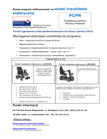 Rusza program dofinansowań na wózki inwalidzkie elektryczne PCPR Powiatowe Centrum Pomocy Rodzinie Państwowy Fundusz Rehabilitacji Osób Niepełnosprawnych Termin zgłoszenia osób zainteresowanych do końca czerwca 2012r. Wymagania dotyczące uczestnika do programu: Wiek – mężczyzna do 65 lat, kobieta do 60 lat. Niepełnosprawność ruchowa Orzeczenie o niepełnosprawności w stopniu znacznym, lub >>> Orzeczenie o niepełnosprawności 1 grupa ZUS , lub >>> Orzeczenie o niezdolności do pracy i samodzielnej egzystencji. PROPOZYCJE Wózki inwalidzkie elektryczne ( joystick) Wózki inwalidzkie elektryczne (skuter) W ofercie mamy dla Państwa wiele innych wózków znanych renomowanych firm W ofercie mamy dla Państwa wiele innych wózków znanych renomowanych firm • • • • • • • prędkość 6(10,15) km/h wyróżnia się osiągami i jest jedynym dostępnym na rynku elektrycznym wózkiem inwalidzkim wyposażonym w: Moc silnika 550 (700) W akumulatory 60 (100) Ah zasięg ok. 55 ( 100) km Max. Obciążenie 120 (150) kg Siedzisko szerokość/głębokość 38-56/50 cm • • • • tempomat wielofunkcyjny, podświetlany panel sterujący bagażnik i skrytki na drobiazgi 2 lusterka Wymiary dł./szer./wys. 116/68/113 cm Punkt informacji 04-739 Warszawa-Międzylesie ul. Obiegowa 2 tel./fax: (022) 610-41-18. 20-064 Lublin ul. Lubartowska 72A Nasze sklepy: Sklep medyczny Mińsk Mazowiecki ul. 1 PLM "W-wa" 3a/36, tel/fax. 025-759-20-60 Sklep medyczny Garwolin ul. Staszica 3, tel./fax 025-681-89-74 TEL. 81 476 16 41