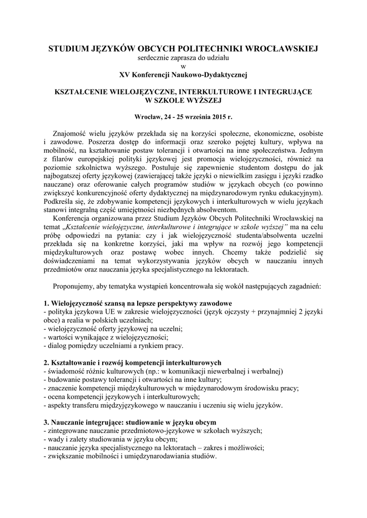 STUDIUM JĘZYKÓW OBCYCH POLITECHNIKI WROCŁAWSKIEJ serdecznie zaprasza do udziału w XV Konferencji Naukowo-Dydaktycznej KSZTAŁCENIE WIELOJĘZYCZNE, INTERKULTUROWE I INTEGRUJĄCE W SZKOLE WYŻSZEJ Wrocław, 24 - 25 września 2015 r. Znajomość wielu języków przekłada się na korzyści społeczne, ekonomiczne, osobiste i zawodowe. Poszerza dostęp do informacji oraz szeroko pojętej kultury, wpływa na mobilność, na kształtowanie postaw tolerancji i otwartości na inne społeczeństwa. Jednym z filarów europejskiej polityki językowej jest promocja wielojęzyczności, również na poziomie szkolnictwa wyższego. Postuluje się zapewnienie studentom dostępu do jak najbogatszej oferty językowej (zawierającej także języki o niewielkim zasięgu i języki rzadko nauczane) oraz oferowanie całych programów studiów w językach obcych (co powinno zwiększyć konkurencyjność oferty dydaktycznej na międzynarodowym rynku edukacyjnym). Podkreśla się, że zdobywanie kompetencji językowych i interkulturowych w wielu językach stanowi integralną część umiejętności niezbędnych absolwentom. Konferencja organizowana przez Studium Języków Obcych Politechniki Wrocławskiej na temat „Kształcenie wielojęzyczne, interkulturowe i integrujące w szkole wyższej” ma na celu próbę odpowiedzi na pytania: czy i jak wielojęzyczność studenta/absolwenta uczelni przekłada się na konkretne korzyści, jaki ma wpływ na rozwój jego kompetencji międzykulturowych oraz postawę wobec innych. Chcemy także podzielić się doświadczeniami na temat wykorzystywania języków obcych w nauczaniu innych przedmiotów oraz nauczania języka specjalistycznego na lektoratach. Proponujemy, aby tematyka wystąpień koncentrowała się wokół następujących zagadnień: 1. Wielojęzyczność szansą na lepsze perspektywy zawodowe - polityka językowa UE w zakresie wielojęzyczności (język ojczysty + przynajmniej 2 języki obce) a realia w polskich uczelniach; - wielojęzyczność oferty językowej na uczelni; - wartości wynikające z wielojęzyczności; - dialog pomiędzy uczelniami a rynkiem pracy. 2. Kształtowanie i rozwój kompetencji interkulturowych - świadomość różnic kulturowych (np.: w komunikacji niewerbalnej i werbalnej) - budowanie postawy tolerancji i otwartości na inne kultury; - znaczenie kompetencji międzykulturowych w międzynarodowym środowisku pracy; - ocena kompetencji językowych i interkulturowych; - aspekty transferu międzyjęzykowego w nauczaniu i uczeniu się wielu języków. 3. Nauczanie integrujące: studiowanie w języku obcym - zintegrowane nauczanie przedmiotowo-językowe w szkołach wyższych; - wady i zalety studiowania w języku obcym; - nauczanie języka specjalistycznego na lektoratach – zakres i możliwości; - zwiększanie mobilności i umiędzynarodawiania studiów. Konferencja odbędzie się w dniach 24-25 września 2015 r. we Wrocławiu. Prosimy o nadsyłanie zgłoszeń (Karta zgłoszenia uczestnictwa w załączeniu) w terminie do 31 maja 2015 r. na adres email: [email protected] Opłata konferencyjna w wysokości 250 zł obejmuje: udział w Konferencji, materiały konferencyjne, przerwy kawowe, dwa lunche oraz uroczystą kolację. Wpłaty należy dokonać do 31 maja 2015 r. na konto: Studium Języków Obcych Politechniki Wrocławskiej Wybrzeże Wyspiańskiego 27 50-370 Wrocław (NIP 896-000-58-51) 37 1090 2402 0000 0006 1000 0434 podając w tytule: Konferencja SJO nr 488246 W przypadku zgłoszenia udziału w konferencji po 31 maja 2015 roku koszt konferencji wynosi 300 zł. W razie rezygnacji z udziału w konferencji opłata nie będzie zwracana, a materiały konferencyjne zostaną przesłane pocztą. Istnieje możliwość uczestnictwa w konferencji innej osoby zamiast zgłoszonej. Językiem konferencji będzie język polski i język angielski, ale przewidujemy również obrady w sekcjach językowych. Teksty referatów w wersji elektronicznej należy przesłać do 5 września 2015 r. Informacja dla autorów dot. technicznych wymagań przygotowania referatów do publikacji znajduje się pod adresem: www.konferencja.sjo.pwr.edu.pl Planowany czas na wystąpienie z referatem: 15 min. Objętość referatu do 6 stron (wraz z literaturą i streszczeniem w języku angielskim). Materiały konferencyjne nie będą recenzowane. Za treść merytoryczną referatu odpowiedzialność ponosi autor. Komitet programowy zastrzega sobie prawo nieprzyjęcia referatu na Konferencję. Referaty uczestników, którzy nie dokonali wpłaty, nie będą publikowane. Wszystkie informacje o naszej Konferencji znajdą Państwo na stronie internetowej Studium Języków Obcych Politechniki Wrocławskiej: www.konferencja.sjo.pwr.edu.pl. Zapytania dotyczące konferencji prosimy kierować na adres email [email protected] lub zgłaszać telefonicznie: 71-320-31-87, 71-320-31-17 Serdecznie zapraszamy do uczestnictwa. W imieniu Komitetu programowego XV Konferencji Naukowo-Dydaktycznej Doc. dr Irina Modrzycka Dyrektor SJO Politechniki Wrocławskiej KARTA ZGŁOSZENIA UCZESTNICTWA w XV Konferencji Naukowo-Dydaktycznej KSZTAŁCENIE WIELOJĘZYCZNE, INTERKULTUROWE I INTEGRUJĄCE W SZKOLE WYŻSZEJ Wrocław, 24 - 25 września 2015 r. Imię i nazwisko Tytuł naukowy, stanowisko Prezentowana filologia lub inna dziedzina nauki Miejsce pracy, adres Telefon kontaktowy Adres e-mailowy Adres do korespondencji (jeżeli jest inny niż podany wyżej) Dane do faktury: dokładny adres i NIP płatnika (jeżeli faktura wystawiona będzie na zakład pracy) Zgłaszam referat w języku ………. Tytuł referatu w języku polskim i angielskim Streszczenie wystąpienia (do programu konferencji, maks. 100 słów): Zapotrzebowanie na sprzęt * Zakwaterowanie uczestników we własnym zakresie. Propozycje miejsc znajdują się na stronie internetowej Konferencji: www.konferencja.sjo.pwr.edu.pl