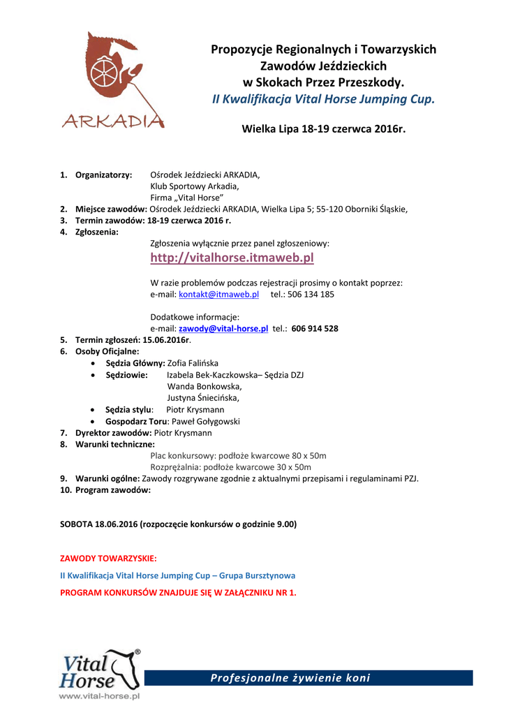 Propozycje Regionalnych i Towarzyskich Zawodów Jeździeckich w Skokach Przez Przeszkody. II Kwalifikacja Vital Horse Jumping Cup. Wielka Lipa 18-19 czerwca 2016r. 1. Organizatorzy: Ośrodek Jeździecki ARKADIA, Klub Sportowy Arkadia, Firma „Vital Horse” 2. Miejsce zawodów: Ośrodek Jeździecki ARKADIA, Wielka Lipa 5; 55-120 Oborniki Śląskie, 3. Termin zawodów: 18-19 czerwca 2016 r. 4. Zgłoszenia: Zgłoszenia wyłącznie przez panel zgłoszeniowy: http://vitalhorse.itmaweb.pl W razie problemów podczas rejestracji prosimy o kontakt poprzez: e-mail: [email protected] tel.: 506 134 185 5. 6. 7. 8. 9. 10. Dodatkowe informacje: e-mail: [email protected] tel.: 606 914 528 Termin zgłoszeń: 15.06.2016r. Osoby Oficjalne: Sędzia Główny: Zofia Falińska Sędziowie: Izabela Bek-Kaczkowska– Sędzia DZJ Wanda Bonkowska, Justyna Śniecińska, Sędzia stylu: Piotr Krysmann Gospodarz Toru: Paweł Gołygowski Dyrektor zawodów: Piotr Krysmann Warunki techniczne: Plac konkursowy: podłoże kwarcowe 80 x 50m Rozprężalnia: podłoże kwarcowe 30 x 50m Warunki ogólne: Zawody rozgrywane zgodnie z aktualnymi przepisami i regulaminami PZJ. Program zawodów: SOBOTA 18.06.2016 (rozpoczęcie konkursów o godzinie 9.00) ZAWODY TOWARZYSKIE: II Kwalifikacja Vital Horse Jumping Cup – Grupa Bursztynowa PROGRAM KONKURSÓW ZNAJDUJE SIĘ W ZAŁĄCZNIKU NR 1. Profesjonalne żywienie koni ZAWODY REGIONALNE: Konkurs nr 3 kl. LL – Seria A: dokładności bez rozgrywki art. 238 pkt 1.1 Seria B: szkoleniowy dla Kucy – z oceną stylu jeźdźca Konkurs nr 4 kl. L – Seria A: dokładności bez rozgrywki art. 238 pkt 1.1 - II Kwalifikacja Vital Horse Jumping Cup – Grupa Diamentowa Seria B: szkoleniowy – z oceną stylu jeźdźca Konkurs nr 5 kl. P – dwufazowy art. 274 pkt 5.3 Konkurs nr 6 kl. P – 1 - zwykły art. 238.2.1 Konkurs nr 7 kl. N – dwufazowy art. 274 pkt 5.3 Konkurs nr 8 kl. N-1 zwykły art.238.2.1 NIEDZIELA 19.06.2016 (rozpoczęcie konkursów o godzinie 9.00) ZAWODY TOWARZYSKIE: II Kwalifikacja Vital Horse Jumping Cup – Grupa Bursztynowa PROGRAM KONKURSÓW ZNAJDUJE SIĘ W ZAŁĄCZNIKU NR 1. ZAWODY REGIONALNE: Konkurs nr 11 kl. LL – Seria A: dokładności bez rozgrywki art. 238 pkt 1.1 Seria B: szkoleniowy dla Kucy – z oceną stylu jeźdźca Konkurs nr 13 kl. L – dokładności bez rozgrywki art. 238 pkt 1.1 – II Kwalifikacja Vital Horse Jumping Cup – Grupa Diamentowa Konkurs nr 14 kl. L – LICENCYJNY art. 6 Reg. PZJ Konkurs nr 15 kl. P – szkoleniowy – z oceną stylu jeźdźca. Konkurs nr 16 kl. P – o wzrastającym stopniu trudności z Jokerem art. 269. Konkurs nr 17 kl. N – zwykły art.238 pkt 2.1 Konkurs nr 18 kl. N-1 dwufazowy art. 274 pkt 5.3 11. Ostateczne godziny rozpoczęcia konkursów zostaną podane 17.06.2016 (piątek) na stronie http://www.vital-horse.pl– po otrzymaniu ostatecznych zgłoszeń. 12. Dekoracje zwycięzców odbędą się bezpośrednio po zakończeniu konkursów. 13. Opłata organizacyjna: 50 zł od startu. Zamknięcie listy startowej na 1 godz. przed planowanym rozpoczęciem konkursu. Opłatę należy uiścić przed zamknięciem listy. KAŻDA ZMIANA NA LIŚCIE STARTOWEJ PO JEJ ZAMKNIĘCIU PODLEGA OPŁACIE 30 ZŁ. Zgłoszenia po terminie mogą być przyjęte za zdwojoną opłatą organizacyjną. 14. UWAGI: - zgłoszenie się do zawodów jest równoznaczne z zaakceptowaniem propozycji zawodów, - zgłoszenie jest ważne po otrzymaniu potwierdzenia o jego przyjęciu, - organizator nie odpowiada za wypadki i kradzieże w czasie zawodów i transportu, - organizator zastrzega sobie prawo do zmian programu zawodów oraz ograniczenia ilości startujących koni – decyduje kolejność zgłoszeń, - w piątek place treningowe dostępne będą do godziny 19.00, - informacje dodatkowe pod numerem telefonu: 0 606 914 528, 15. Boksy (ilość ograniczona): Rezerwacja do dnia 15.06.2016r Opłata za całe zawody: 200 zł, 1 dzień 90 zł. Organizator zapewnia pierwsze ścielenie słomą. Boksy będą dostępne od piątku od godziny 12.00 Opłaty za boksy należy przesłać na numer konta: BZ WBK 77 1090 1522 0000 0001 0160 5882 W tytule przelewu należy umieścić imię i nazwisko zawodnika oraz imię konia. Potwierdzenie przelewu należy przesłać wraz ze zgłoszeniami ostatecznymi. Pierwszeństwo w rezerwacji boksów mają konie startujące przez 2 dni zawodów. Profesjonalne żywienie koni Opłaty za boksy nie podlegają zwrotowi w przypadku rezygnacji ze startu w zawodach. 16. W konkursach towarzyskich obowiązuje zgoda rodziców dla osób niepełnoletnich, zaświadczenie lekarskie o zdolności do wzięcia udziału w zawodach, dla konia paszport z aktualnymi szczepieniami . 17. Nagrody: Organizator przewiduje nagrody rzeczowe, honorowe oraz flot’s dla zwycięzców. Konkurs nr 5: I miejsce – 150 zł, II miejsce – 100 zł, III miejsce – 50 zł Konkurs nr 6: I miejsce – 150 zł, II miejsce – 100 zł, III miejsce – 50 zł Konkurs nr 7: I miejsce – 150 zł, II miejsce – 100 zł, III miejsce – 50 zł Konkurs nr 16: I miejsce – 150 zł, II miejsce – 100 zł, III miejsce – 50 zł Konkurs nr 17: I miejsce – 200 zł, II miejsce – 150 zł, III miejsce – 100 zł Minimalna łączna pula nagród: 1650 zł + nagrody rzeczowe i honorowe. 18. Na miejscu istnieje możliwość rezerwacji noclegów w Villi Barbara – tel. 504 595 549. Dodatkowe noclegi: Hotel Olimp ul. Poniatowskiego 22, Oborniki Śl. - tel. 71 310 12 70 19. Propozycje zatwierdzone przez Dolnośląski Związek Jeździecki KODEKS POSTĘPOWANIA Z KONIEM Polski Związek Jeździecki prosi wszystkie osoby zaangażowane w jakikolwiek sposób w sporty konne, o przestrzeganie poniżej przedstawionego kodeksu oraz zasady, że dobrostan konia jest najważniejszy. Dobrostan konia musi być zawsze uwzględniany w sportach konnych i nie może być podporządkowany współzawodnictwu sportowemu ani celom komercyjnym. I. Na wszystkich etapach treningu i przygotowań konia do startów, dobro
