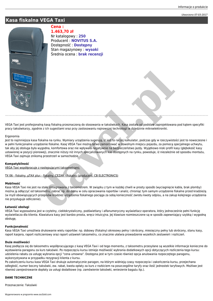 Informacje o produkcie Utworzono 07-03-2017 Kasa fiskalna VEGA Taxi Cena : 1.463,70 zł .p l Nr katalogowy : 250 Producent : NOVITUS S.A. Dostępność : Dostępny Stan magazynowy : wysoki Średnia ocena : brak recenzji ve l VEGA Taxi jest profesjonalną kasą fiskalną przeznaczoną do stosowania w taksówkach. Kasa została od podstaw zaprojektowana pod kątem specyfiki pracy taksówkarzy, zgodnie z ich sugestiami oraz przy zastosowaniu najnowszej technologii w dziedzinie mikroelektroniki. Ergonomia Jest to najmniejsza kasa fiskalna na rynku. Wymiary urządzenia sugerują, iż jest to raczej kalkulator, podczas gdy w rzeczywistości jest to nowoczesne i w pełni funkcjonalne urządzenie fiskalne. Kasę VEGA Taxi można łatwo zamontować w dowolnym miejscu pojazdu, za pomocą specjalnego uchwytu, tak aby jej obsługa była wygodna, komfortowa oraz nie wpływała negatywnie na bezpieczeństwo jazdy. Wyjątkowo niski profil kasy (głębokość kasy ustawionej w pozycji pionowej), znacznie niższy niż innych specjalizowanych kas dostępnych na rynku, powoduje, iż niezależnie od sposobu montażu, VEGA Taxi zajmuje znikomą przestrzeń w samochodzie. da Kompatybilność VEGA Taxi współpracuje z następującymi taksometrami: TX 06 - fiskalny, µTAX plus - fiskalny, CEZAR - fiskalny (producent: CB ELECTRONICS) Mobilność Kasa VEGA Taxi nie jest na stałe zintegrowana z taksometrem. W związku z tym w każdej chwili w prosty sposób (wyciagnięcie kabla, brak plomby) można ją odłączyć od taksometru, zabrać np. do domu w celu opracowania raportów i analiz, chroniąc tym samym urządzenie fiskalne przed kradzieżą (w myśl obowiązujących przepisów kradzież urządzenia fiskalnego pociąga za sobą konieczność zwrotu kwoty odpisu, a na zakup kolejnego urządzenia nie przysługuje odliczenie). Łatwość obsługi VEGA Taxi wyposażona jest w czytelny, ciekłokrystaliczny, podświetlany i alfanumeryczny wyświetlacz operatora, który jednocześnie pełni funkcję wyświetlacza dla klienta. Klawiatura kasy jest bardzo prosta, wręcz intuicyjna. Jej klawisze rozmieszczone są w sposób zapewniający szybką i wygodną obsługę. Funkcjonalność Kasa VEGA Taxi umożliwia drukowanie wielu raportów: np. dobowy (fiskalny) okresowy pełny i skrócony, miesięczny pełny lub skrócony, stanu kasy, raport kasjera, raport rozliczeniowy oraz raport ustawień taksometru, co znacznie ułatwia prowadzenie wszelkich zestawień i rozliczeń. Duże możliwości Kasę podłącza się do taksometru współpracującego z kasą VEGA Taxi i od tego momentu, z taksometru przesyłane są wszelkie informacje konieczne do wystawienia paragonu za kurs taksówki. Po rozpoczęciu kursu istnieje możliwość wybrania dodatkowych opcji dotyczących rozliczenia tego kursu: udzielenia rabatu za usługę wybrania opcji "cena umowna". Dostępna jest w tym czasie również opcja anulowania rozpoczętego paragonu, wykorzystywana w przypadku rezygnacji klienta z kursu. Po zakończeniu kursu kasa VEGA Taxi drukuje automatycznie paragon, na którym widnieją czasy rozpoczęcia i zakończenia kursu, przejechana odległość, numer boczny taksówki, ew. rabat, kwota opłaty za kurs z rozbiciem na poszczególne taryfy oraz ilość jednostek taryfowych. Możliwe jest również zarejestrowanie dopłaty za usługi dodatkowe (np. zamówienie taksówki, wniesienie bagażu itp.). DANE TECHNICZNE Przeznaczenie: Taksówki Wygenerowano w programie www.oscGold.com PARAMETRY URZĄDZENIA Liczba towarów: 150 000 Liczba stawek PTU: 7 Liczba stawek VAT: 7 konfigurowalnych jako: normalna, zwolniona, ryczałtowa i ryczałt Liczba numerów samochodów taxi: 10 Liczba grup towarowych: 64 Liczba kasjerów: 10 Rabaty/narzuty: tabela 10 rabatów Nazwa towaru: 18 znaków Temperatura pracy: od -25°C do +55°C MECHANIZM DRUKUJĄCY Rodzaj: termiczny Typ: CITIZEN MLT288 Szerokość papieru: 57 mm ZŁĄCZA Złącza komunikacyjne: 1 x RS232C Współpraca z urządzeniami: komputer, taksometr ve l ZASILANIE Awaryjne: wbudowan wewnętrzny akumulator Instalacja samochodowa: zakres 10 - 24 V .p WYŚWIETLACZE Pasażer/taksówkarz: alfanumeryczny, podświetlany LCD, 2 x 16 znaków, niebieski l KLAWIATURA Rodzaj: membranowa Liczba klawiszy: 8 da WYMIARY Szerokość/wysokość/głębokość: 90 x 190 x 50 mm Waga: 460 g