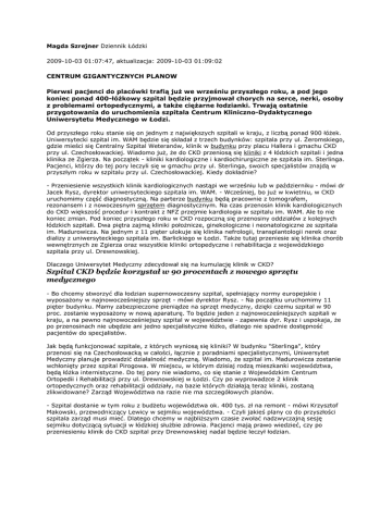 Magda Szrejner Dziennik Łódzki 2009-10-03 01:07:47, aktualizacja: 2009-10-03 01:09:02 CENTRUM GIGANTYCZNYCH PLANOW Pierwsi pacjenci do placówki trafią już we wrześniu przyszłego roku, a pod jego koniec ponad 400-łóżkowy szpital będzie przyjmował chorych na serce, nerki, osoby z problemami ortopedycznymi, a także ciężarne łodzianki. Trwają ostatnie przygotowania do uruchomienia szpitala Centrum Kliniczno-Dydaktycznego Uniwersytetu Medycznego w Łodzi. Od przyszłego roku stanie się on jednym z największych szpitali w kraju, z liczbą ponad 900 łóżek. Uniwersytecki szpital im. WAM będzie się składał z trzech budynków: szpitala przy ul. Żeromskiego, gdzie mieści się Centralny Szpital Weteranów, klinik w budynku przy placu Hallera i gmachu CKD przy ul. Czechosłowackiej. Wiadomo już, że do CKD przeniosą się kliniki z 4 łódzkich szpitali i jedna klinika ze Zgierza. Na początek - kliniki kardiologiczne i kardiochirurgiczne ze szpitala im. Sterlinga. Pacjenci, którzy do tej pory leczyli się w gmachu przy ul. Sterlinga, swoich specjalistów znajdą w przyszłym roku w szpitalu przy ul. Czechosłowackiej. Kiedy dokładnie? - Przeniesienie wszystkich klinik kardiologicznych nastąpi we wrześniu lub w październiku - mówi dr Jacek Rysz, dyrektor uniwersyteckiego szpitala im. WAM. - Wcześniej, bo już w kwietniu, w CKD uruchomimy część diagnostyczną. Na parterze budynku będą pracownie z tomografem, rezonansem i z nowoczesnym sprzętem diagnostycznym. Na czas przenosin klinik kardiologicznych do CKD większość procedur i kontrakt z NFZ przejmie kardiologia w szpitalu im. WAM. Ale to nie koniec zmian. Pod koniec przyszłego roku w CKD rozpoczną się przenosiny oddziałów z kolejnych łódzkich szpitali. Dwa piętra zajmą kliniki położnicze, ginekologiczne i neonatologiczne ze szpitala im. Madurowicza. Na jednym z 11 pięter ulokuje się klinika nefrologii, transplantologii nerek oraz dializy z uniwersyteckiego szpitala im. Barlickiego w Łodzi. Także tutaj przeniesie się klinika chorób wewnętrznych ze Zgierza oraz wszystkie kliniki ortopedyczne i rehabilitacja z wojewódzkiego szpitala przy ul. Drewnowskiej. Dlaczego Uniwersytet Medyczny zdecydował się na kumulację klinik w CKD? Szpital CKD będzie korzystał w 90 procentach z nowego sprzętu medycznego - Bo chcemy stworzyć dla łodzian supernowoczesny szpital, spełniający normy europejskie i wyposażony w najnowocześniejszy sprzęt - mówi dyrektor Rysz. - Na początku uruchomimy 11 pięter budynku. Mamy zabezpieczone pieniądze na sprzęt medyczny, dzięki czemu szpital w 90 proc. zostanie wyposażony w nową aparaturę. To będzie jeden z najnowocześniejszych szpitali w kraju, a na pewno najnowocześniejszy szpital w województwie - zapewnia dyr. Rysz i uspokaja, że po przenosinach nie ubędzie ani jedno specjalistyczne łóżko, dlatego nie spadnie dostępność pacjentów do specjalistów. Jak będą funkcjonować szpitale, z których wyniosą się kliniki? W budynku "Sterlinga", który przenosi się na Czechosłowacką w całości, łącznie z poradniami specjalistycznymi, Uniwersytet Medyczny planuje prowadzić działalność medyczną. Wiadomo, że szpital im. Madurowicza zostanie wchłonięty przez szpital Pirogowa. W miejscu, w którym dzisiaj rodzą mieszkanki województwa, będą łóżka internistyczne. Do tej pory nie wiadomo, co się stanie z Wojewódzkim Centrum Ortopedii i Rehabilitacji przy ul. Drewnowskiej w Łodzi. Czy po wyprowadzce 2 klinik ortopedycznych oraz rehabilitacji oddziały, na bazie których działają teraz kliniki, zostaną zlikwidowane? Zarząd Województwa na razie nie ma szczegółowych planów. - Szpital dostanie w tym roku z budżetu województwa ok. 400 tys. zł na remont - mówi Krzysztof Makowski, przewodniczący Lewicy w sejmiku województwa. - Czyli jakieś plany co do przyszłości szpitala zarząd musi mieć. Dlatego chcemy w najbliższym czasie zwołać nadzwyczajną sesję sejmiku dotyczącą sytuacji w łódzkiej służbie zdrowia. Pacjenci mają prawo wiedzieć, czy po przeniesieniu klinik do CKD szpital przy Drewnowskiej nadal będzie leczył łodzian.