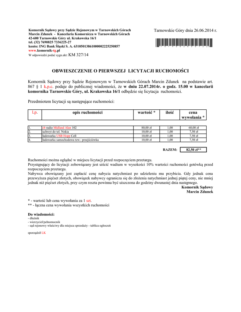 Tarnowskie Góry dnia 26.06.2014 r. Komornik Sądowy przy Sądzie Rejonowym w Tarnowskich Górach Marcin Zdunek - Kancelaria Komornicza w Tarnowskich Górach 42-600 Tarnowskie Góry ul. Krakowska 16/1 tel. (32) 7690825 7336225-27 konto: ING Bank Śląski S. A. 63105013861000002225250857 www.komornik-tg.pl W odpowiedzi podać sygn.akt: KM *1014062600722* 327/14 OBWIESZCZENIE O PIERWSZEJ LICYTACJI RUCHOMOŚCI Komornik Sądowy przy Sądzie Rejonowym w Tarnowskich Górach Marcin Zdunek na podstawie art. 867 § 1 k.p.c. podaje do publicznej wiadomości, że w dniu 22.07.2014r. o godz. 15.00 w kancelarii komornika Tarnowskie Góry, ul. Krakowska 16/1 odbędzie się licytacja ruchomości. Przedmiotem licytacji są następujące ruchomości: opis ruchomości l.p. 1. 2. 3. 4. cb radio Midland Alan 102 uchwyt do tel. Nokia ładowarka USB Hopp Cell ładowarka samochodowa tzw.: przejściówka wartość * ilość cena wywołania * 80,00 zł 10,00 zł 10,00 zł 10,00 zł 1,00 1,00 1,00 1,00 60,00 zł 7,50 zł 7,50 zł 7,50 zł RAZEM: 82,50 zł** Ruchomości można oglądać w miejscu licytacji przed rozpoczęciem przetargu. Przystępujący do licytacji zobowiązany jest uiścić wadium w wysokości 10% wartości ruchomości gotówką przed rozpoczęciem przetargu. Nabywca obowiązany jest zapłacić cenę nabycia natychmiast po udzieleniu mu przybicia. Gdy jednak cena przewyższa pięćset złotych, obowiązek nabywcy ogranicza się do złożenia natychmiast jednej piątej ceny, nie mniej jednak niż pięćset złotych, przy czym reszta powinna być uiszczona do godziny dwunastej dnia następnego. Komornik Sądowy Marcin Zdunek * - wartość lub cena wywołania za 1 szt. ** - łączna cena wywołania wszystkich ruchomości Do wiadomości: - dłużnik - wierzyciel/pełnomocnik - sąd rejonowy właściwy dla miejsca sprzedaży - tablica ogłoszeń sporządził LK
