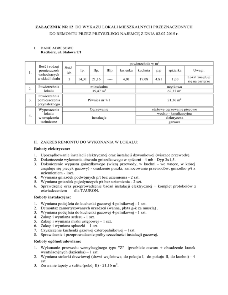 ZAŁĄCZNIK NR 12 DO WYKAZU LOKALI MIESZKALNYCH PRZEZNACZONYCH DO REMONTU PRZEZ PRZYSZŁEGO NAJEMCĘ Z DNIA 02.02.2015 r. I. DANE ADRESOWE Racibórz, ul. Stalowa 7/1 Ilość i rodzaj pomieszczeń wchodzących w skład lokalu 1. powierzchnia w m2 Ilość izb 3 Ip. IIp. IIIp. łazienka kuchnia p.p spiżarka Uwagi: 14,31 21,16 ---- 4,01 17,08 4,81 1,00 Lokal znajduje się na parterze 2. Powierzchnia lokalu mieszkalna 35,47 m2 użytkowa 62,37 m2 3. Powierzchnia pomieszczenia przynależnego Piwnica nr 7/1 21,36 m2 Ogrzewanie 4. Wyposażenie lokalu w urządzenia techniczne etażowe ogrzewanie piecowe wodno - kanalizacyjna elektryczna gazowa Instalacje II. ZAKRES REMONTU DO WYKONANIA W LOKALU: Roboty elektryczne: 1. Uporządkowanie instalacji elektrycznej oraz instalacji dzwonkowej (wiszące przewody). 2. Dokończenie wykonania obwodu gniazdkowego w spiżarni - 4 mb - Dyp 3x1,5. 3. Dokończenie wypustu gniazdkowego (wiszą przewody, w kuchni - we wnęce, w której znajduje się piecyk gazowy) - osadzenie puszki, zamocowanie przewodów, gniazdko p/t z uziemieniem - 1szt. 4. Wymiana gniazdek podwójnych p/t bez uziemienia - 2 szt. 5. Wymiana gniazdek pojedynczych p/t bez uziemienia - 2 szt. 6. Sprawdzenie oraz przeprowadzenie badań instalacji elektrycznej + komplet protokołów z oświadczeniem dla TAURON. Roboty instalacyjne: 1. 2. 3. 4. 5. 6. 7. 8. Wymiana podejścia do kuchenki gazowej 4-palnikowej - 1 szt. Demontaż zamortyzowanych urządzeń (wanna, płyta g-k za muszlą) . Wymiana podejścia do kuchenki gazowej 4-palnikowej - 1 szt. Zakup i wymiana sedesu - 1 szt. Zakup i wymiana miski ustępowej – 1 szt. Zakup i wymiana spłuczki – 1 szt. Czyszczenie kuchenki gazowej czteropalnikowej – 1szt. Sprawdzenie i przeprowadzenie próby szczelności instalacji gazowej. Roboty ogólnobudowlane: 1. Wykonanie przewodu wentylacyjnego typu "Z" (przebicie otworu + obsadzenie kratek wentylacyjnych (łazienka) – 1 szt. 2. Wymiana stolarki drzwiowej (drzwi wejściowe, do pokoju I, do pokoju II, do kuchni) - 4 szt. 3. Zerwanie tapety z sufitu (pokój II) - 21,16 m2. 4. Demontaż okładziny ściennej w łazience - 4,62 m2. 5. Demontaż boazerii (pokój I: ściany + sufit podwieszany, pokój II: ściany + demontaż szafek wnękowych ze sklejki w ścianie) - 72,93 m2. 6. Zerwanie wykładziny podłogowej z PCW oraz listew przyściennych (łazienka, pokój II, spiżarnia) – 26,77 m2. 7. Zerwanie wykładziny dywanowej (pokój I) - 14,31 m2. 8. Ułożenie wykładziny z PCW (łazienka, pokój I, pokój II, spiżarnia) – 41,08 m2. 9. Wymiana listew przyściennych drewnianych (kuchnia, przedpokój) - 19m. 10. Montaż nawiewników okiennych (pokój I, pokój II, kuchnia) - 3 szt. 11. Wymiana kratek wentylacyjnych 14 x 21cm (łazienka) – 1 szt. 12. Przetarcie tynków zwykłych wewnętrznych kat. III z zaprawy cementowo-wapiennej na ścianach (łazienka, wnęka z piecykiem gazowym w kuchni, spiżarnia) - 45,50 m2. 13. Skasowanie zacieków (przedpokój) - 1,5 m2. 14. Przygotowanie powierzchni sufitów pod malowanie farbami emulsyjnymi starych tynków z szpachlowaniem nierówności – 215,89 m2. 15. Dwukrotne malowanie emulsyjne sufitów całego mieszkania – 62,37 m2. 16. Dwukrotne malowanie emulsyjne ścian całego mieszkania – 153,52 m2. 17. Dwukrotne malowanie olejne lamperii z jednokrotnym szpachlowaniem (łazience) – 14,50 m2. 18. Dwukrotne malowanie olejne rur (pokój I, pokój II, kuchnia, łazienka, spiżarnia) 37,60mb. 19. Dwukrotne malowanie farbami olejnymi progów drzwiowych i ościeżnic drzwiowych – 5,13 m2. III. TERMIN WYKONANIA REMONTU: 4 miesiące IV. WARUNKI FINANSOWE: 1. Remontujący wykona remont lokalu we własnym zakresie na własny koszt, a po zakończeniu najmu zobowiązany będzie do zdania lokalu mieszkalnego w stanie nie pogorszonym od stanu określonego w protokole przekazania lokalu. 2. Remontujący nie jest zobowiązany do uiszczenia kaucji mieszkaniowej. 3. W okresie wykonywania remontu Remontujący, z którym zostanie zawarta umowa najmu lokalu nie uiszcza czynszu, zobowiązany będzie wyłącznie do uiszczania opłat niezależnych od Wynajmującego z tytułu: a) gospodarowania odpadami komunalnymi, b) za dostawę do lokalu energii elektrycznej, c) za dostawę do lokalu energii cieplnej, d) za dostawę do lokalu gazu, e) za dostawę do lokalu wody oraz odbiór ścieków. 4. Remontujący zawrze umowę z: a) Zakładem Energetycznym na dostarczanie energii elektrycznej b) Zakładem Wodociągów i Kanalizacji Sp. z o.o. w Raciborzu umowę na dostarczenie i rozliczenie wody oraz odprowadzenie ścieków, c) Zakładem Gazowniczym na dostarczanie gazu 5. W razie rezygnacji z lokalu w czasie wykonywania remontu, lub po jego zakończeniu, a także po zakończeniu umowy najmu, Remontujący nie ma prawa żądać zwrotu kosztów przeprowadzonego remontu. V. PODSTAWA WYKONANIA REMONTU I ODBIORU ROBÓT: 1. Podstawą wykonania robót będzie umowa najmu lokalu mieszkalnego. 2. Przekazanie lokalu do remontu nastąpi protokolarnie. 3. Odbiór wszystkich robót, o których mowa w pkt. II Wynajmujący odbierze od Remontującego w formie protokolarnej. VI. OGÓLNE WARUNKI TECHNICZNE WYKONANIA REMONTU: 1. Szczegółowe warunki wykonania remontu określone zostaną w załączniku do umowy najmu. 2. Roboty budowlane w tym elektryczne i instalacyjne należy wykonać zgodnie z przepisami prawa budowlanego oraz Warunkami Technicznymi Wykonania i Odbioru Robót zawartymi w Rozporządzeniu Ministra Infrastruktury z dnia 12 kwietnia 2002 r. ( Dz. U. Nr 75, Poz. 690). 3. Wynajmujący zastrzega sobie, aby specjalistyczne roboty remontowe wykonywały podmioty posiadające wymagane uprawnienia. 4. Zastosowane materiały budowlane powinny posiadać atesty oraz aktualne aprobaty techniczne, dopuszczające je do stosowania w budownictwie mieszkaniowym. 5. W trakcie wykonywania prac zabrania się naruszania elementów konstrukcyjnych budynku oraz dokonywania jakichkolwiek zmian w istniejącym systemie prz