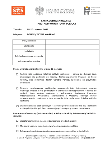 KARTA ZGŁOSZENIOWA NA TARGI AKTYWNYCH FORM POMOCY Termin: 18-20 czerwca 2015 Miejsce: POLICE / NOWE WARPNO Imię, nazwisko Stanowisko Instytucja Telefon kontaktowy uczestnika Adres e-mail uczestnika Proszę wybrać panel dyskusyjne w dniu 18 czerwca: Rodzina jako podstawa lokalnej polityki społecznej – kanwą do dyskusji będą zmieniające się podejście do rodziny, Zachodniopomorski Program na Rzecz Rodziny, oraz redefinicja działań Ośrodka Pomocy Społecznej na przykładzie Goleniowa Strategia rozwiązywania problemów społecznych jako determinant rozwoju lokalnego, miejsce i rola podmiotów o charakterze reintegracyjnym – kanwą do dyskusji będą zmiany związane z wdrażaniem Krajowego Programu Przeciwdziałania Wykluczeniu Społecznemu i Ubóstwu, nowego okresu programowania i związane z tym wyzwania jakie stoją przed lokalną polityką społeczną Usamodzielnianie osób zależnych – zarówno poprzez działanie CIS-ów, spółdzielni socjalnych i jak i innych form zapewniających elastyczny system zatrudnienia Proszę wybrać warsztaty (maksimum dwa) w których chcieli by Państwo wziąć udział 19 czerwca: Współpraca Centrum Integracji Społecznej z przedsiębiorcami Mierzenie kosztów zaniechania i wartości społecznej projektów Delegowanie zadań organizacjom pozarządowym, szczególnie w kontekście projekt współfinansowany ze środków Ministerstwa Pracy i Polityki Społecznej w ramach Programu „Aktywne Formy Przeciwdziałania Wykluczeniu Społecznemu - edycja 2011-2015” nowego okresu programowania Budowanie lokalnych strategii i programów Usamodzielnianie osób zależnych Rewitalizacja ze szczególnym uwzględnieniem aspektów społecznych Informacje logistyczne: nocleg 18/19 czerwca nocleg 19/20 czerwca udział w Targach Aktywnych Form Pomocy jako wystawca w dniu 19 czerwca uczestnictwo w Targach Dobrego Klimatu w dniu 20 czerwca jako uczestnik udział w Targach Dobrego Klimatu jako wystawca parking dieta wegetariańska Inne uwagi Wyrażam zgodę na gromadzenie i przetwarzanie moich danych osobowych przez organizatorów Targów Aktywnych Form Pomocy w Policach i w Nowym Warpnie/ Targów Dobrego Klimatu w Nowym Warpnie dla celów w/w (zgodnie z ustawa z dnia 29 sierpnia 1997 r. o ochronie danych osobowych, Dz.U. 1997 Nr 133, poz. 883 z późn. zm.). …………………………………… Miejscowość i data …………………………………… podpis projekt współfinansowany ze środków Ministerstwa Pracy i Polityki Społecznej w ramach Programu „Aktywne Formy Przeciwdziałania Wykluczeniu Społecznemu - edycja 2011-2015” KONTAKT Z ORGANIZATORAMI: Stowarzyszenie „SOS dla Rodziny” ul. Energetyków 10, 70-656 Szczecin tel. +48 91 350 73 80, fax +48 91 431 81 26 [email protected] Stowarzyszenia Czas Przestrzeń Tożsamość ul. M. Skłodowskiej-Curie 4, 71-332 Szczecin tel.: +48 91 852 25 95, +48 91 852 25 94 [email protected] REKRUTACJA: Kartę zgłoszeniową należy dostarczyć: Podpisaną kartę - e-mailowo na adres: [email protected] (w formie zeskanowanych plików) w formacie *.pdf lub formacie graficznym np. *.jpg, *.bmp - pocztą, kurierem, osobiście do siedziby Stowarzyszenia Czas Przestrzeń Tożsamość, ul. M. Skłodowskiej-Curie 4, 71-332 Szczecin Wszelkich informacji udziela: Konrad Wielgoszewski 600 915 116 lub pod nr 91 350 70 90 projekt współfinansowany ze środków Ministerstwa Pracy i Polityki Społecznej w ramach Programu „Aktywne Formy Przeciwdziałania Wykluczeniu Społecznemu - edycja 2011-2015”