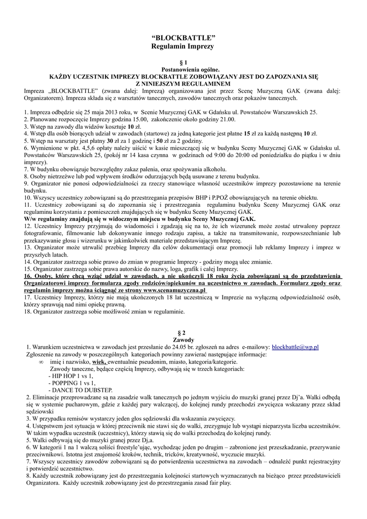 “BLOCKBATTLE” Regulamin Imprezy §1 Postanowienia ogólne. KAŻDY UCZESTNIK IMPREZY BLOCKBATTLE ZOBOWIĄZANY JEST DO ZAPOZNANIA SIĘ Z NINIEJSZYM REGULAMINEM Impreza „BLOCKBATTLE” (zwana dalej: Imprezą) organizowana jest przez Scenę Muzyczną GAK (zwana dalej: Organizatorem). Impreza składa się z warsztatów tanecznych, zawodów tanecznych oraz pokazów tanecznych. 1. Impreza odbędzie się 25 maja 2013 roku, w Scenie Muzycznej GAK w Gdańsku ul. Powstańców Warszawskich 25. 2. Planowane rozpoczęcie Imprezy godzina 15.00, zakończenie około godziny 21.00. 3. Wstęp na zawody dla widzów kosztuje 10 zł. 4. Wstęp dla osób biorących udział w zawodach (startowe) za jedną kategorie jest płatne 15 zł za każdą następną 10 zł. 5. Wstęp na warsztaty jest płatny 30 zł za 1 godzinę i 50 zł za 2 godziny. 6. Wymienione w pkt. 4,5,6 opłaty należy uiścić w kasie mieszczącej się w budynku Sceny Muzycznej GAK w Gdańsku ul. Powstańców Warszawskich 25, (pokój nr 14 kasa czynna w godzinach od 9:00 do 20:00 od poniedziałku do piątku i w dniu imprezy). 7. W budynku obowiązuje bezwzględny zakaz palenia, oraz spożywania alkoholu. 8. Osoby nietrzeźwe lub pod wpływem środków odurzających będą usuwane z terenu budynku. 9. Organizator nie ponosi odpowiedzialności za rzeczy stanowiące własność uczestników imprezy pozostawione na terenie budynku. 10. Wszyscy uczestnicy zobowiązani są do przestrzegania przepisów BHP i P.POŻ obowiązujących na terenie obiektu. 11. Uczestnicy zobowiązani są do zapoznania się i przestrzegania regulaminu budynku Sceny Muzycznej GAK oraz regulaminu korzystania z pomieszczeń znajdujących się w budynku Sceny Muzycznej GAK. W/w regulaminy znajdują się w widocznym miejscu w budynku Sceny Muzycznej GAK. 12. Uczestnicy Imprezy przyjmują do wiadomości i zgadzają się na to, że ich wizerunek może zostać utrwalony poprzez fotografowanie, filmowanie lub dokonywanie innego rodzaju zapisu, a także na transmitowanie, rozpowszechnianie lub przekazywanie głosu i wizerunku w jakimkolwiek materiale przedstawiającym Imprezę. 13. Organizator może utrwalić przebieg Imprezy dla celów dokumentacji oraz promocji lub reklamy Imprezy i imprez w przyszłych latach. 14. Organizator zastrzega sobie prawo do zmian w programie Imprezy - godziny mogą ulec zmianie. 15. Organizator zastrzega sobie prawa autorskie do nazwy, loga, grafik i całej Imprezy. 16. Osoby, które chcą wziąć udział w zawodach, a nie ukończyli 18 roku życia zobowiązani są do przedstawienia Organizatorowi imprezy formularza zgody rodziców/opiekunów na uczestnictwo w zawodach. Formularz zgody oraz regulamin imprezy można ściągnąć ze strony www.scenamuzyczna.pl 17. Uczestnicy Imprezy, którzy nie mają ukończonych 18 lat uczestniczą w Imprezie na wyłączną odpowiedzialność osób, którzy sprawują nad nimi opiekę prawną. 18. Organizator zastrzega sobie możliwość zmian w regulaminie. §2 Zawody 1. Warunkiem uczestnictwa w zawodach jest przesłanie do 24.05 br. zgłoszeń na adres e-mailowy: [email protected] Zgłoszenie na zawody w poszczególnych kategoriach powinny zawierać następujące informacje: • imię i nazwisko, wiek, ewentualnie pseudonim, miasto, kategoria/kategorie. Zawody taneczne, będące częścią Imprezy, odbywają się w trzech kategoriach: - HIP HOP 1 vs 1, - POPPING 1 vs 1, - DANCE TO DUBSTEP. 2. Eliminacje przeprowadzane są na zasadzie walk tanecznych po jednym wyjściu do muzyki granej przez Dj’a. Walki odbędą się w systemie pucharowym, gdzie z każdej pary walczącej, do kolejnej rundy przechodzi zwycięzca wskazany przez skład sędziowski 3. W przypadku remisów wystarczy jeden głos sędziowski dla wskazania zwycięzcy. 4. Ustępstwem jest sytuacja w której przeciwnik nie stawi się do walki, zrezygnuje lub wystąpi nieparzysta liczba uczestników. W takim wypadku uczestnik (uczestnicy), którzy stawią się do walki przechodzą do kolejnej rundy. 5. Walki odbywają się do muzyki granej przez Dj,a. 6. W kategorii 1 na 1 walczą soliści freestyle’ując, wychodząc jeden po drugim – zabronione jest przeszkadzanie, przerywanie przeciwnikowi. Istotna jest znajomość kroków, technik, tricków, kreatywność, wyczucie muzyki. 7. Wszyscy uczestnicy zawodów zobowiązani są do potwierdzenia uczestnictwa na zawodach – odnaleźć punkt rejestracyjny i potwierdzić uczestnictwo. 8. Każdy uczestnik zobowiązany jest do przestrzegania kolejności startowych wyznaczanych na bieżąco przez przedstawicieli Organizatora. Każdy uczestnik zobowiązany jest do przestrzegania zasad fair play. 9. Zawody oceniać będą sędziowie zaproszeni przez Organizatora. Skład sędziowski oraz jego decyzje są niepodważalne. Organizator nie ma wpływu na werdykty, zaś wszelkie wątpliwości, skargi, zażalenia należy kierować bezpośrednio do składu sędziowskiego. 10. Organizatorzy nie odpowiadają za prawa autorskie do utworów naruszone przez uczestników zawodów. 11. Każdy uczestnik zawodów występuje na własną odpowiedzialność. 12. Koszty przejazdu i ubezpieczenia pokrywają uczestnicy zawodów. 13. Organizatorzy nie zapewniają noclegu dla uczestników zawodów. 14. Organizator zastrzega sobie prawo do odwołania zawodów przy niewystarczającej liczbie zgłoszeń. 15. Organizator zastrzega sobie prawo dyskwalifikacji uczestnika zawodów lub uczestników zawodów, które odbędą się podczas Imprezy w przypadku ich niestosownego zachowania w stosunku do sędziów, przedstawicieli Organizatora lub pozostałych uczestników Imprezy lub nieprzestrzegania niniejszego regulaminu. 16. Nagrody przewidziane są wyłącznie dla uczestników zawodów, którzy zajęli pierwsze w danej kategorii. > Zwycięzca w kategorii HIP HOP 1 VS 1 otrzymuje nagrodę pieniężną: 200 zł (od organizatora) i nagrodę rzeczową: bluzę (od sponsora), > Zwycięzca w kategorii POPPING 1 VS 1 otrzymuje nagrodę pieniężną: 200 zł