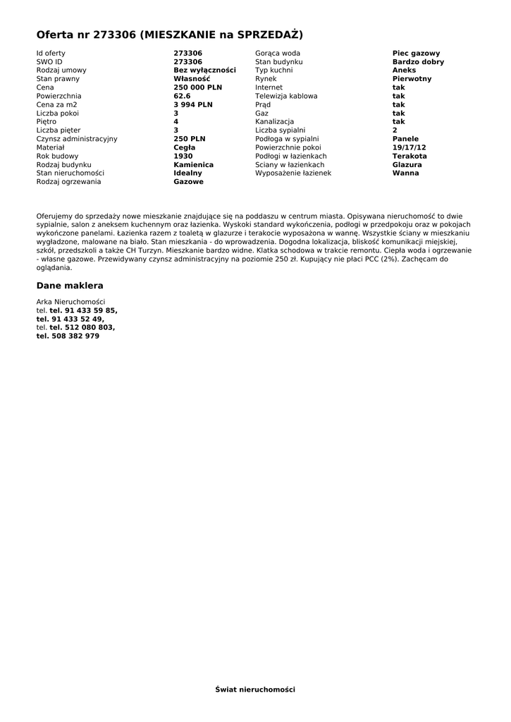 Oferta nr 273306 (MIESZKANIE na SPRZEDAŻ) Id oferty SWO ID Rodzaj umowy Stan prawny Cena Powierzchnia Cena za m2 Liczba pokoi Piętro Liczba pięter Czynsz administracyjny Materiał Rok budowy Rodzaj budynku Stan nieruchomości Rodzaj ogrzewania 273306 273306 Bez wyłączności Własność 250 000 PLN 62.6 3 994 PLN 3 4 3 250 PLN Cegła 1930 Kamienica Idealny Gazowe Gorąca woda Stan budynku Typ kuchni Rynek Internet Telewizja kablowa Prąd Gaz Kanalizacja Liczba sypialni Podłoga w sypialni Powierzchnie pokoi Podłogi w łazienkach Sciany w łazienkach Wyposażenie łazienek Piec gazowy Bardzo dobry Aneks Pierwotny tak tak tak tak tak 2 Panele 19/17/12 Terakota Glazura Wanna Oferujemy do sprzedaży nowe mieszkanie znajdujące się na poddaszu w centrum miasta. Opisywana nieruchomość to dwie sypialnie, salon z aneksem kuchennym oraz łazienka. Wyskoki standard wykończenia, podłogi w przedpokoju oraz w pokojach wykończone panelami. Łazienka razem z toaletą w glazurze i terakocie wyposażona w wannę. Wszystkie ściany w mieszkaniu wygładzone, malowane na biało. Stan mieszkania - do wprowadzenia. Dogodna lokalizacja, bliskość komunikacji miejskiej, szkół, przedszkoli a także CH Turzyn. Mieszkanie bardzo widne. Klatka schodowa w trakcie remontu. Ciepła woda i ogrzewanie - własne gazowe. Przewidywany czynsz administracyjny na poziomie 250 zł. Kupujący nie płaci PCC (2%). Zachęcam do oglądania. Dane maklera Arka Nieruchomości tel. tel. 91 433 59 85, tel. 91 433 52 49, tel. tel. 512 080 803, tel. 508 382 979 Świat nieruchomości Powered by TCPDF (www.tcpdf.org)