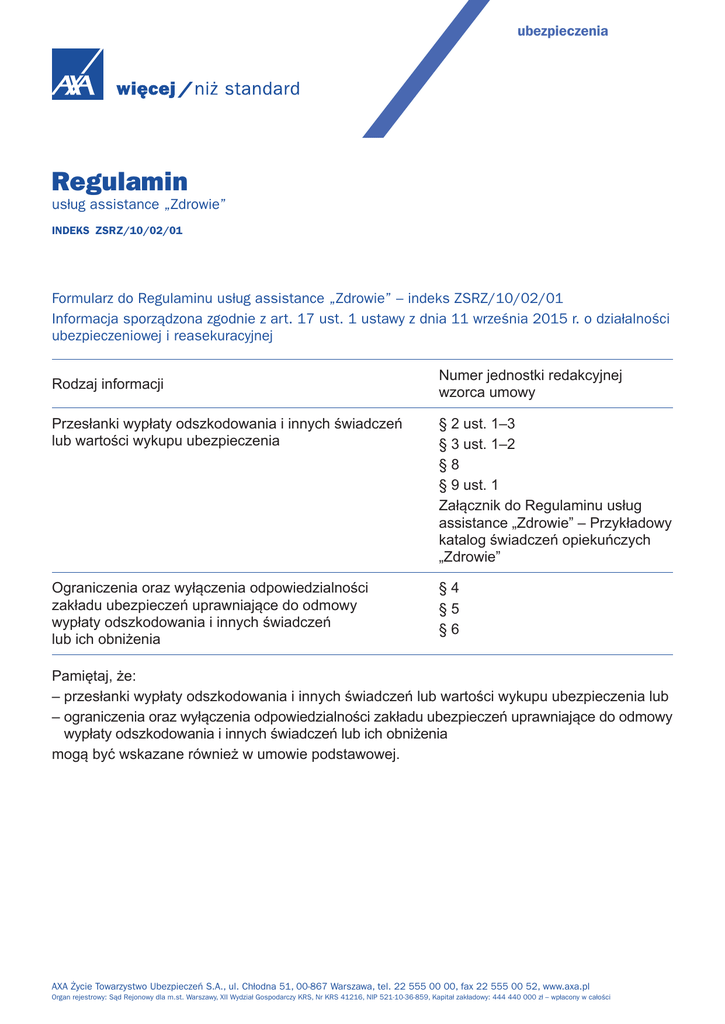 ubezpieczenia Regulamin usług assistance „Zdrowie” INDEKS ZSRZ/10/02/01 Formularz do Regulaminu usług assistance „Zdrowie” – indeks ZSRZ/10/02/01 Informacja sporządzona zgodnie z art. 17 ust. 1 ustawy z dnia 11 września 2015 r. o działalności ubezpieczeniowej i reasekuracyjnej Rodzaj informacji Numer jednostki redakcyjnej wzorca umowy Przesłanki wypłaty odszkodowania i innych świadczeń lub wartości wykupu ubezpieczenia § 2 ust. 1–3 § 3 ust. 1–2 §8 § 9 ust. 1 Załącznik do Regulaminu usług assistance „Zdrowie” – Przykładowy katalog świadczeń opiekuńczych „Zdrowie” Ograniczenia oraz wyłączenia odpowiedzialności zakładu ubezpieczeń uprawniające do odmowy wypłaty odszkodowania i innych świadczeń lub ich obniżenia §4 §5 §6 Pamiętaj, że: – przesłanki wypłaty odszkodowania i innych świadczeń lub wartości wykupu ubezpieczenia lub – ograniczenia oraz wyłączenia odpowiedzialności zakładu ubezpieczeń uprawniające do odmowy wypłaty odszkodowania i innych świadczeń lub ich obniżenia mogą być wskazane również w umowie podstawowej. AXA Życie Towarzystwo Ubezpieczeń S.A., ul. Chłodna 51, 00-867 Warszawa, tel. 22 555 00 00, fax 22 555 00 52, www.axa.pl Organ rejestrowy: Sąd Rejonowy dla m.st. Warszawy, XII Wydział Gospodarczy KRS, Nr KRS 41216, NIP 521-10-36-859, Kapitał zakładowy: 444 440 000 zł – wpłacony w całości Regulamin usług assistance „Zdrowie” INDEKS ZSRZ/10/02/01 I. TWOJE USŁUGI Co to dla Ciebie oznacza? Regulamin usług assistance „Zdrowie” Dla kogo usługa jest dostępna? Usługi assistance przeznaczone są dla osób pomiędzy 13. a 70. rokiem życia. Pamiętaj, że Twój wiek w ramach Regulaminu jest równy wiekowi ustalonemu na zasadach określonych w umowie podstawowej. W związku z tym, jest on liczony na dzień podpisania wniosku o zawarcie umowy podstawowej jako liczba ukończonych przez Ciebie pełnych lat życia. W każdą rocznicę polisy wartość ta zwiększana jest o jeden. §1 1. Klientem w rozumieniu Regulaminu może być wyłącznie Ubezpieczony w rozumieniu OWU, który w dniu podpisania wniosku ubezpieczeniowego spełnia łącznie następujące warunki: 1) ma ukończony 13. rok życia; 2) nie ukończył 70. roku życia. 2. Na potrzeby Regulaminu wiek Klienta jest równy wiekowi ustalonemu na zasadach określonych w OWU. Przykład: Wniosek o zawarcie umowy podstawowej został podpisany 10 marca 2010 r. Jako Ubezpieczony została w nim wskazana osoba urodzona 26 marca 1980 r. Osoba ta miała na dzień podpisania wniosku 29 lat. Umowa ubezpieczenia została zawarta 1 kwietnia 2010 r. Pomimo faktu, że zgodnie z kalendarzem osoba wskazana w przykładzie kończy 30 lat w marcu, dla celów umowy podstawowej i Regulaminu skończy ona 30 lat dopiero w pierwszą rocznicę polisy, tj. 1 kwietnia 2011 r., 31 lat – 1 kwietnia 2012 r. etc. Jaki jest zakres usług? §2 Sprawdź na stronie internetowej AXA (www.axa.pl), jaki jest zakres i na czym polega realizacja przysługujących Ci usług. Usługi świadczone są na terytorium Rzeczypospolitej Polskiej za pośrednictwem renomowanej firmy assistance. 1. Zakres usług Operatora obejmuje następujące świadczenia opiekuńcze: 1) organizację oraz pokrycie kosztów wizyty lekarza pierwszego kontaktu lub pediatry; 2) organizację oraz pokrycie kosztów transportu leków; 3) organizację oraz pokrycie kosztów transportu do szpitala; 4) organizację oraz pokrycie kosztów transportu pomiędzy placówkami medycznymi; 5) organizację oraz pokrycie kosztów transportu po hospitalizacji; 6) telefoniczne udzielanie informacji. 2. Przykładowy zakres świadczeń opiekuńczych określony został w Przykładowym katalogu świadczeń opiekuńczych „Zdrowie”, stanowiącym załącznik do Regulaminu. Aktualny zakres świadczeń znajduje się na stronie internetowej www.axa.pl. 3. Klientowi przysługuje prawo do korzystania ze świadczeń na terytorium Rzeczypospolitej Polskiej. 4. Usługi świadczone są przez Operatora w okresie od akceptacji wniosku ubezpieczeniowego, w którym Ubezpieczony w rozumieniu OWU zadeklarował chęć otrzymywania bezpłatnych świadczeń opiekuńczych, do momentu wskazanego w § 7. Co musisz zrobić, aby skorzystać z usługi? W przypadku wystąpienia zdarzenia objętego zakresem usług, niezwłocznie przekaż Operatorowi wyszczególnione tu informacje. Do Twojej dyspozycji została oddana specjalna infolinia. 2 §3 1. W celu umożliwienia Operatorowi realizacji świadczenia opiekuńczego, Klient lub każda inna osoba, działająca w jego imieniu, zobowiązani są zawiadomić Operatora o zdarzeniu objętym zakresem usług, telefonując pod numer linii telefonicznej dedykowanej do obsługi Klientów, podając następujące informacje: 1) imię i nazwisko Klienta; 2) numer PESEL Klienta; 3) imię i nazwisko zgłaszającego zdarzenie; 4) numer telefonu, pod którym można się skontaktować z Klientem lub inną osobą działającą w jego imieniu; 5) miejsce zamieszkania Klienta; Co to dla Ciebie oznacza? Regulamin usług assistance „Zdrowie” 6) miejsce oraz okoliczności zdarzenia objętego zakresem usług oraz miejsce, w którym aktualnie znajduje się Klient; 7) inne dane w zakresie niezbędnym do realizacji świadczenia. 2. Klient zobowiązany jest do stosowania się do wskazówek przekazanych przez Operatora, w zakresie niezbędnym do realizacji świadczenia. 3.Jeżeli Klient nie ukończył 18. roku życia, wniosek o realizację świadczenia może w jego imieniu zgłosić jedynie Właściciel polisy, opiekun prawny lub przedstawiciel ustawowy. II. KIEDY USŁUGA NIE BĘDZIE CI PRZYSŁUGIWAĆ? Każdy regulamin zawiera ograniczenia, dlatego w tej części dokumentu postaramy się przybliżyć je możliwie jak najdokładniej. Czytaj uważnie. Pragniemy, abyś miał jasność odnośnie do sytuacji, w których usługi nie będą Ci przysługiwać. Co to dla Ciebie oznacza? Regulamin usług assistance „Zdrowie” 