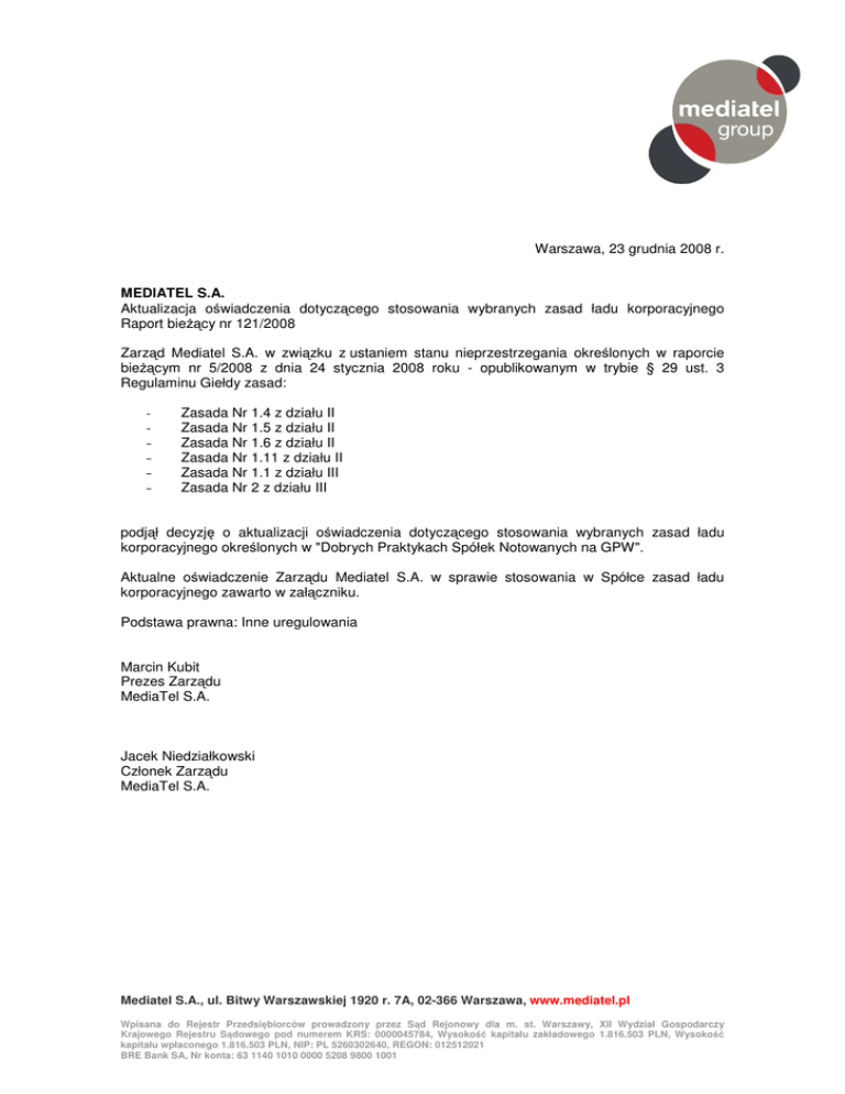Warszawa, 23 grudnia 2008 r. MEDIATEL S.A. Aktualizacja oświadczenia dotyczącego stosowania wybranych zasad ładu korporacyjnego Raport bieżący nr 121/2008 Zarząd Mediatel S.A. w związku z ustaniem stanu nieprzestrzegania określonych w raporcie bieżącym nr 5/2008 z dnia 24 stycznia 2008 roku - opublikowanym w trybie § 29 ust. 3 Regulaminu Giełdy zasad: - Zasada Nr 1.4 z działu II Zasada Nr 1.5 z działu II Zasada Nr 1.6 z działu II Zasada Nr 1.11 z działu II Zasada Nr 1.1 z działu III Zasada Nr 2 z działu III podjął decyzję o aktualizacji oświadczenia dotyczącego stosowania wybranych zasad ładu korporacyjnego określonych w "Dobrych Praktykach Spółek Notowanych na GPW". Aktualne oświadczenie Zarządu Mediatel S.A. w sprawie stosowania w Spółce zasad ładu korporacyjnego zawarto w załączniku. Podstawa prawna: Inne uregulowania Marcin Kubit Prezes Zarządu MediaTel S.A. Jacek Niedziałkowski Członek Zarządu MediaTel S.A. Mediatel S.A., ul. Bitwy Warszawskiej 1920 r. 7A, 02-366 Warszawa, www.mediatel.pl Wpisana do Rejestr Przedsiębiorców prowadzony przez Sąd Rejonowy dla m. st. Warszawy, XII Wydział Gospodarczy Krajowego Rejestru Sądowego pod numerem KRS: 0000045784, Wysokość kapitału zakładowego 1.816.503 PLN, Wysokość kapitału wpłaconego 1.816.503 PLN, NIP: PL 5260302640, REGON: 012512021 BRE Bank SA, Nr konta: 63 1140 1010 0000 5208 9800 1001