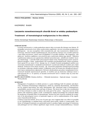 Acta Haematologica Polonica 2009, 40, Nr 2, str. 281–287 PRACA POGLĄDOWA – Review Article KAZIMIERZ SUŁEK Leczenie nowotworowych chorób krwi w wieku podeszłym Treatment of hematological malignancies in the elderly Klinika Hematologii Wojskowego Instytutu Medycznego w Warszawie STRESZCZENIE Leczenie nowotworów w wieku podeszłym stanowi duŜe wyzwanie dla chorego oraz lekarza. W przypadku nowotworów krwi, które są pierwotnie uogólnione i nie jest rozwaŜane postepowanie chirurgiczne – ma ono szczególnie wiele uwarunkowań, jak: stan czynnościowy układu krwiotwórczego, obecność chorób współistniejących, stan psychiczny chorego oraz czynniki społeczne i sam rodzaj nowotworu. Lekarz musi uwzględniać te wszystkie elementy dla osiągnięcia celu jakim jest moŜliwie najdłuŜszy czas przeŜycia przy zachowaniu dobrej jego jakości . Słabością współczesnej medycyny jest ograniczona zdolność przewidywania szkodliwych skutków leczenia chemicznego z powodu braku precyzyjnych metod oceny fizjologicznych rezerw poszczególnych narządów a takŜe niedocenianie roli czynników psychospołecznych. Wbrew przekonaniom sprzed 20 czy nawet 10 lat okazuje się, Ŝe w bardzo licznych przypadkach moŜliwe jest stosowanie chemioterapii w standardowych dawkach i uzyskiwanie dobrych wyników jak u ludzi młodych. Zwłaszcza nowe formy leczenia, jak stosowanie preparatów biologicznych pozwalają na uzyskanie większego odsetka remisji i wydłuŜenie czasu ich trwania bez narządowej toksyczności (poza zmniejszeniem odporności). RównieŜ udoskonalenie procedury transplantacji krwiotwórczych komórek macierzystych sprawiło, Ŝe moŜliwa jest jej skuteczna realizacja nawet u osób powyŜej 60 r.Ŝ. To sprawia, Ŝe leczenie nowotworów krwi w starości staje się coraz bardziej efektywne. SŁOWA KLUCZOWE: Ziarnica złośliwa – Chłoniaki nieziarnicze – Szpiczak mnogi – Leczenie – Wiek podeszły SUMMARY Management of neoplasms in elderly persons is a great challenge both for patients and physicians. Treatment of hematologic malignancies, which are primarily disseminated, and therefore not for surgical intervention, has many determinants, like: functional status of hematopoiesis, comorbidities, psycho-social status and type of disease. The doctor has to take into consideration all of these elements in order to achieve the main goal of his action – long term survival of the patient with satisfactory quality of life. Contemporary medical knowledge has restricted ability for prediction of harmful effect of chemotherapy because the lack of precise methods for evaluation of the physiological reserve of particular organs as well as underestimation of the significance of psychosocial factors. Contrary to previous beliefs, 20 or even 10 years ago, now it appears that very often it is possible to use chemotherapy in standard doses with pretty good results, similar to young people. New forms of biological treatments are particularly prone to produce higher percentage of remissions and prolonged survival without significant organ toxicity (except immunodeficiency). General 282 K. SUŁEK improvement in transplantation procedure has made possible its implementation even in persons> 60 year old. These facts make the treatment of malignancies in elderly patients very efficient. KEY WORDS: Hodgkin’s disease – Non-Hodgkin’s lymphoma – Multiple myeloma – Treatment – Elderly patients Leczenie chorób nowotworowych krwi w podeszłym wieku jest zdeterminowane przez kilka czynników, jak: 1. stan funkcjonalny układu krwiotwórczego, 2. współistniejące choroby, 3. czynniki psychologiczne, 4. czynniki społeczne, 5. rodzaj nowotworu. Ad.1. Proces starzenia się organizmu dotyczy wszystkich tkanek i układów aczkolwiek zachodzi on w sposób niejednoczesny. Dysproporcja w oznakach „starości” poszczególnych narządów jest nieraz uderzająca. Jeśli chodzi o układ krwiotwórczy, to najlepszym miernikiem jego wydolności wydaje się być wielkość puli komórek macierzystych [1]. Z badań na zwierzętach wiadomo, Ŝe zarówno ilościowo, jak i jakościowo pula tych komórek ulega stopniowemu zmniejszeniu. Mechanizm prowadzący do tego faktu jest wieloczynnikowy i moŜe obejmować takie elementy, jak długość telomeru, komponenty kataboliczne, oddziaływanie wolnych rodników tlenowych i inne [2] oraz uszkodzenie podścieliska [3, 4]. Nie wiadomo jednak, czy oddziaływanie tych czynników moŜe być podobne u człowieka. Wiele badań wykazało, Ŝe wprawdzie jest moŜliwe utrzymanie stabilnego poziomu hematopoezy nawet przy braku białek dokonujących naprawy DNA, ale zdolność do odpowiedzi hematopoetycznych komórek macierzystych na stress jest głęboko upośledzona [wg 2]. Słabością współczesnej nauki jest stosunkowo mała zdolność oceny fizjologicznych rezerw organizmu w zakresie poszczególnych układów, co w rezultacie prowadzić moŜe do zaskakujących powikłań po zastosowaniu leczenia przeciwnowotworowego [5]. Dodatkowym czynnikiem w podeszłym wieku bywa teŜ zmieniona absorpcja, dystrybucja, proces detoksykacji oraz klirens leków [6], które modyfikują ich farmakodynamikę [7]. Dotyczy to m.in. takich leków, jak cyklofosfamid i doksorubicyna przy zaburzeniu czynności wątroby [8]. Nieprawidłowy wewnątrzkomórkowy metabolizm leków i zaburzona naprawa uszkodzeń DNA łącznie prowadzi do zwiększenia toksyczności [9]. Ad.2. Znaczenie chorób współistniejących zaleŜy od rodzaju nowotworu krwi. Obecność nowotworu często skutkuje niedokrwistością . W obecności niedokrwistości stęŜenie leków w osoczu i toksyczność wzrasta, bo z krwinkami czerwonymi wiąŜe się większość leków cytostatycznych. Korekcja niedokrwistości moŜe osłabić toksyczność chemioterapii [9]. Z kolei choroby serca, zwłaszcza o charakterze niedokrwiennym (przebyte zawały serca) lub prowadzące do jego niewydolności, mogą ograniczać moŜliwości le