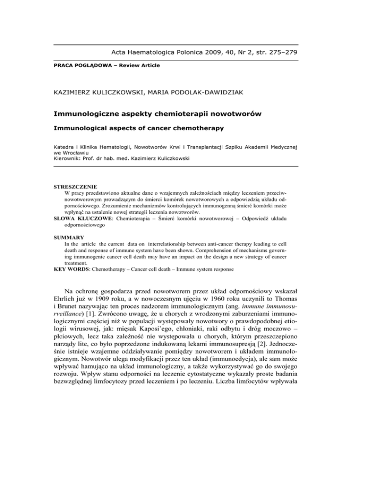 Acta Haematologica Polonica 2009, 40, Nr 2, str. 275–279 PRACA POGLĄDOWA – Review Article KAZIMIERZ KULICZKOWSKI, MARIA PODOLAK-DAWIDZIAK Immunologiczne aspekty chemioterapii nowotworów Immunological aspects of cancer chemotherapy Katedra i Klinika Hematologii, Nowotworów Krwi i Transplantacji Szpiku Akademii Medycznej we Wrocławiu Kierownik: Prof. dr hab. med. Kazimierz Kuliczkowski STRESZCZENIE W pracy przedstawiono aktualne dane o wzajemnych zaleŜnościach między leczeniem przeciwnowotworowym prowadzącym do śmierci komórek nowotworowych a odpowiedzią układu odpornościowego. Zrozumienie mechanizmów kontrolujących immunogenną śmierć komórki moŜe wpłynąć na ustalenie nowej strategii leczenia nowotworów. SŁOWA KLUCZOWE: Chemioterapia – Śmierć komórki nowotworowej – Odpowiedź układu odpornościowego SUMMARY In the article the current data on interrelationship between anti-cancer therapy leading to cell death and response of immune system have been shown. Comprehension of mechanisms governing immunogenic cancer cell death may have an impact on the design a new strategy of cancer treatment. KEY WORDS: Chemotherapy – Cancer cell death – Immune system response Na ochronę gospodarza przed nowotworem przez układ odpornościowy wskazał Ehrlich juŜ w 1909 roku, a w nowoczesnym ujęciu w 1960 roku uczynili to Thomas i Brunet nazywając ten proces nadzorem immunologicznym (ang. immune immunosurveillance) [1]. Zwrócono uwagę, Ŝe u chorych z wrodzonymi zaburzeniami immunologicznymi częściej niŜ w populacji występowały nowotwory o prawdopodobnej etiologii wirusowej, jak: mięsak Kaposi’ego, chłoniaki, raki odbytu i dróg moczowo – płciowych, lecz taka zaleŜność nie występowała u chorych, którym przeszczepiono narządy lite, co było poprzedzone indukowaną lekami immunosupresją [2]. Jednocześnie istnieje wzajemne oddziaływanie pomiędzy nowotworem i układem immunologicznym. Nowotwór ulega modyfikacji przez ten układ (immunoedycja), ale sam moŜe wpływać hamująco na układ immunologiczny, a takŜe wykorzystywać go do swojego rozwoju. Wpływ stanu odporności na leczenie cytostatyczne wykazały proste badania bezwzględnej limfocytozy przed leczeniem i po leczeniu. Liczba limfocytów wpływała 276 K. KULICZKOWSKI, M. PODOLAK-DAWIDZIAK na efekt leczenia w chłoniakach [3, 4, 5, 6], szpiczaku mnogim [7], ostrej białaczce szpikowej [8]. Celem leczenia przeciwnowotworowego jest eliminacja komórek nowotworu i temu słuŜą róŜne typy terapii: cytotoksyczna, modyfikująca nieprawidłowe funkcjonowanie komórki i immunologiczna. Terapie te prowadzą to śmierci komórek bądź ich zestarzenia się a więc w dalszym etapie teŜ do śmierci. Śmierć komórki moŜe przybierać trojakie formy: apoptozy, autofagii, nekrozy. Apoptoza jest wywoływana przez wiele induktorów i jako taka indukuje uwalnianie szeregu mediatorów przeciwzapalnych jak: czynnik transformujący-β, TGF-β (transforming growth factor-β), prostaglandyna E2, czynnik aktywujący płytki (platelet activating factor, PAF), dzięki czemu komórki ulegają „spokojnemu” uprzątnięciu [9]. Do zahamowania reakcji zapalnej przyczynia się równieŜ białko ostrej fazy – pentraksyna (pentraxin-3, PTX3). Autofagia słuŜy obronie komórki przed stresem, pomaga jej przeŜyć lub kończyć się moŜe apoptozą. Z kolei w czasie nekrozy uwalniane są mediatory pro-zapalne: IL-8, IL-10, TNF-α, a takŜe produkty rozpadu komórki jak HMGB1 (high-mobility group box 1) [9]. Przy chemioterapii nowotworów występuje kilka zaleŜnościami między układem odpornościowym a stosowanymi lekami cytotoksycznymi [10]: • śmierć komórki wywołana przez niektóre leki (np. antracykliny) czyni je immunogennymi, • bezpośrednio lub pośrednio stymulują układ immunologiczny np. taksany, gemcytabina, 5-fluorouracyl, • hamują mechanizmy immunosupresyjne np. cyklofosfamid, metotreaksat, • wywołując limfodeplecję indukują zmiany immunologiczne np. leki alkilujące. Większość leków cytotoksycznych zabija komórki nowotworowe przez apoptozę, ale tylko kilka czyni ich śmierć immunogenną. ZauwaŜono, Ŝe jeśli komórki linii CT26 zostaną zabite przy pomocy antracyklin, oksaliplatyny czy promieni jonizujących to moŜna je uŜyć jako szczepionki, aby uzyskać specyficzną odpowiedź eliminującą je. Natomiast brak tej odpowiedzi po takich lekach jak: etopozyd, mitomycyna C, stauroporyna i inne [11, 12]. Pod wpływem leczenia antracyklinami białko opiekuńcze kalretykulina zostaje przesunięte z siateczki endoplazmatycznej do błony komórkowej u części pacjentów z ostrą białaczką szpikową [13]. Kalretykulina (calreticulin, CRT) umoŜliwia fagocytozę umierającej komórki przez komórki dendrytyczne [14]. Białka opiekuńcze np. HSP 70 i 90 (HSP, heat-shock protein) mogą równieŜ przemieszczać się na powierzchnię komórki czyniąc je immunogennymi. Rolę białka HSP 90 w wywoływaniu immunogenności w szpiczaku mnogim opisano po leczeniu bortezomibem [14]. Rozpadłe komórki pod wpływem antracyklin czy oksaliplatyny uwalniają teŜ niehistonowe białko związane z chromatyną – HMGB1. Białko to łącząc się z receptorem TLR4 (Toll-like receptor 4, TLR4) na powierzchni komórek dendrytycznych stymuluje obróbkę i prezentację antygenów nowotworowych przez hamowanie łączenia fagosomów z lizosomami, co ułatwia przejście antygenów do części komórek odpowiedzialnych za ich prezentację (9). RównieŜ powstałe z rozpadłej komórki podwójne nici RNA łączą się Immunologiczne aspekty chemioterapii nowotworów 277 z receptorem TLR3 (Toll-like receptor 3, TLR3) na komórkach dendrytycznych, a podwójna nić DNA stymuluje makrofagi i komórki dendrytyczne aktywując czynnik transkrypcyjny NF-κB [9]. Tabela 1. Wpływ leków cytotoksycznych i radioterapii na niektóre funkcje immunologiczne [10] Table 1. Influence of cytotoxic drugs and radiot