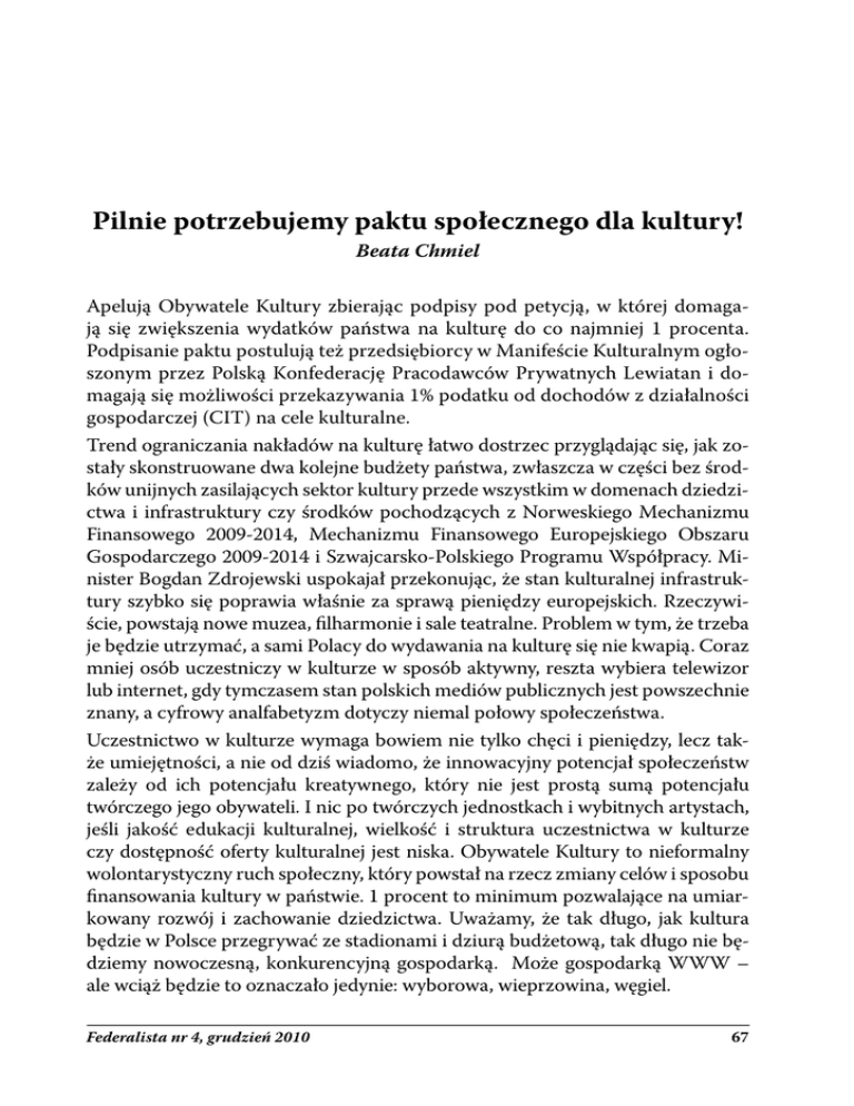 Pilnie potrzebujemy paktu społecznego dla kultury! Beata Chmiel Apelują Obywatele Kultury zbierając podpisy pod petycją, w której domagają się zwiększenia wydatków państwa na kulturę do co najmniej 1 procenta. Podpisanie paktu postulują też przedsiębiorcy w Manifeście Kulturalnym ogłoszonym przez Polską Konfederację Pracodawców Prywatnych Lewiatan i domagają się możliwości przekazywania 1% podatku od dochodów z działalności gospodarczej (CIT) na cele kulturalne. Trend ograniczania nakładów na kulturę łatwo dostrzec przyglądając się, jak zostały skonstruowane dwa kolejne budżety państwa, zwłaszcza w części bez środków unijnych zasilających sektor kultury przede wszystkim w domenach dziedzictwa i infrastruktury czy środków pochodzących z Norweskiego Mechanizmu Finansowego 2009-2014, Mechanizmu Finansowego Europejskiego Obszaru Gospodarczego 2009-2014 i Szwajcarsko-Polskiego Programu Współpracy. Minister Bogdan Zdrojewski uspokajał przekonując, że stan kulturalnej infrastruktury szybko się poprawia właśnie za sprawą pieniędzy europejskich. Rzeczywiście, powstają nowe muzea, filharmonie i sale teatralne. Problem w tym, że trzeba je będzie utrzymać, a sami Polacy do wydawania na kulturę się nie kwapią. Coraz mniej osób uczestniczy w kulturze w sposób aktywny, reszta wybiera telewizor lub internet, gdy tymczasem stan polskich mediów publicznych jest powszechnie znany, a cyfrowy analfabetyzm dotyczy niemal połowy społeczeństwa. Uczestnictwo w kulturze wymaga bowiem nie tylko chęci i pieniędzy, lecz także umiejętności, a nie od dziś wiadomo, że innowacyjny potencjał społeczeństw zależy od ich potencjału kreatywnego, który nie jest prostą sumą potencjału twórczego jego obywateli. I nic po twórczych jednostkach i wybitnych artystach, jeśli jakość edukacji kulturalnej, wielkość i struktura uczestnictwa w kulturze czy dostępność oferty kulturalnej jest niska. Obywatele Kultury to nieformalny wolontarystyczny ruch społeczny, który powstał na rzecz zmiany celów i sposobu finansowania kultury w państwie. 1 procent to minimum pozwalające na umiarkowany rozwój i zachowanie dziedzictwa. Uważamy, że tak długo, jak kultura będzie w Polsce przegrywać ze stadionami i dziurą budżetową, tak długo nie będziemy nowoczesną, konkurencyjną gospodarką. Może gospodarką WWW – ale wciąż będzie to oznaczało jedynie: wyborowa, wieprzowina, węgiel. Federalista nr 4, grudzień 2010 67 Warszawa, 25 lutego 2010 Szanowny Pan Donald Tusk Prezes Rady Ministrów Panie Premierze, Nad Polską wisi groźba regresu cywilizacyjnego. Wiele obszarów kraju to pustynie, których mieszkańcy wykluczeni są z dostępu do kultury, czego skutkiem jest pogłębienie analfabetyzmu funkcjonalnego i hamuje rozwój kapitału intelektualnego społeczeństwa. Dzieje się to mimo sukcesów polskiej sztuki, teatru, filmu, muzyki i literatury, które są powodem głoszonej publicznie naszej wspólnej dumy. Kongres Kultury Polskiej, który odbył się we wrześniu 2009 roku, uświadomił konieczność przywrócenia kultury do życia publicznego. Prawdziwe reformy w kulturze zaczynają się od wprowadzenia edukacji medialnej i kulturowej do systemu szkolnictwa, od gruntownych zmian prawnych w zakresie finansowania i udostępniania dóbr kultury, od inwestycji w infrastrukturę kulturalną i stworzenia programów wspierania twórców, bibliotek, organizacji pozarządowych i instytucji publicznych. Dziś kultura jest dobrem nielicznych. Naszym podstawowym celem jest umożliwienie wszystkim – zgodnie z artykułem 73. Konstytucji – korzystania z dóbr kultury i uczestnictwa w kulturze współczesnej. Edukacja medialna i kulturowa, rozumiana jako umiejętność obcowania z tradycją, wzorcami i kodami, czytania tekstów kultury i poruszanie się w świecie wiedzy i współczesnych mediów, jest fundamentem, na którym można budować twórcze, aktywne i obywatelskie postawy nowoczesnego społeczeństwa. Apelujemy do Pana jako Prezesa Rady Ministrów: - o jak najszybszą zmianę zasad finansowania kultury i edukacji kulturalnej w Polsce; - o przeznaczenie 1 procentu budżetu na kulturę do dyspozycji Ministra Kultury i Dziedzictwa Narodowego; - o zmianę przepisów skarbowych pozwalającą na to, aby 1 procent z odpisów CIT i PIT mógł być przekazywany na cele kulturalne i edukacyjne – tak jak dzieje się to z wielką korzyścią społeczną w przypadku organizacji pożytku publicznego; 68 Federalista nr 4, grudzień 2010 - o utrzymanie stałego, zapisanego w ustawie procentu na kulturę z podatku od gier losowych i zakładów wzajemnych; o przejrzystość procedur i procesu stanowienia prawa, zwłaszcza o otwarte konsultacje społeczne, przejrzyste zasady dysponowania środkami publicznymi i czytelne zasady wyboru na stanowiska dyrektorskie w instytucjach publicznych. Panie Premierze, Polski nie stać na ignorowanie kwestii dostępu do kultury. Po 20 latach należy wreszcie wstrzymać procesy grożące społeczną zapaścią, a do tego prowadzą zaniechania klasy politycznej i drastyczne oszczędności na edukacji i kulturze wbrew modelowi nowoczesnego państwa. Jesteśmy szóstą unijną gospodarką (PKB liczone według parytetu siły nabywczej), ale nakłady Państwa na kulturę per capita sytuują nas na przedostatnim miejscu. Mamy prawo oczekiwać, by zlikwidowanie tej dysproporcji stało się ambicją Pańskiego gabinetu. Chcemy wspierać Ministerstwo Kultury i Dziedzictwa Narodowego w przygotowaniu i wdrażaniu reform, zapowiedzianych przez ministra Bogdana Zdrojewskiego w exposé z 20 stycznia 2010 roku. Wiele możemy zrobić też sami. Dlatego domagamy się powołania komitetu, składającego się z przedstawicieli rządu, w tym Ministerstwa Kultury i Dziedzictwa Narodowego, Ministerstwa Edukacji Narodowej, Ministerstwa Nauki, Ministerstwa Finansów, Ministerstwa Pracy, Kancelarii Premiera oraz reprezentantów instytucj
