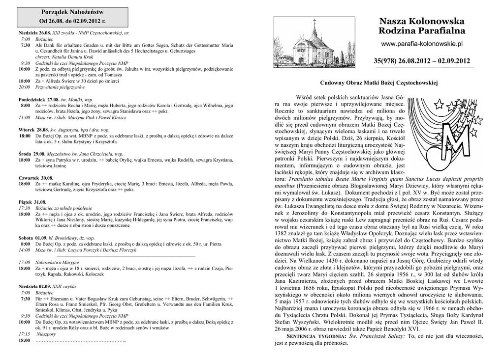 Porządek Nabożeństw Od 26.08. do 02.09.2012 r. Niedziela 26.08. XXI zwykła - NMP Częstochowskiej, ur. 7:00 Różaniec 7:30 Als Dank für erhaltene Gnaden u. mit der Bitte um Gottes Segen, Schutz der Gottesmutter Maria u. Gesundheit für Janina u. Dawid anlässlich des 5 Hochzeitstages u. Geburtstages chrzest: Natalia Danuta Kruk 9:30 Godzinki ku czci Niepokalanego Poczęcia NMP 10:00 Z podz. za odbytą pielgrzymkę do grobu św. Jakuba w int. wszystkich pielgrzymów, podziękowanie za pasterski trud i opiekę - zam. od Tomasza 18:00 Za + Alfreda Świerc w 30 dzień po śmierci 20:00 Przywitanie pielgrzymów Poniedziałek 27.08. św. Moniki, wsp 8:00 Za ++ rodziców Rocha i Marię, męża Huberta, jego rodziców Karola i Gertrudę, ojca Wilhelma, jego rodziców, brata Józefa, jego żony, szwagra Stanisława oraz ++ pokr. 11:00 Msza św. i ślub: Martyna Ptok i Paweł Kleszcz Wtorek 28.08. św. Augustyna, bpa i dra, wsp. 18:00 Do Bożej Op. za wst. MBNP z podz. za odebrane łaski, z prośbą o dalszą opiekę i zdrowie na dalsze lata z ok. 5 r. ślubu Krystyny i Krzysztofa Środa 29.08. Męczeństwo św. Jana Chrzciciela, wsp. 18:00 Za + syna Patryka w r. urodzin, ++ babcię Otylię, wujka Ernesta, wujka Rudolfa, szwagra Krystiana, teściową Janinę Czwartek 30.08. 18:00 Za ++ matkę Karolinę, ojca Fryderyka, ciocię Marię, 3 braci: Ernesta, Józefa, Alfreda, męża Pawła, teściową Gertrudę, zięcia Krzysztofa oraz ++ pokr. Piątek 31.08. 17:30 Różaniec za młode pokolenie 18:00 Za ++ męża i ojca z ok. urodzin, jego rodziców Franciszkę i Jana Świerc, brata Alfreda, rodziców Wiktorię i Jana Nieslony, siostrę Marię, kuzynkę Hildegardę, jej syna Piotra, ciocię Franciszkę, wujka oraz ++ dusze z obu stron i dusze opuszczone Sobota 01.09. bł. Bronisławy, dz. wsp. 8:00 Do Bożej Op. z podz. za odebrane łaski, z prośbą o dalszą opiekę i zdrowie z ok. 50 r. ur. Piotra 14:00 Msza św. i ślub: Lucyna Porczyk i Dariusz Florczyk —–——————————————–——————–—————— 17:00 Nabożeństwo Maryjne 18:00 Za + męża i ojca w 18 r. śmierci, rodziców, 2 braci, siostrę i jej męża Józefa, ++ z rodzin Czaja, Pietrzyk, Rąpała, Rakowski, Koloczek Niedziela 02.09. XXII zwykła 7:00 Różaniec 7:30 Für ++ Ehemann u. Vater Bogusław Kruk zum Geburtstag, seine ++ Eltern, Bruder, Schwägerin, ++ Eltern Rosa u. Franz Smieskol, Pfr. Georg Obst, Großeltern u. Verwandte aus den Familien Kruk, Smieskol, Klimas, Obst, Jendryka u. Pyka 9:30 Godzinki ku czci Niepokalanego Poczęcia NMP 10:00 Do Bożej Op. za wstawiennictwem MBNP z podz. za odebrane łaski, z prośbą o dalszą Bożą opiekę z ok. 91 r. urodzin Róży oraz o bł. Boże w rodzinach synów i wnuków 17:15 Nieszpory 18:00 ………………………………………………... Nasza Kolonowska Rodzina Parafialna www.parafia-kolonowskie.pl 35(978) 26.08.2012 – 02.09.2012 Cudowny Obraz Matki Bożej Częstochowskiej Wśród setek polskich sanktuariów Jasna Góra ma swoje pierwsze i uprzywilejowane miejsce. Rocznie to sanktuarium nawiedza od miliona do dwóch milionów pielgrzymów. Przybywają, by modlić się przed cudownym obrazem Matki Bożej Częstochowskiej, słynącym wieloma łaskami i na trwałe wpisanym w dzieje Polski. Dziś, 26 sierpnia, Kościół w naszym kraju obchodzi liturgiczną uroczystość Najświętszej Maryi Panny Częstochowskiej jako głównej patronki Polski. Pierwszym i najdawniejszym dokumentem, informującym o cudownym obrazie, jest łaciński rękopis, który znajduje się w archiwum klasztoru: Translatio tabulae Beate Marie Virginis quam Sanctus Lucas depinxit propriis manibus (Przeniesienie obrazu Błogosławionej Maryi Dziewicy, który własnymi rękami wymalował św. Łukasz). Dokument pochodzi z I poł. XV w. Być może został przepisany z dokumentu wcześniejszego. Tradycja głosi, że obraz został namalowany przez św. Łukasza Ewangelistę na desce stołu z domu Świętej Rodziny w Nazarecie. Wizerunek z Jerozolimy do Konstantynopola miał przewieźć cesarz Konstantyn. Służący w wojsku cesarskim książę ruski Lew zapragnął przenieść obraz na Ruś. Cesarz podarował mu wizerunek i od tego czasu obraz otaczany był na Rusi wielką czcią. W roku 1382 znalazł go tam książę Władysław Opolczyk. Doznając wielu łask przez wstawiennictwo Matki Bożej, książę zabrał obraz i przywiózł do Częstochowy. Bardzo szybko do obrazu zaczęli przybywać pierwsi pielgrzymi, którzy dzięki modlitwie do Maryi doznawali wielu łask. Z czasem zaczęli tu przynosić swoje wota. Przyciągnęły one złodziei. Na Wielkanoc 1430 r. dokonano napaści na Jasną Górę. Grabieżcy odarli wtedy cudowny obraz ze złota i klejnotów, którymi przyozdobili go pobożni pielgrzymi, oraz przecięli twarz Maryi cięciem szabli. 26 sierpnia 1956 r., w 300 lat od ślubów króla Jana Kazimierza, złożonych przed obrazem Matki Boskiej Łaskawej we Lwowie 1 kwietnia 1656 roku, Episkopat Polski pod nieobecność uwięzionego Prymasa Wyszyńskiego w obecności około miliona wiernych odnowił uroczyście te ślubowania. 5 maja 1957 r. odnowienie tych ślubów odbyło się we wszystkich kościołach polskich. Najbardziej znana i uroczysta koronacja obrazu odbyła się w 1966 r. w ramach obchodu Tysiąclecia Chrztu Polski. Dokonał jej Prymas Tysiąclecia, Sługa Boży Kardynał Stefan Wyszyński. Wielokrotnie modlił się przed nim Ojciec Święty Jan Paweł II. 26 maja 2006 r. obraz nawiedził także Papież Benedykt XVI. SENTENCJA TYGODNIA: Św. Franciszek Salezy: To, co nie jest dla wieczności, jest z pewnością dla próżności. 35/2012 „Ludzie dzielą się na tych, którzy lubią chodzić, i na tych, którzy o tym nie wiedzą”. O człowieku współczesnym można powiedzieć, że jest w drodze, ciągłej drodze. Wystarczy przejechać się autostradą w zachodnim kraju lub drogą w Polsce. Wystarczy zajrzeć na dworzec autobusowy czy k