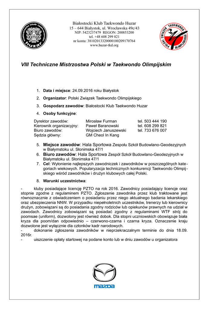 Białostocki Klub Taekwondo Huzar 15 – 644 Białystok, ul. Wrocławska 49c/43 NIP: 5423237479 REGON: 200853200 tel. +48 608 299 821 nr konta: 38102013320000100209170764 www.huzar-tkd.org VIII Techniczne Mistrzostwa Polski w Taekwondo Olimpijskim 1. Data i miejsce: 24.09.2016 roku Białystok 2. Organizator: Polski Związek Taekwondo Olimpijskiego 3. Gospodarz zawodów: Białostocki Klub Taekwondo Huzar 4. Osoby funkcyjne: Dyrektor zawodów: Kierownik organizacyjny: Biuro zawodów: Sędzia główny: Mirosław Furman Paweł Baranowski Wojciech Januszewski GM Cheol In Kang tel. 503 444 190 tel. 608 299 821 tel. 733 676 007 5. Miejsce zawodów: Hala Sportowa Zespołu Szkół Budowlano-Geodezyjnych w Białymstoku ul. Słonimska 47/1 6. Biuro zawodów: Hala Sportowa Zespół Szkół Budowlano-Geodezyjnych w Białymstoku ul. Słonimska 47/1 7. Cel: Wyłonienie najlepszych zawodniczek i zawodników w poszczególnych kate goriach wiekowych. Popularyzacja technicznych konkurencji Taekwondo Olimpij skiego wśród zawodników i drużyn klubowych całej Polski. 8. Warunki uczestnictwa: kluby posiadające licencję PZTO na rok 2016. Zawodnicy posiadający licencje oraz stopnie zgodne z regulaminem PZTO. Zgłoszenie zawodnika przez klub traktowane jest równoznacznie z oświadczeniem o posiadaniu przez niego aktualnego badania lekarskiego oraz ubezpieczenia NNW. W przypadku niepełnoletnich uczestników, trenerzy lub kierownicy drużyn, zobowiązani są do posiadania zgodny rodziców lub opiekunów prawnych na udział w zawodach. Zawodnicy zobowiązani są posiadać zgodny z regulaminami WTF strój do poomsae (uniform), dozwolony jest również dobok. Dla stopni uczniowskich obowiązuje biała kryza dla poom/dan odpowiednio – czerwono-czarna i czarna kryza. Oznaczenie kraju dozwolone jest wyłącznie dla członków kadr narodowych. dokonanie zgłoszenia zawodników w nieprzekraczalnym terminie do dnia 18.09. 2016r. uiszczenie opłaty startowej na podane konto lub w dniu zawodów u organizatora Białostocki Klub Taekwondo Huzar 15 – 644 Białystok, ul. Wrocławska 49c/43 NIP: 5423237479 REGON: 200853200 tel. +48 608 299 821 nr konta: 38102013320000100209170764 www.huzar-tkd.org Uwaga!!! Wszystkie formalności dotyczące rejestracji, stopni i licencji można uzupełniać tylko do dnia 18.09.2016 roku do godz. 24.00 9. Konkurencje: - poomsae indywidualne WTF poomsae indywidualne WTF osób niepełnosprawnych (w stopniu lekkim) poomsae synchroniczne par Kategorie wiekowe poomsae indywidualne WTF: - Junior Młodzieżowiec Senior I Senior II Senior III Osoby niepełnosprawne 15 – 17 lat 18 – 21 lat 22 – 29 lat 30 – 39 lat 40 lat i więcej do 25 lat 26 – 39 lat 40 lat i więcej Kategorie wiekowe poomsae synchroniczne par : - Junior – Senior III 15 – 40+ lat 10. Opłaty: Opłata startowa wynosi 60 zł od osoby uczestniczącej w konkurencji indywidualnej oraz 60 zł od pary synchronicznej. Opłaty należy wnosić na konto Białostockiego Klubu Taekwondo Huzar do dnia 23.09.2016r. (po tym terminie opłata dodatkowa 10 zł od zawodnika). Numer konta: 38102013320000100209170764 ul. Wrocławska 49c/43 15-644 Białystok Tytuł wpłaty: „nazwa klubu – wpisowe VIIITMP” Dowód wpłaty należy okazać podczas rejestracji w biurze zawodów. W uzasadnionych przypadkach możliwe będzie dokonanie opłaty startowej w biurze zawodów podczas rejestracji. Białostocki Klub Taekwondo Huzar 15 – 644 Białystok, ul. Wrocławska 49c/43 NIP: 5423237479 REGON: 200853200 tel. +48 608 299 821 nr konta: 38102013320000100209170764 www.huzar-tkd.org 11. Zgłoszenia: Zgłoszenia zawodników kluby dokonują elektronicznie, za pośrednictwem Internetu, wysyłając formularz zgłoszeniowy, będący załącznikiem do niniejszego regulaminu, na adres: [email protected] – ostatecznie do dnia 18.09.2016 roku do godz. 24.00. Kluby zgłaszające zawodników niepełnosprawnych powinni posiadać również zaświadczenie o posiadanym stopniu niepełnosprawności swoich zawodników. Kierownik drużyny zobowiązany jest dostarczyć oryginał zgłoszenia (podpisany przez prawnego przedstawiciela klubu) oraz potwierdzenie dokonania opłaty w biurze zawodów, podczas rejestracji. 12. Nagrody: w pkt. 9 kobiet. Medale i puchary za miejsca 1 – 3 w konkurencjach określonych Puchary dla najlepszego technika w kategorii mężczyzn i kategorii 13. Program Zawodów 24.09.2015 – sobota - Rejestracja - Godz. 8.00 – 9.00 - Konkurencje Indywidualne i Par Synchronicznych Poomsae (Taekwondo Mazda Cup) rundy I, II i III - Godz. 9.15 - Oficjalne rozpoczęcie zawodów - Godz. 12.00 - 12.30 - Konkurencje Indywidualne i Par Synchronicznych Poomsae (VIII Techniczne Mistrzostwa Polski) - Godz. 13.00 - Zakończenie zawodów - Godz.17.30 Biuro VIII Technicznych Mistrzostw Polski Białostocki Klub Taekwondo Huzar 15 – 644 Białystok, ul. Wrocławska 49c/43 NIP: 5423237479 REGON: 200853200 tel. +48 608 299 821 nr konta: 38102013320000100209170764 www.huzar-tkd.org