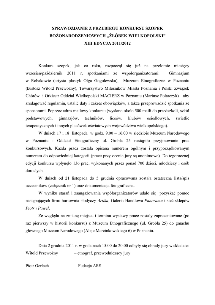 SPRAWOZDANIE Z PRZEBIEGU KONKURSU SZOPEK BOŻONARODZENIOWYCH „ŻŁÓBEK WIELKOPOLSKI” XIII EDYCJA 2011/2012 Konkurs szopek, jak co roku, rozpoczął się już na przełomie miesięcy wrzesień/październik 2011 r. spotkaniami ze współorganizatorami: w Robakowie (artysta plastyk Olga Gogolewska), Gimnazjum Muzeum Etnograficzne w Poznaniu (kustosz Witold Przewoźny), Towarzystwo Miłośników Miasta Poznania i Polski Związek Chórów i Orkiestr Oddział Wielkopolski MACIERZ w Poznaniu (Mariusz Polarczyk) aby zredagować regulamin, ustalić daty i zakres obowiązków, a także przeprowadzić spotkania ze sponsorami. Poprzez adres mailowy konkursu (wysłano około 500 maili do przedszkoli, szkół podstawowych, gimnazjów, techników, liceów, klubów osiedlowych, świetlic terapeutycznych i innych placówek oświatowych województwa wielkopolskiego). W dniach 17 i 18 listopada w godz. 9.00 – 16.00 w siedzibie Muzeum Narodowego w Poznaniu - Oddział Etnograficzny ul. Grobla 25 nastąpiło przyjmowanie prac konkursowych. Każda praca została opisana numerem ogólnym i przyporządkowanym numerem do odpowiedniej kategorii (prace przy ocenie jury są anonimowe). Do tegorocznej edycji konkursu wpłynęło 136 prac, wykonanych przez ponad 700 dzieci, młodzieży i osób dorosłych. W dniach od 21 listopada do 5 grudnia opracowana została ostateczna lista/spis uczestników (załącznik nr 1) oraz dokumentacja fotograficzna. W wyniku starań i zaangażowania współorganizatorów udało się pozyskać pomoc następujących firm: hurtownia słodyczy Artika, Galeria Handlowa Panorama i sieć sklepów Piotr i Paweł. Ze względu na zmianę miejsca i terminu wystawy prace zostały zaprezentowane (po raz pierwszy w historii konkursu) z Muzeum Etnograficznego (ul. Grobla 25) do gmachu głównego Muzeum Narodowego (Aleje Marcinkowskiego 6) w Poznaniu. Dnia 2 grudnia 2011 r. w godzinach 15.00 do 20.00 odbyły się obrady jury w składzie: Witold Przewoźny – etnograf, przewodniczący jury Piotr Gerlach – Fudacja ARS Mariusz Polarczyk – Towarzystwo Miłośników Miasta Poznania Olga Gogolewska – artysta plastyk, pedagog Jury oceniło i przyznało 31 wyróżnień (prace wykonane przez 197 osób) i 27 nagród (prace wykonane przez 295 osób) we wszystkich kategoriach. Ogółem nagrodzono 492osoby Prace konkursowe oceniane były według numerów, anonimowo. 10 grudnia 2011r. o godzinie 12.00 odbyło się uroczyste otwarcie wystawy oraz uhonorowanie nagrodzonych uczestników konkursu. Dnia 14 stycznia 2012r. odbyło się rozdanie nagrody publiczności, która co roku wyłaniana jest poprzez głosowanie zwiedzających wystawę. Nagrodę publiczności w XIII. edycji konkursu otrzymała szopka z nr 46 – Emilia Nowak z rodzicami. Nagrodzeni otrzymali dyplom wraz z upominkami w postaci książek, albumów, słodyczy, bonów podarunkowych.